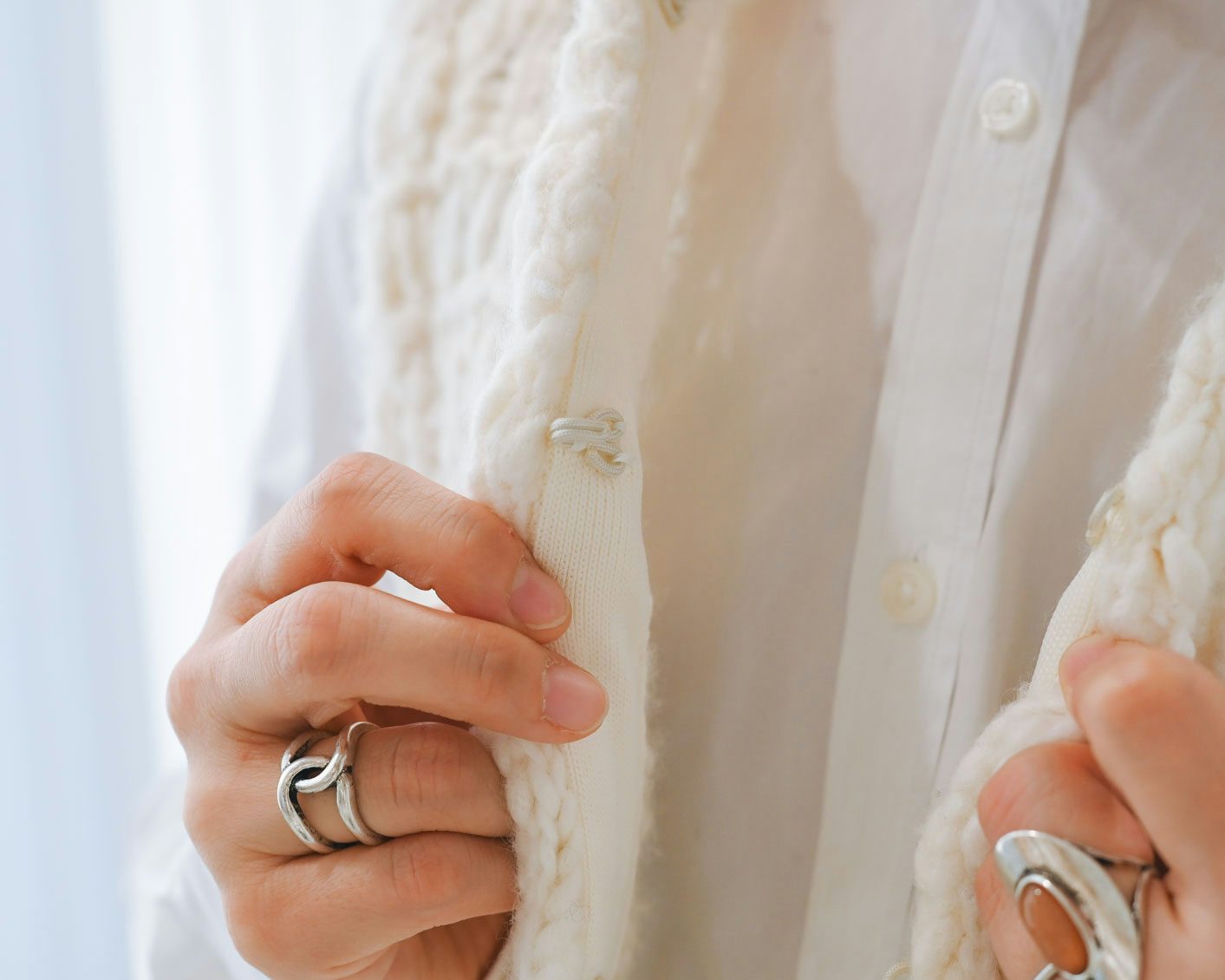 編み地が華やかなので、ネックレスなど色々付けなくても "いつものニットとデニム" がぐっとおしゃれになるのが嬉しいです。