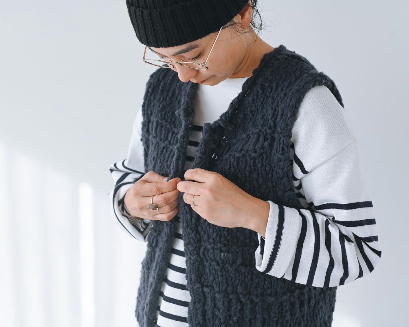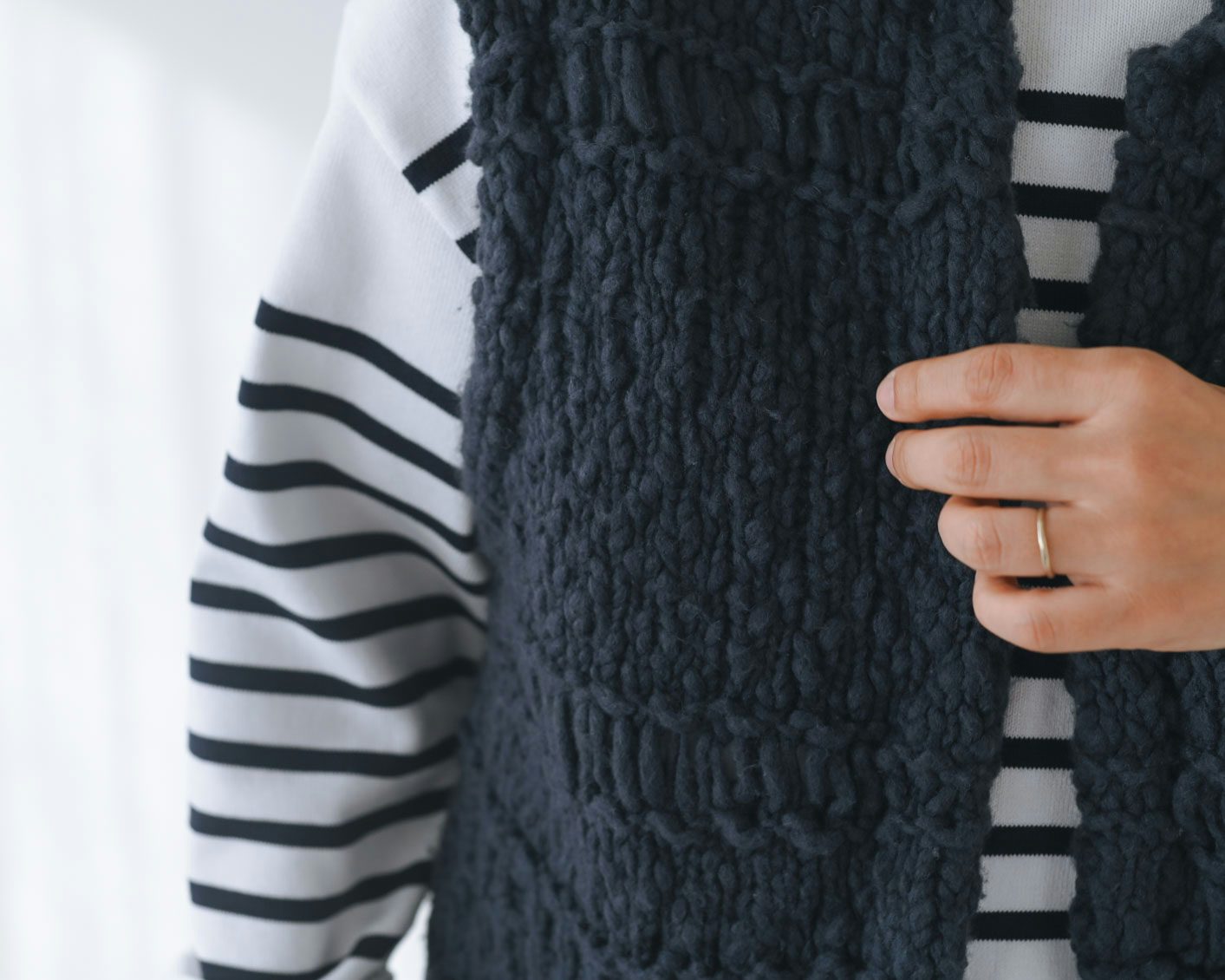 編み地は華やかですが一色の糸でできているので、ボーダーなど柄と合わせてもケンカせずコーディネートしやすいです」