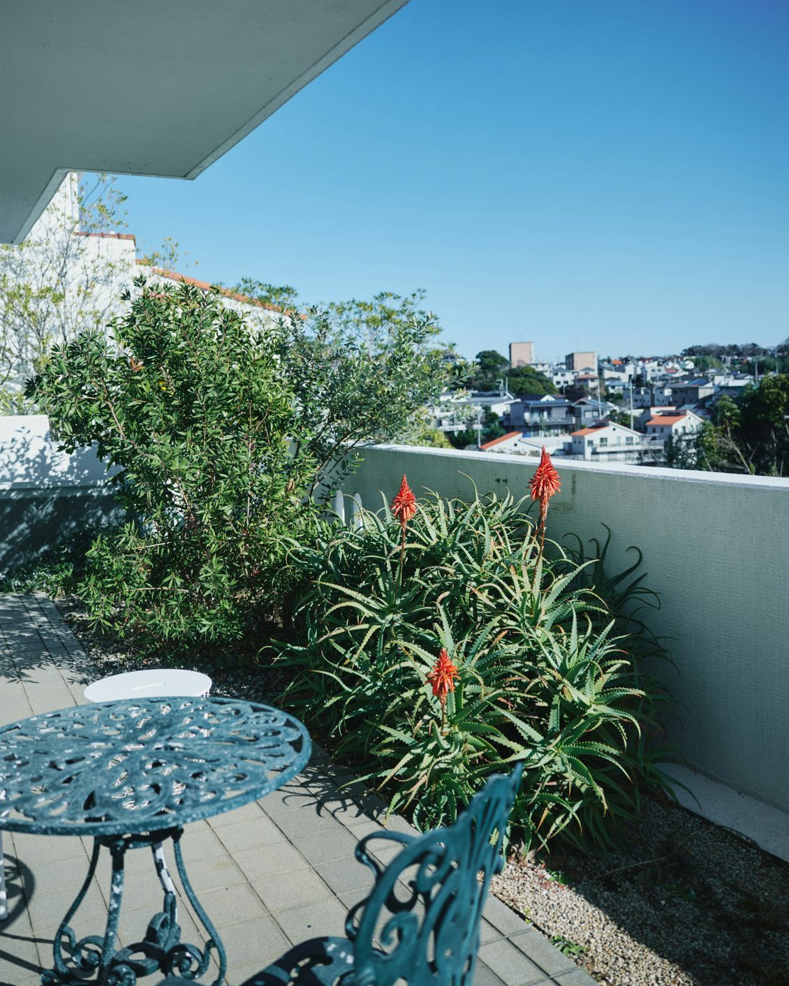 白い壁が眩しい、高台に立つマンション。海の風が草木を揺らし、かつて訪れた断崖絶壁のイタリアの島が想起され、リゾート気分に。自転車で「レンバイ」こと鎌倉市農協連即売所で買い物を済ませたTさんが出迎えてくれました。