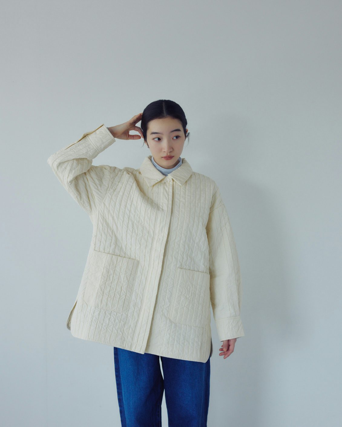 中綿は、あえて薄手に。軽さとすっきりした見た目を大切にしながら、必要なあたたかさだけを残すよう、量を調整しました。