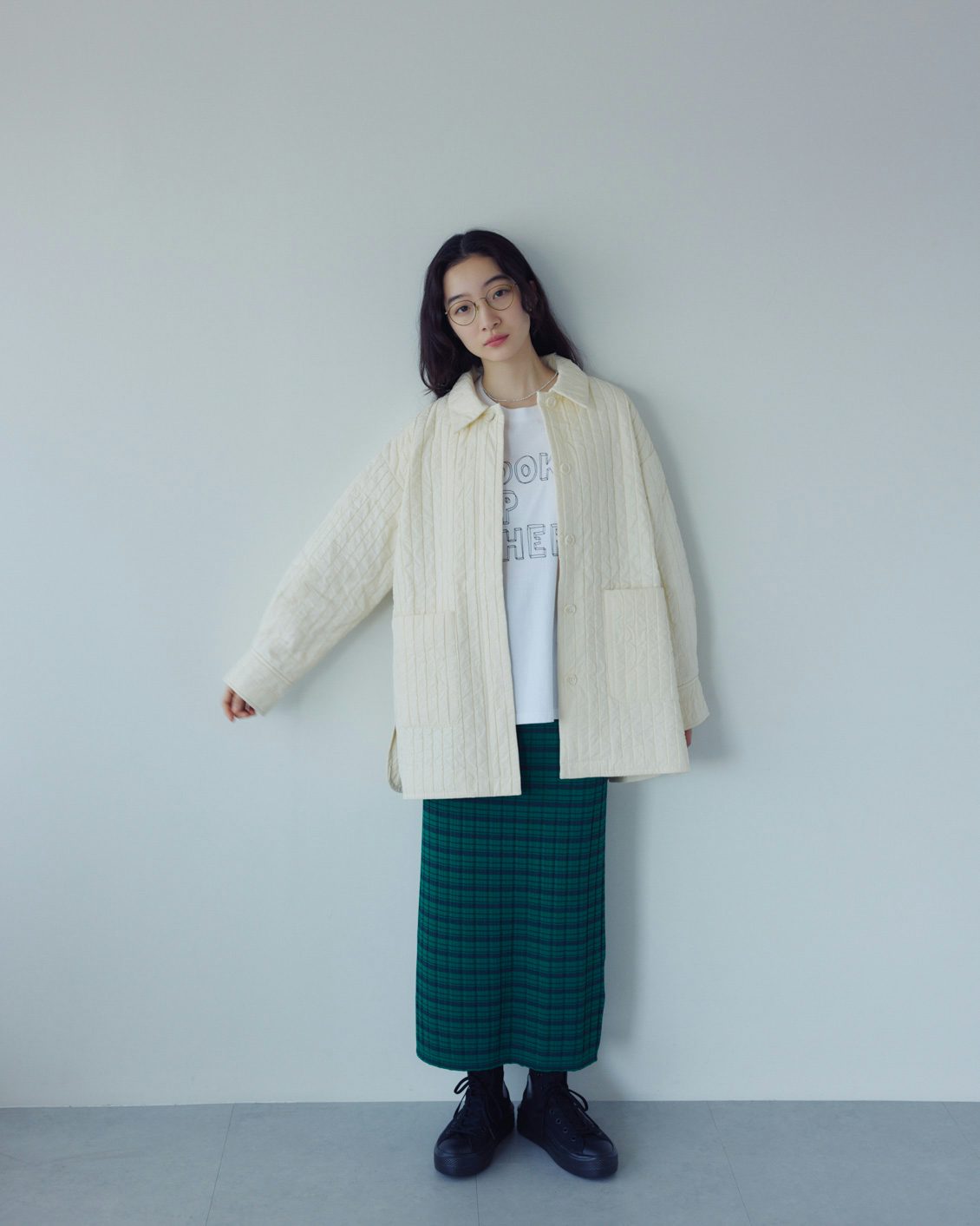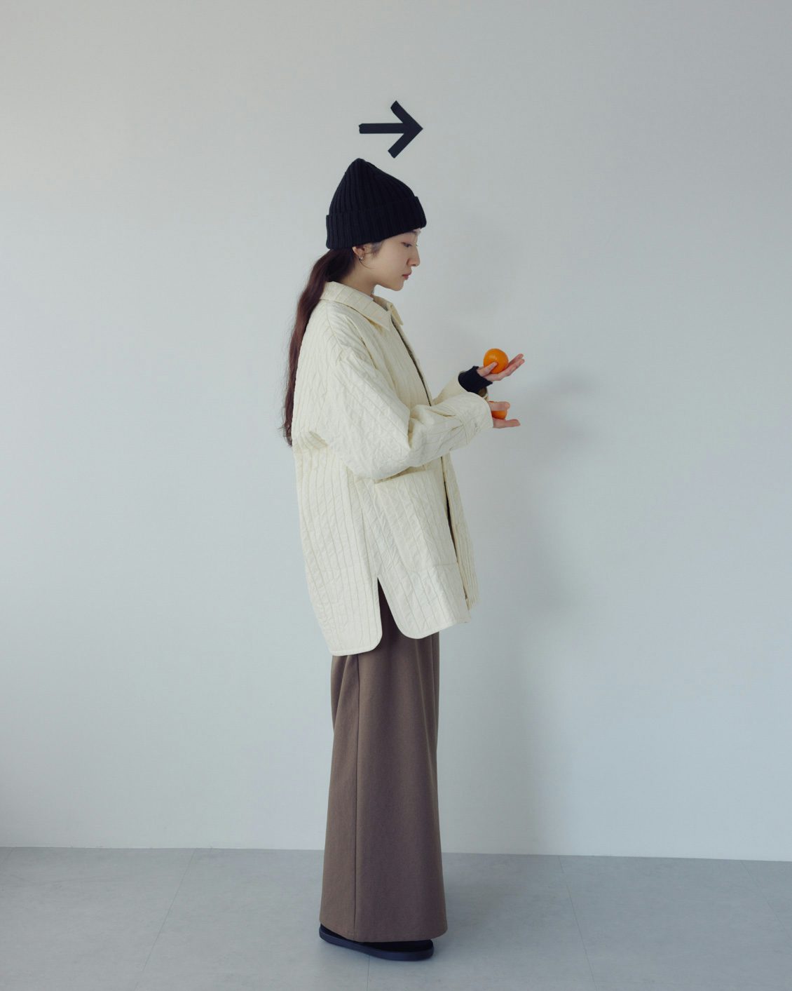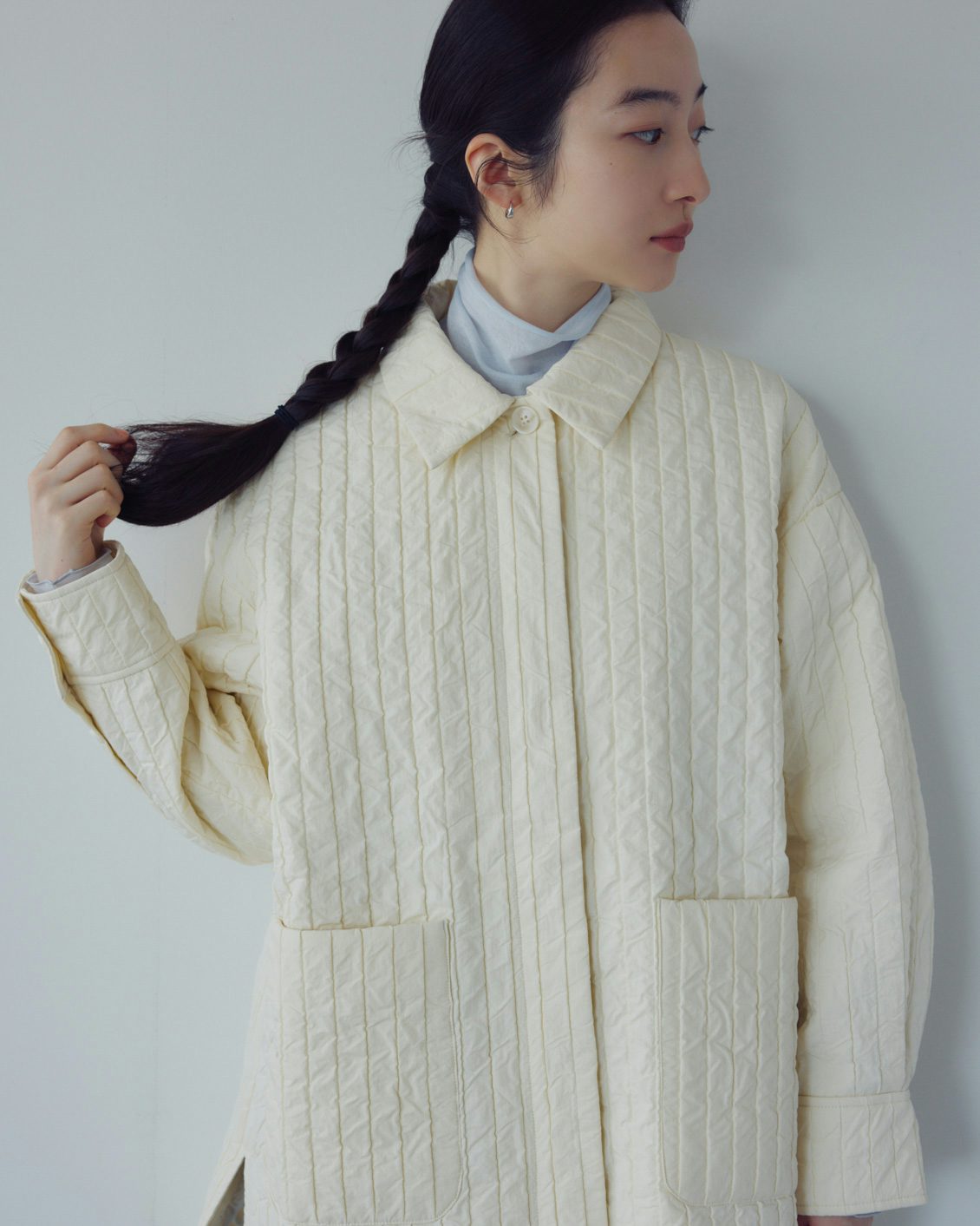 全体は、ミドル丈のボックスシルエット。ヒップまわりが自然に隠れる安心感がありつつ、重たく見えないバランスに仕上げています。