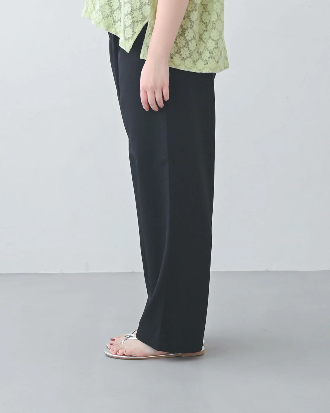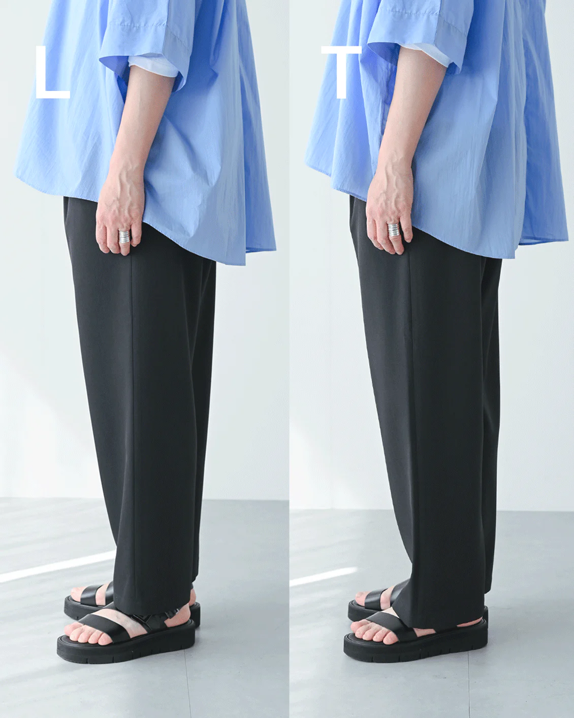 ストンと落ち感があって、スマートなシルエットですね。すっきりはけるのに、ウエストにはゆとりがあって締め付け感もなく快適です」