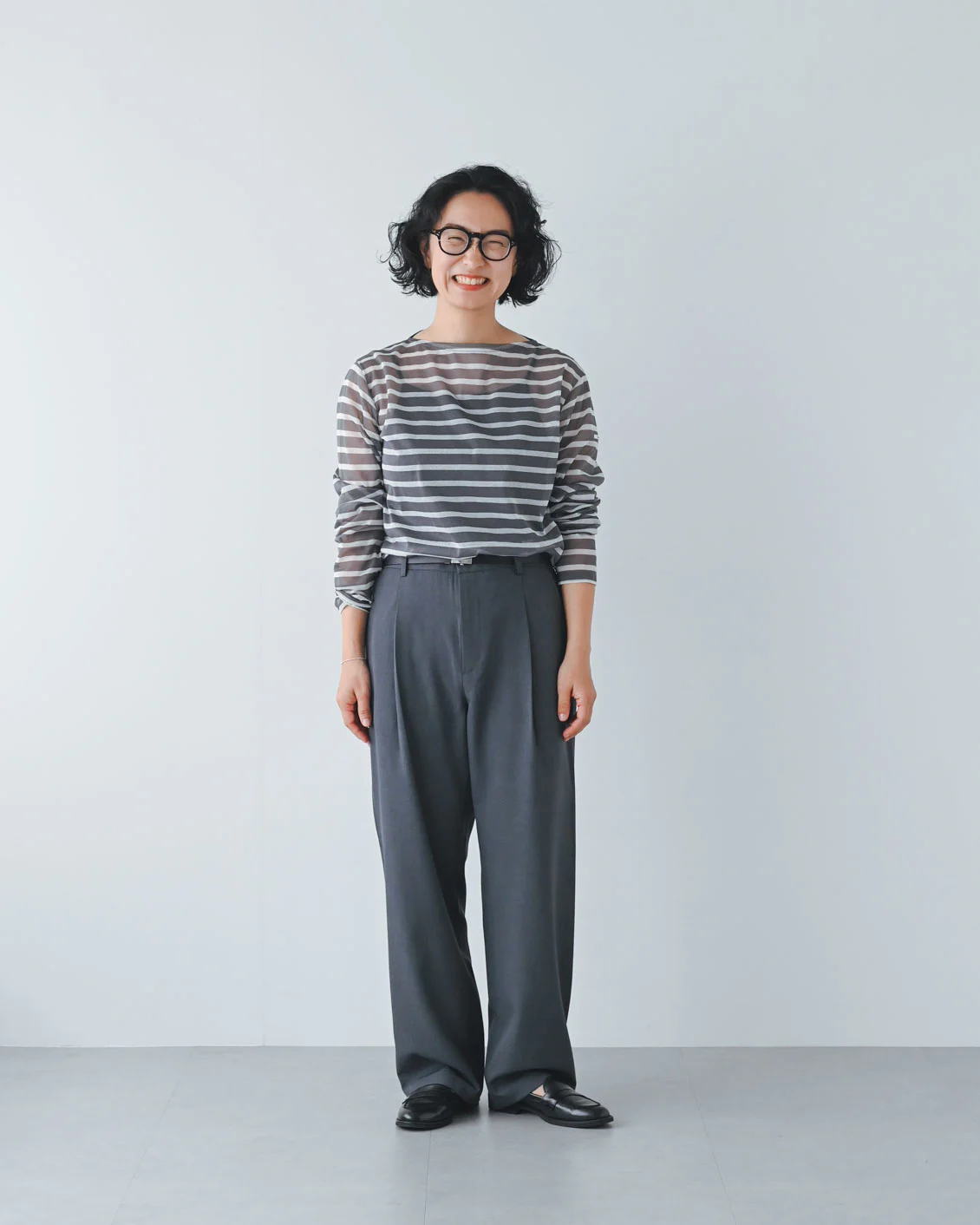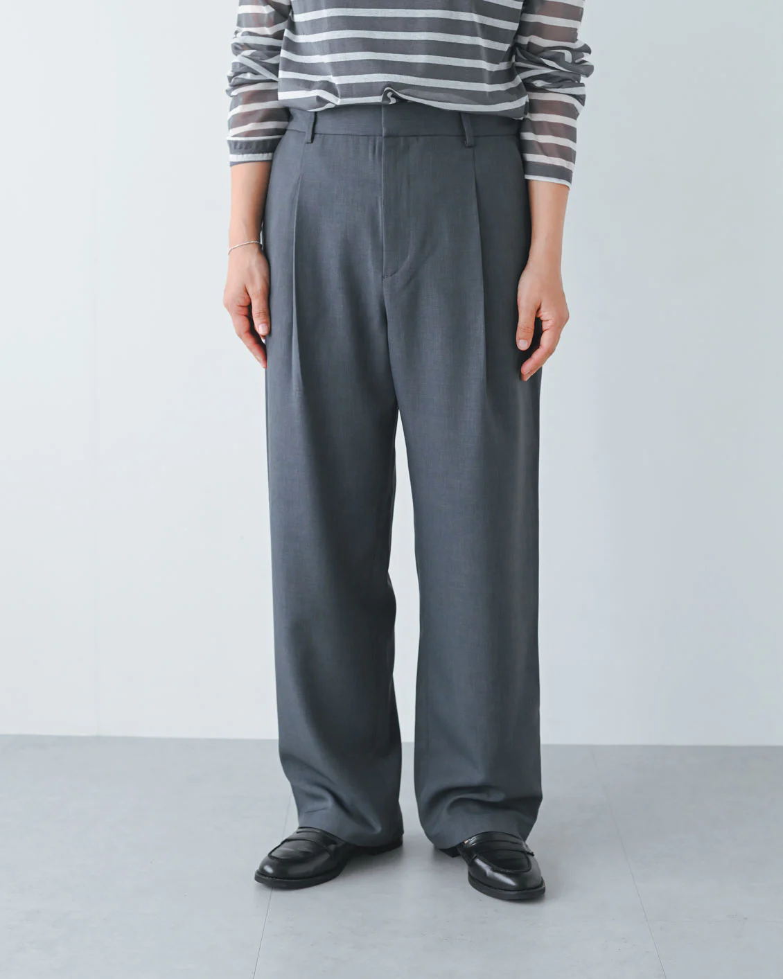 「普段は黒いパンツばかり選んでしまうのですが、夏に黒は少し重く感じるときもあって。かといって明るい色はコーディネートが難しいかな……と思っていたところに、この杢チャコールはまさに欲しかった色!