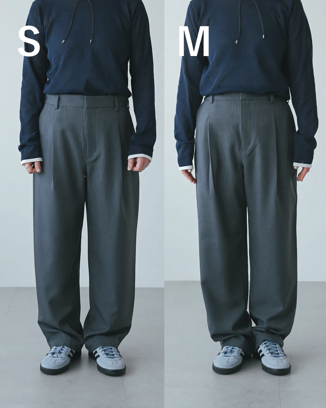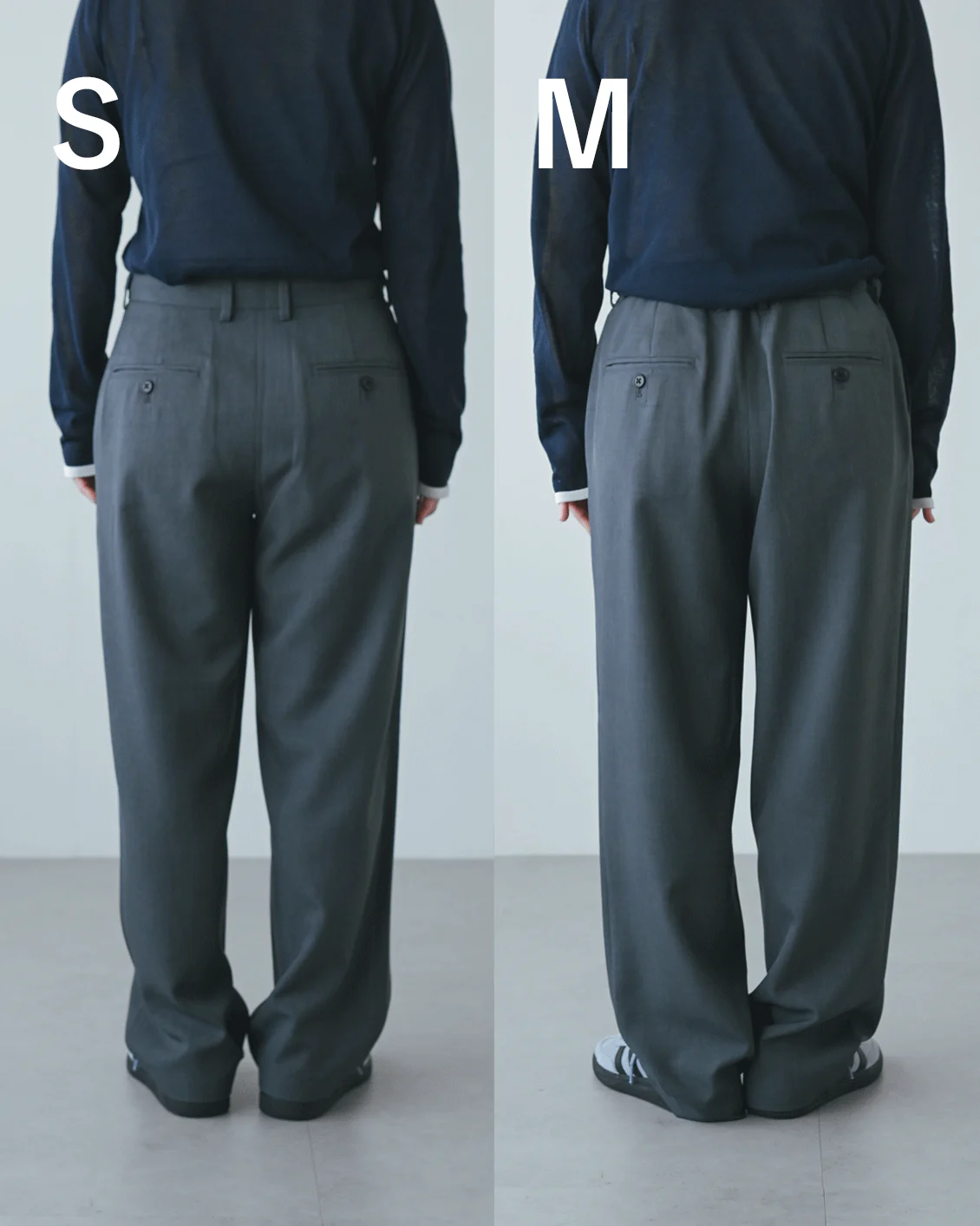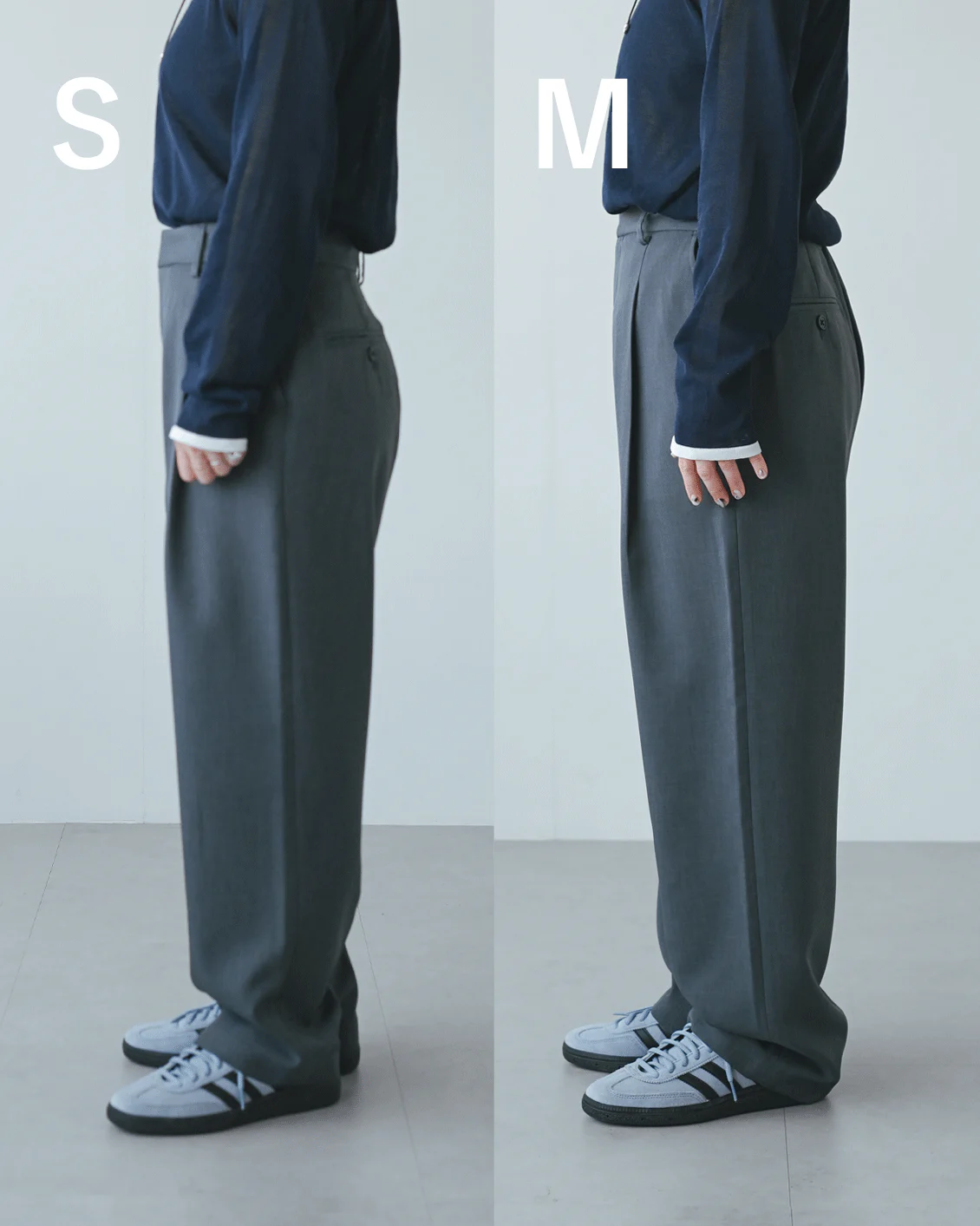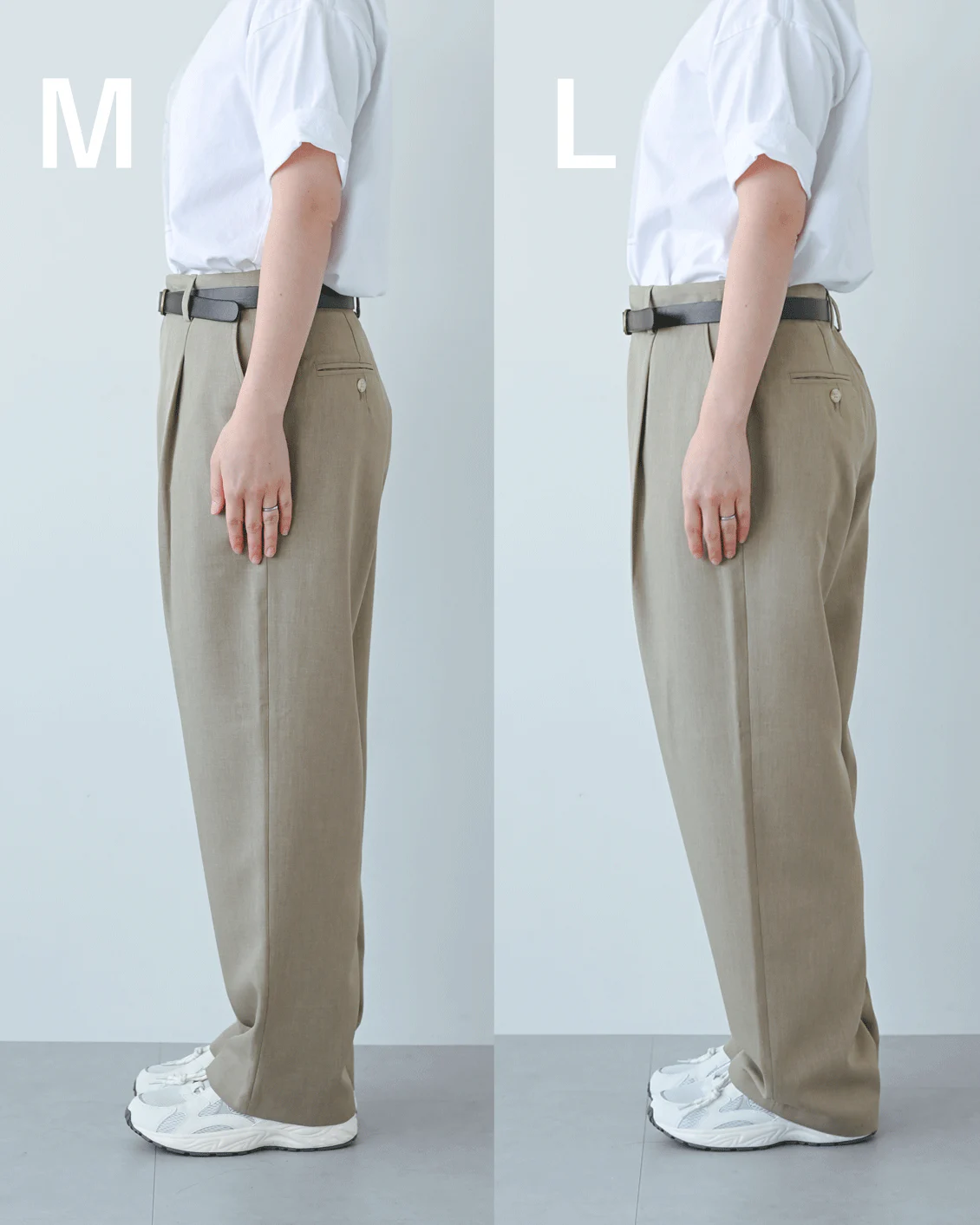 普段ボトムスのサイズ選びは、快適さと見た目の綺麗さの狭間で悩みがち。当店のボトムスはMサイズを選ぶことが多い。