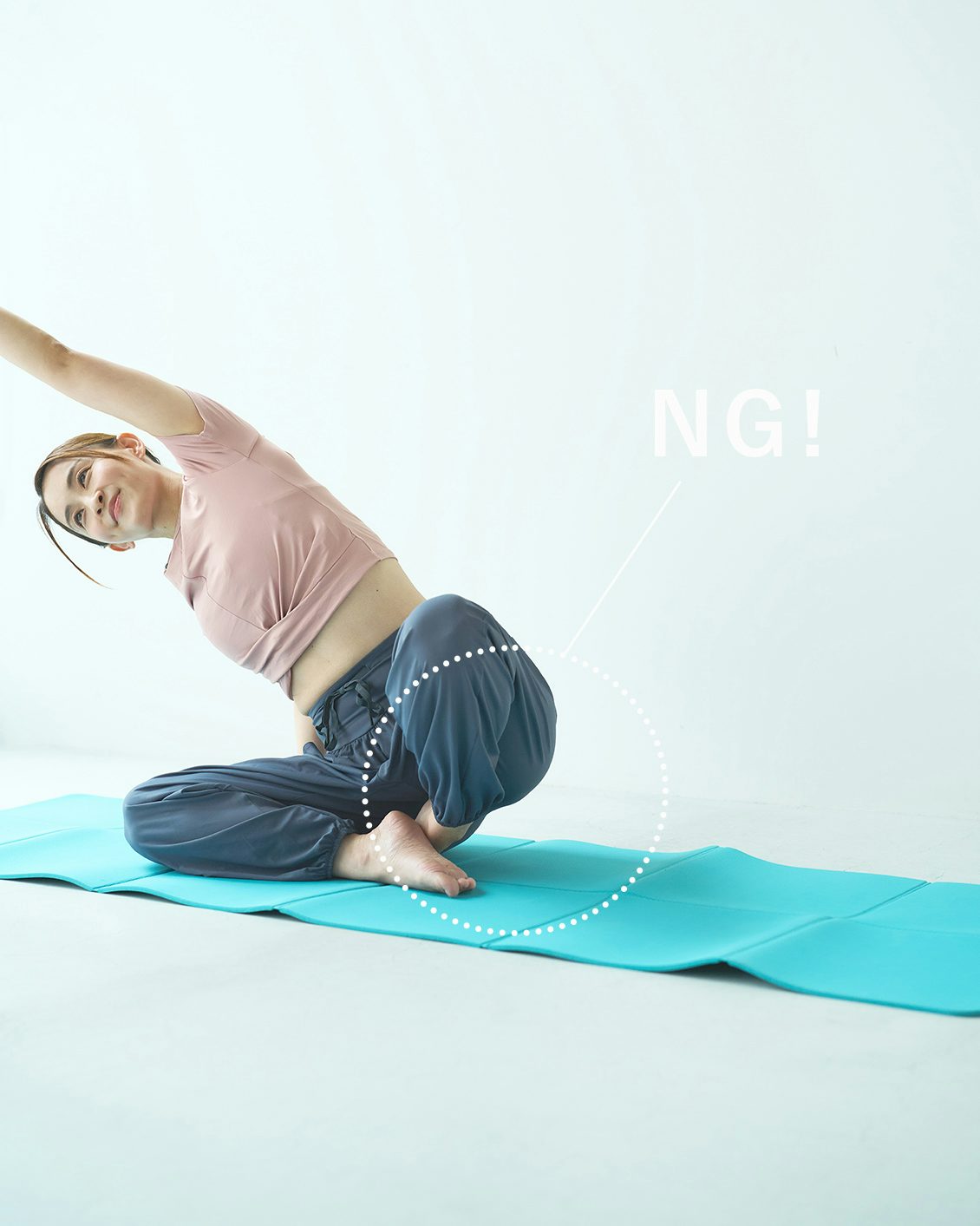 身体をぎゅっと伸ばすときは、お尻が浮かないように注意。お尻が浮いてしまうとストレッチの効果があまり得られなくなってしまいます。