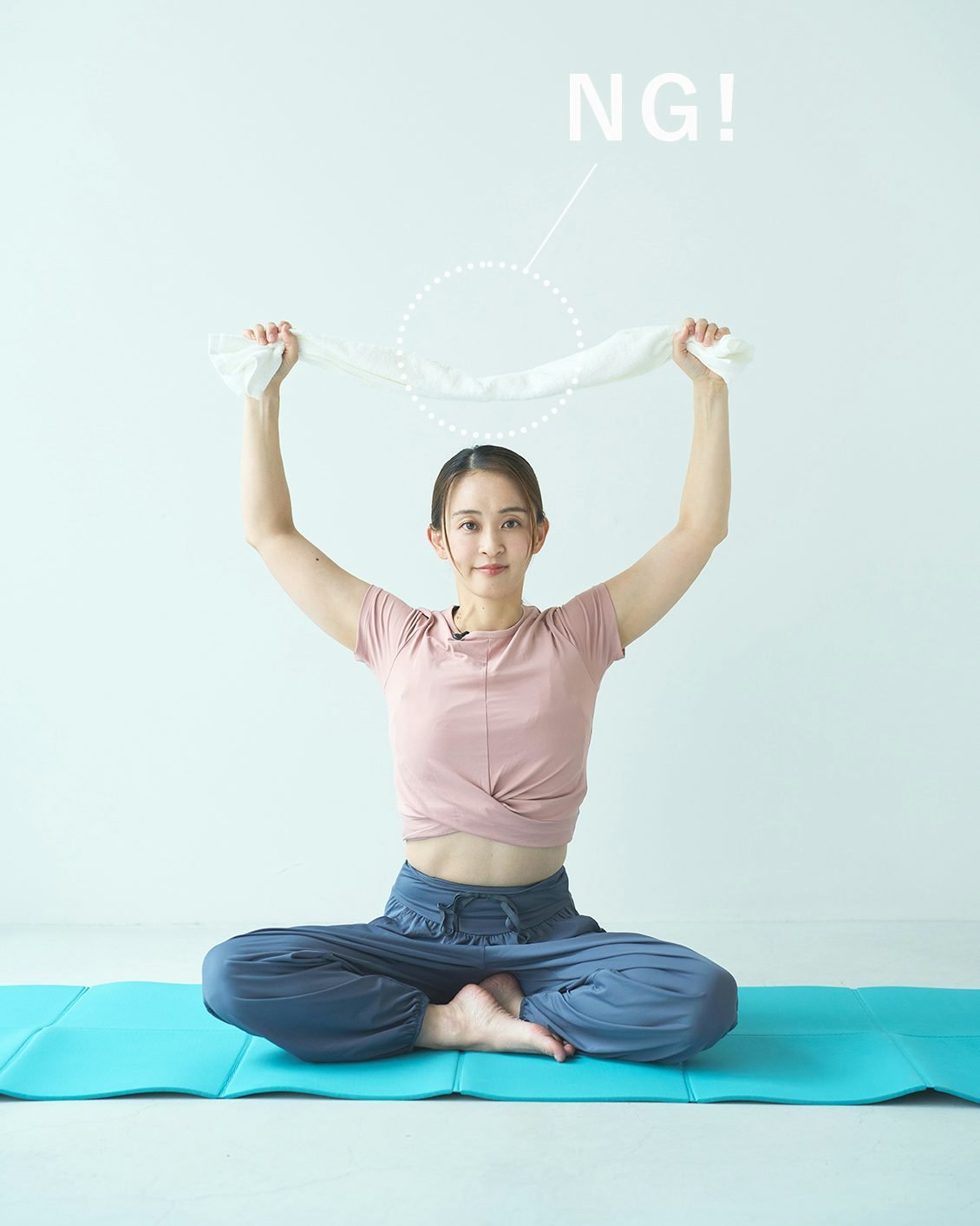 タオルがたゆまないように、ピンと伸ばして腕を上げ下げしてください◎ 顔の向きは、正面がベストです。
