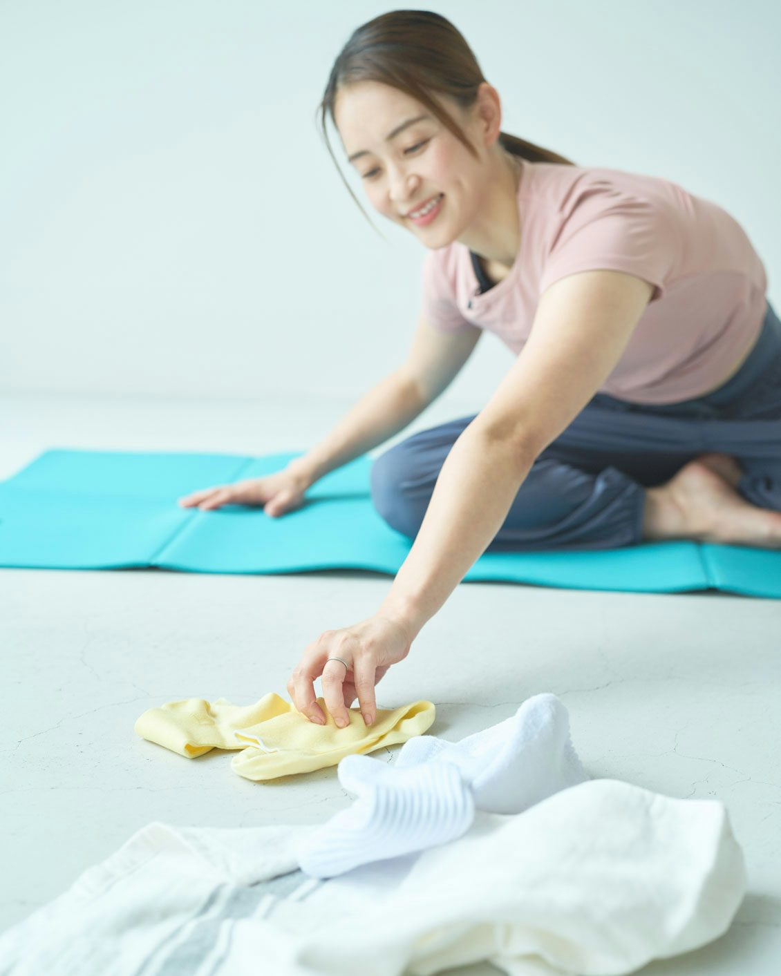 「まずは家事をしながらできるストレッチです。たとえば洗濯物を畳みながら、 あぐらをかいた状態で、身体を斜めにぎゅっと伸ばす。フェイスタオルを持って、腕を上下に動かすのもいいですね。