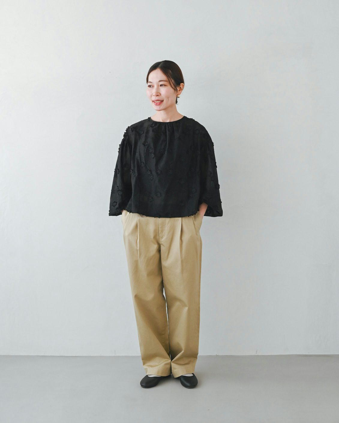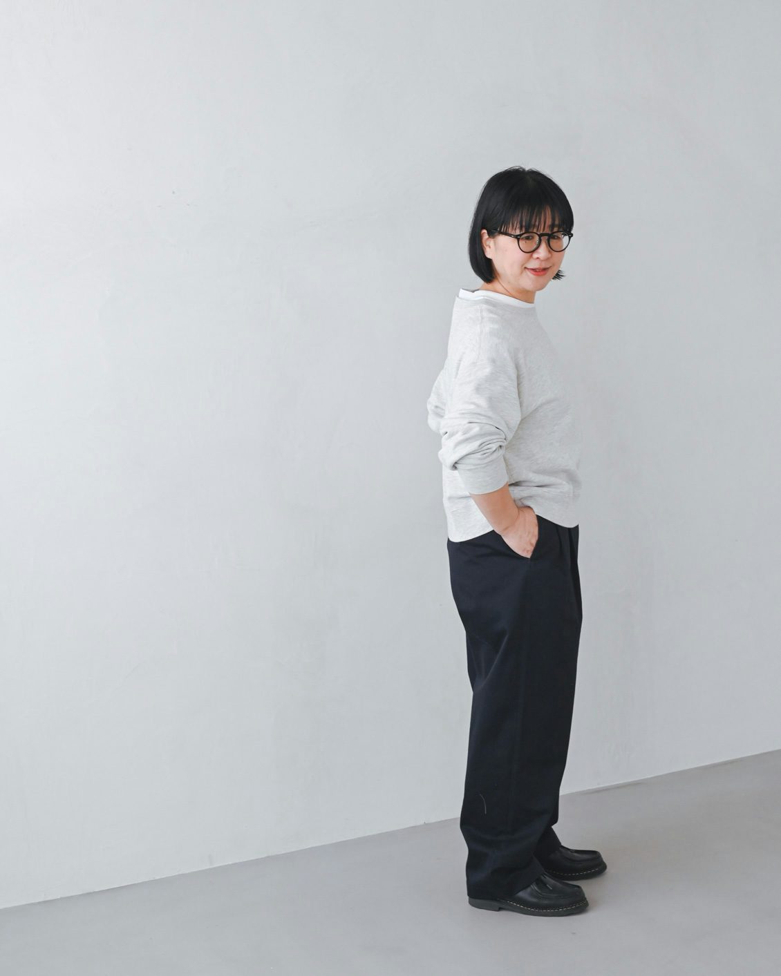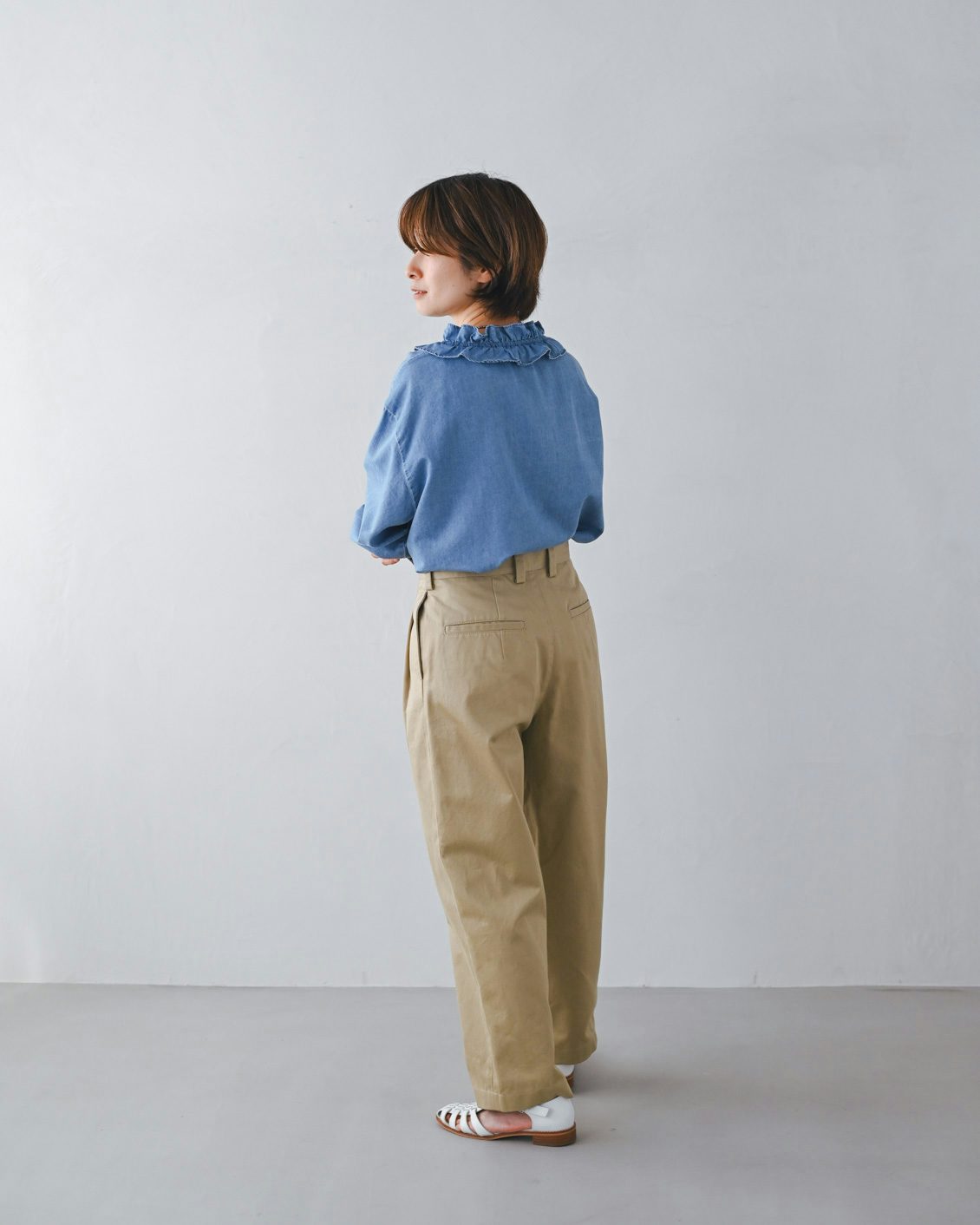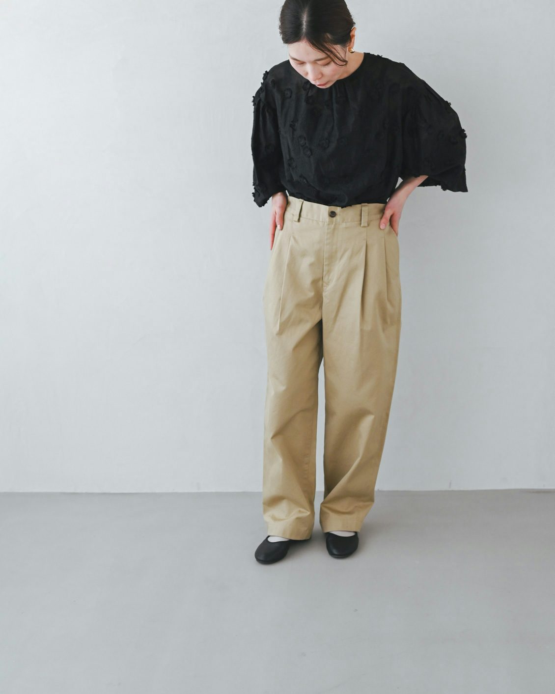 「いつもは、くたっとした柔らかな素材の服を選ぶことが多いのですが、このパンツは生地に適度な張り感があるおかげで、穿くだけでなんだかシュッと見えるのが嬉しいです。どこか『かっこいい人』になったような気分になりました。