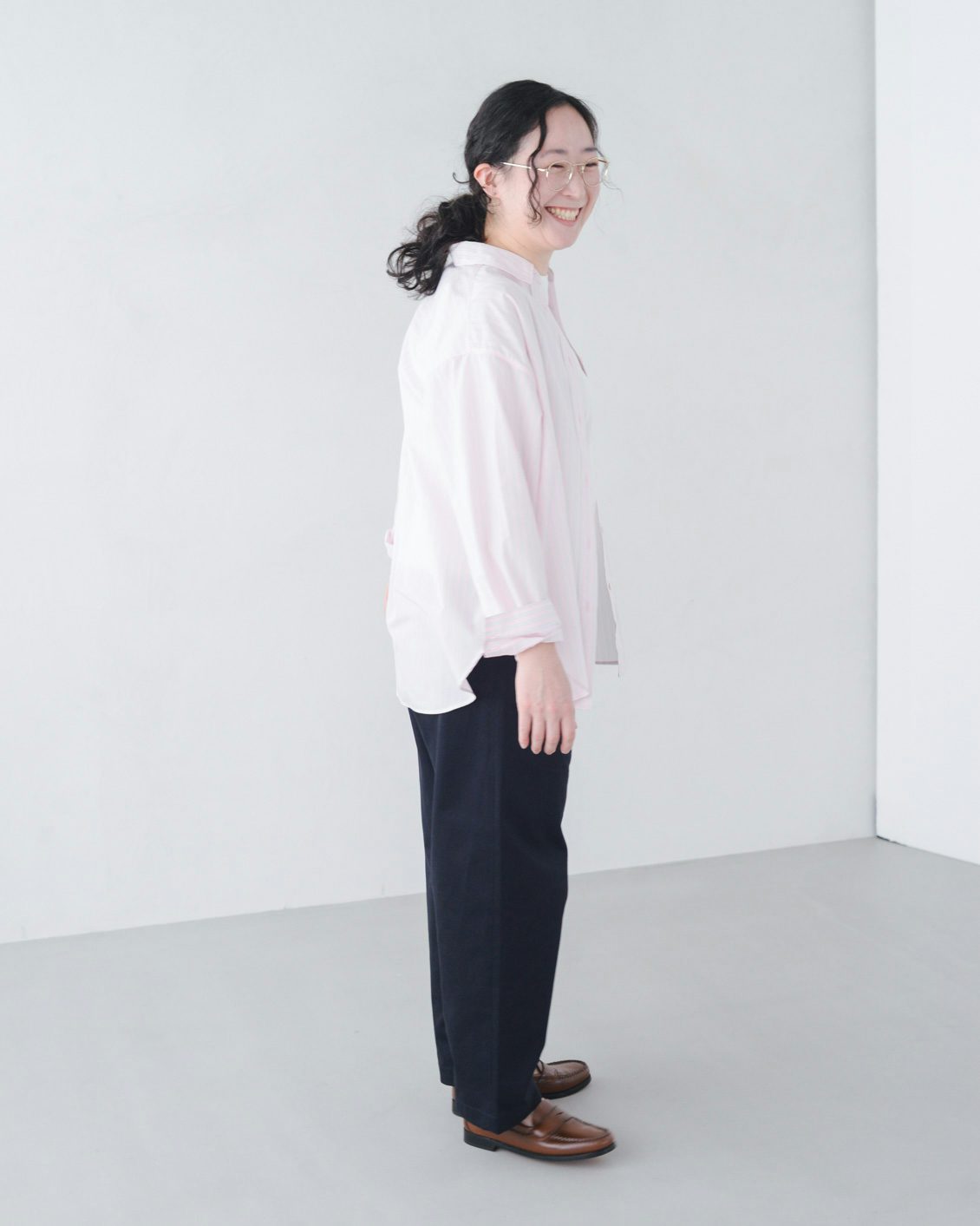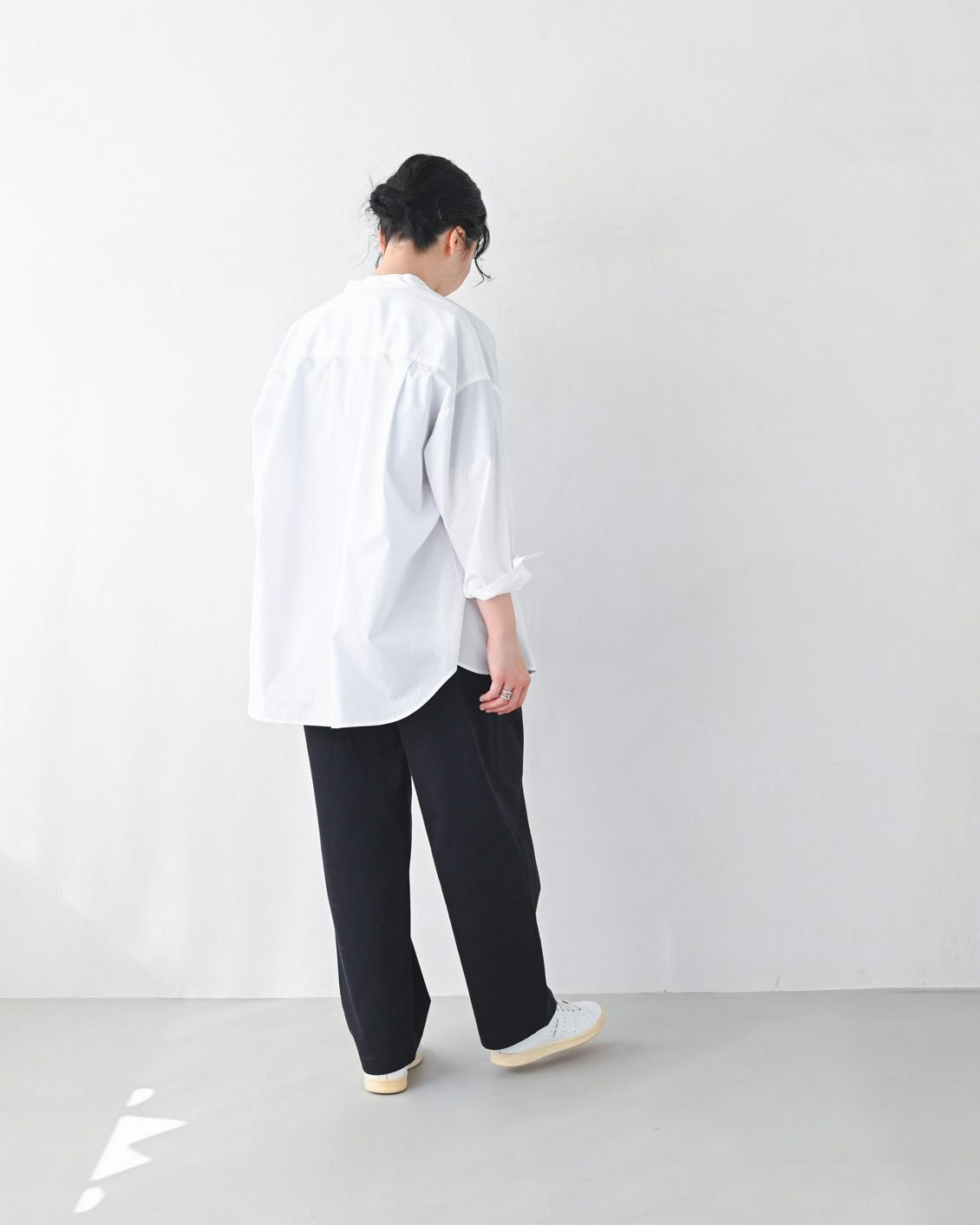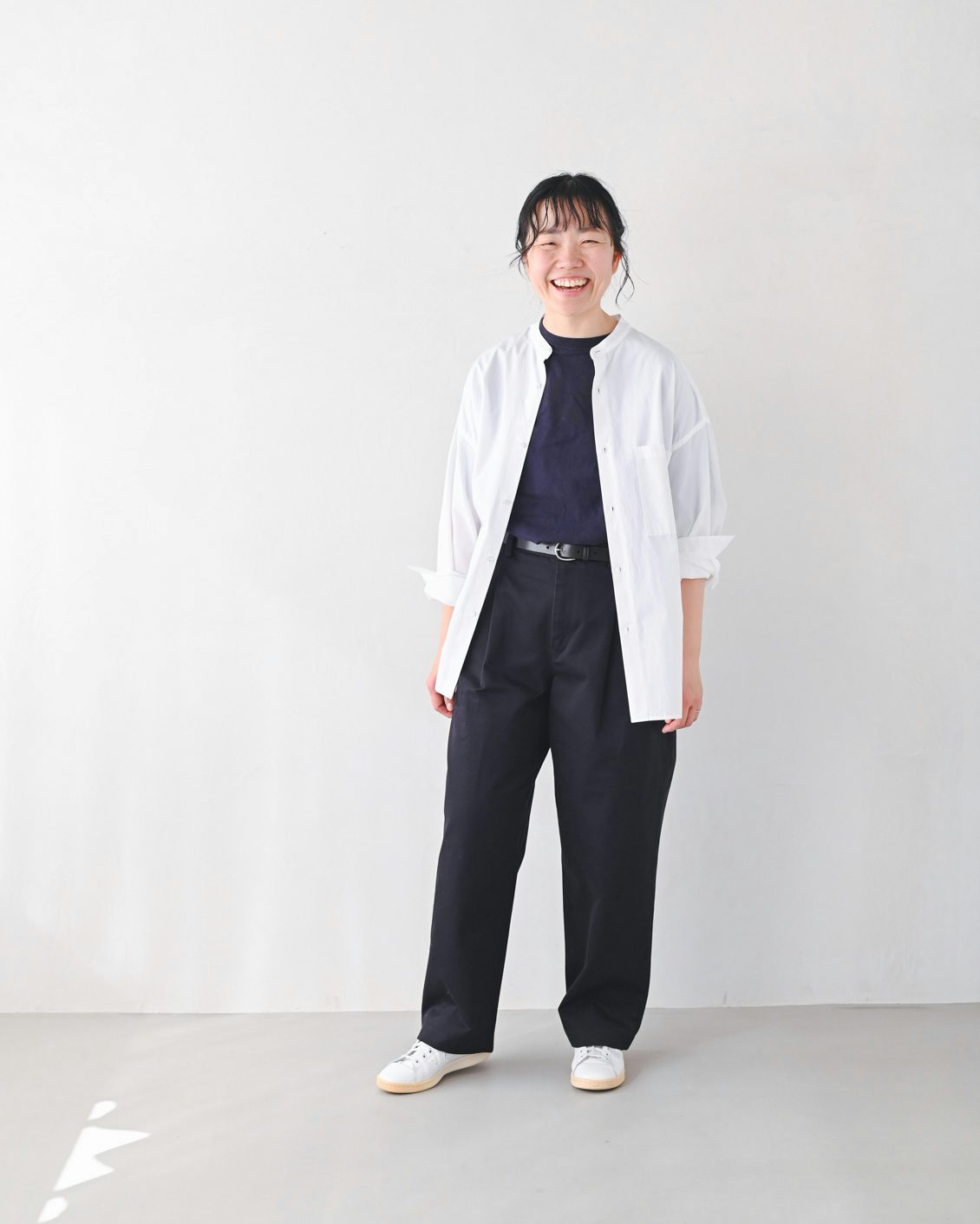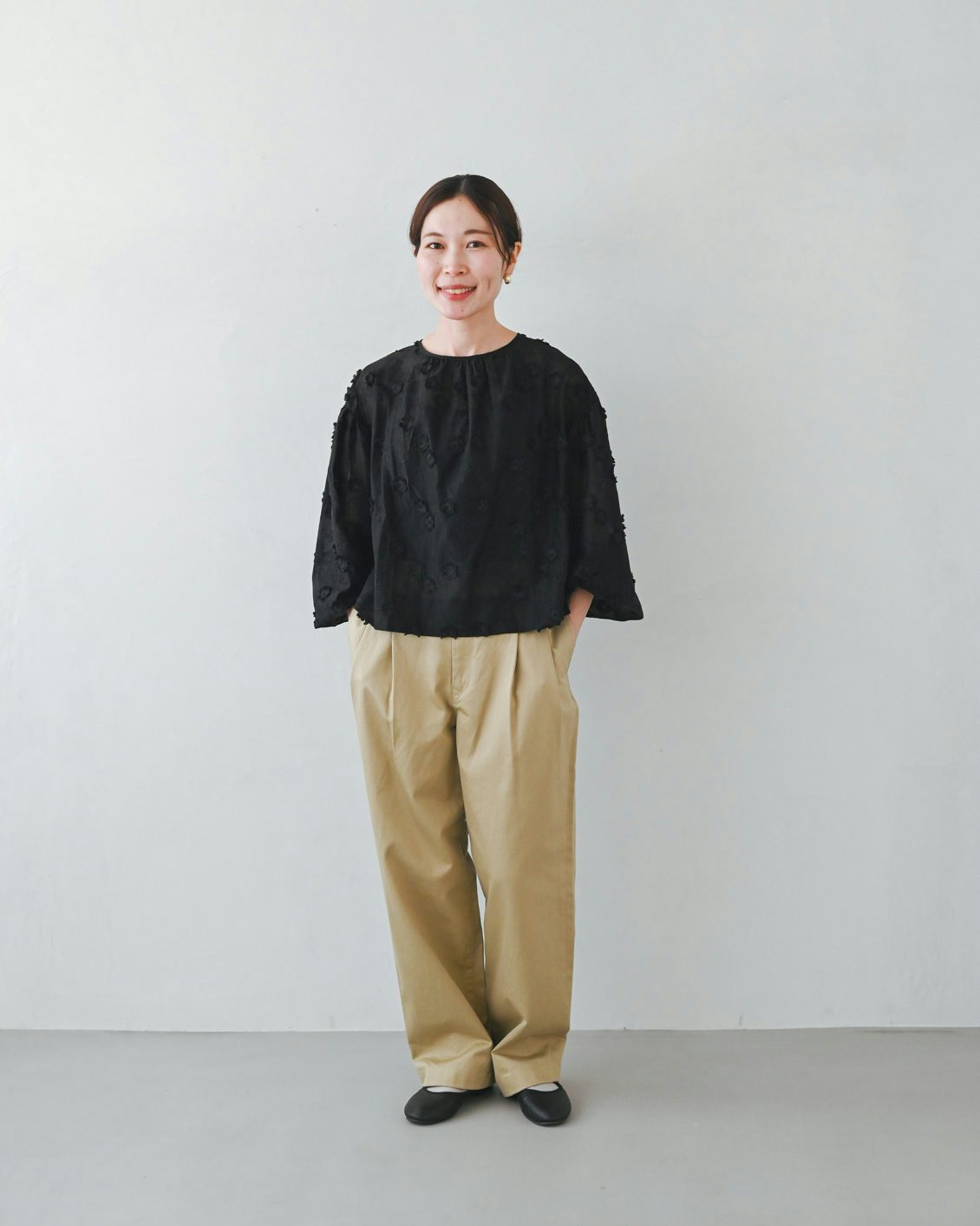「いつもは、くたっとした柔らかな素材の服を選ぶことが多いのですが、このパンツは生地に適度な張り感があるおかげで、穿くだけでなんだかシュッと見えるのが嬉しいです。どこか『かっこいい人』になったような気分になりました。