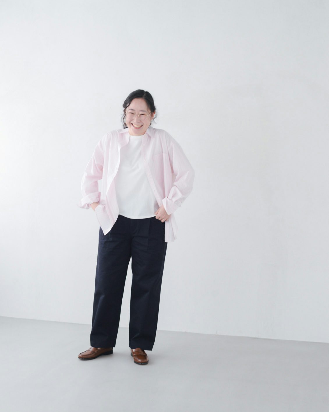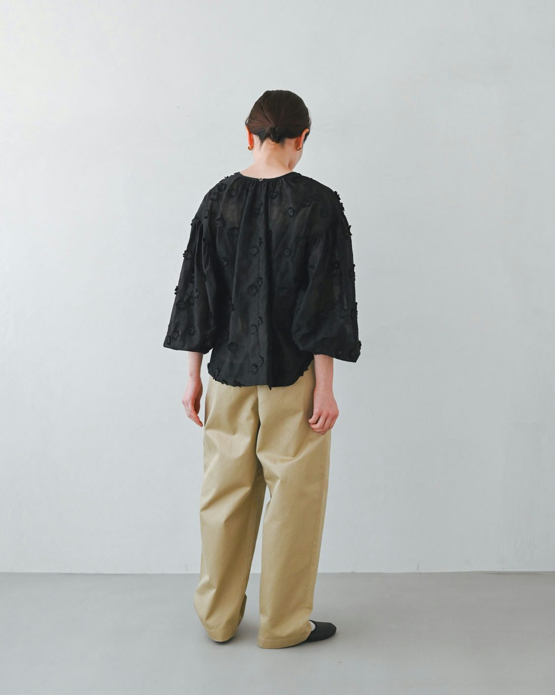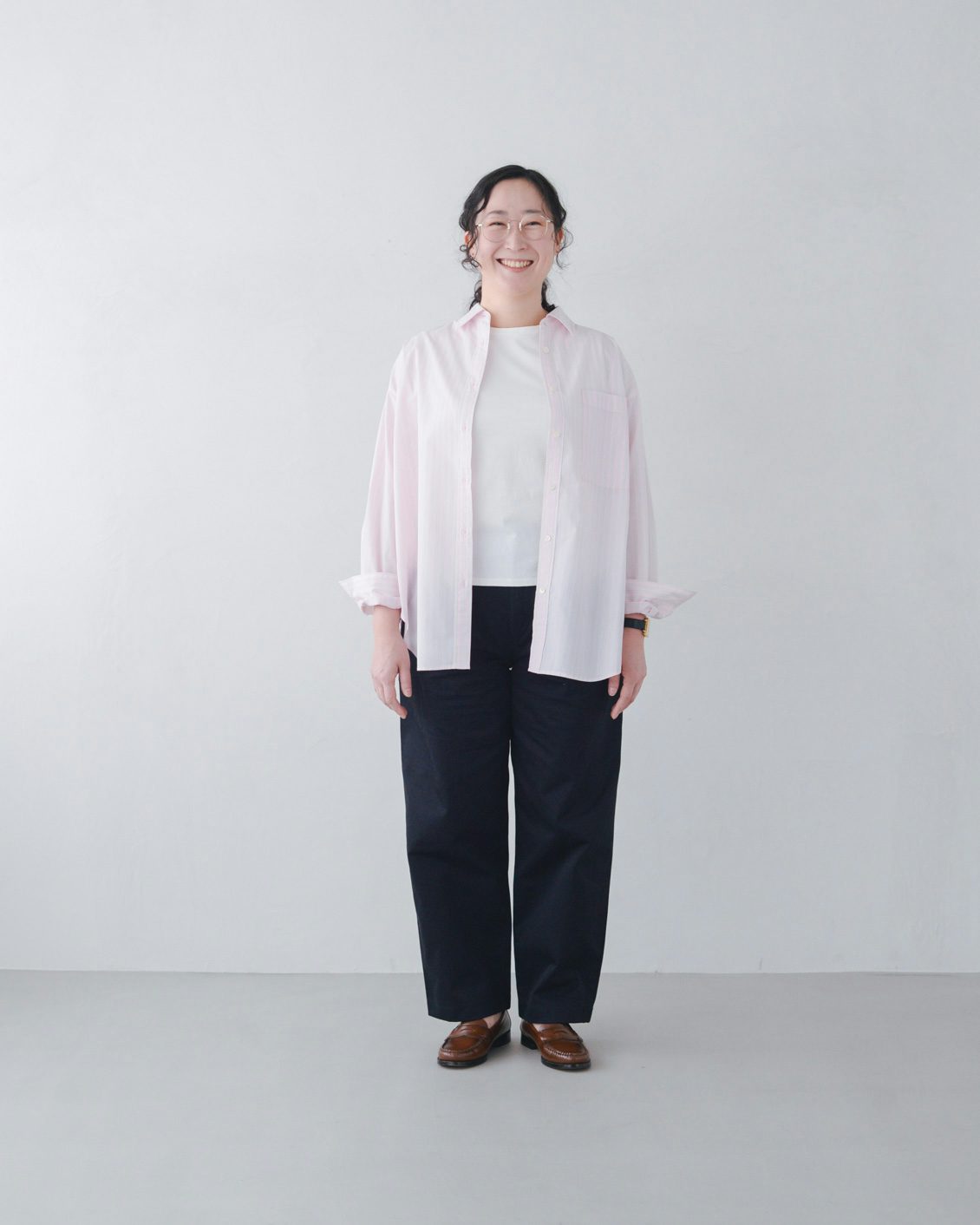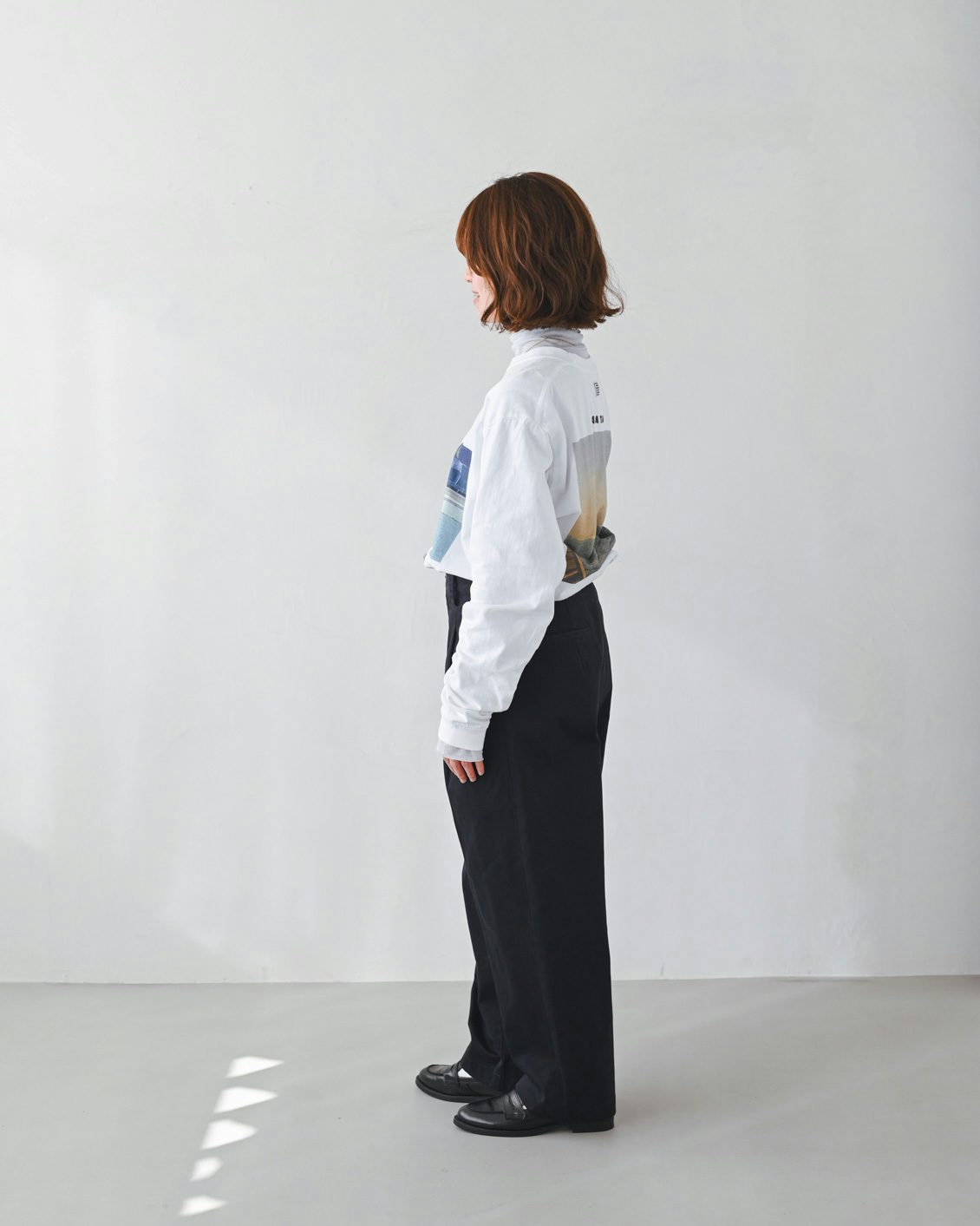 「いつもは、くたっとした柔らかな素材の服を選ぶことが多いのですが、このパンツは生地に適度な張り感があるおかげで、穿くだけでなんだかシュッと見えるのが嬉しいです。どこか『かっこいい人』になったような気分になりました。