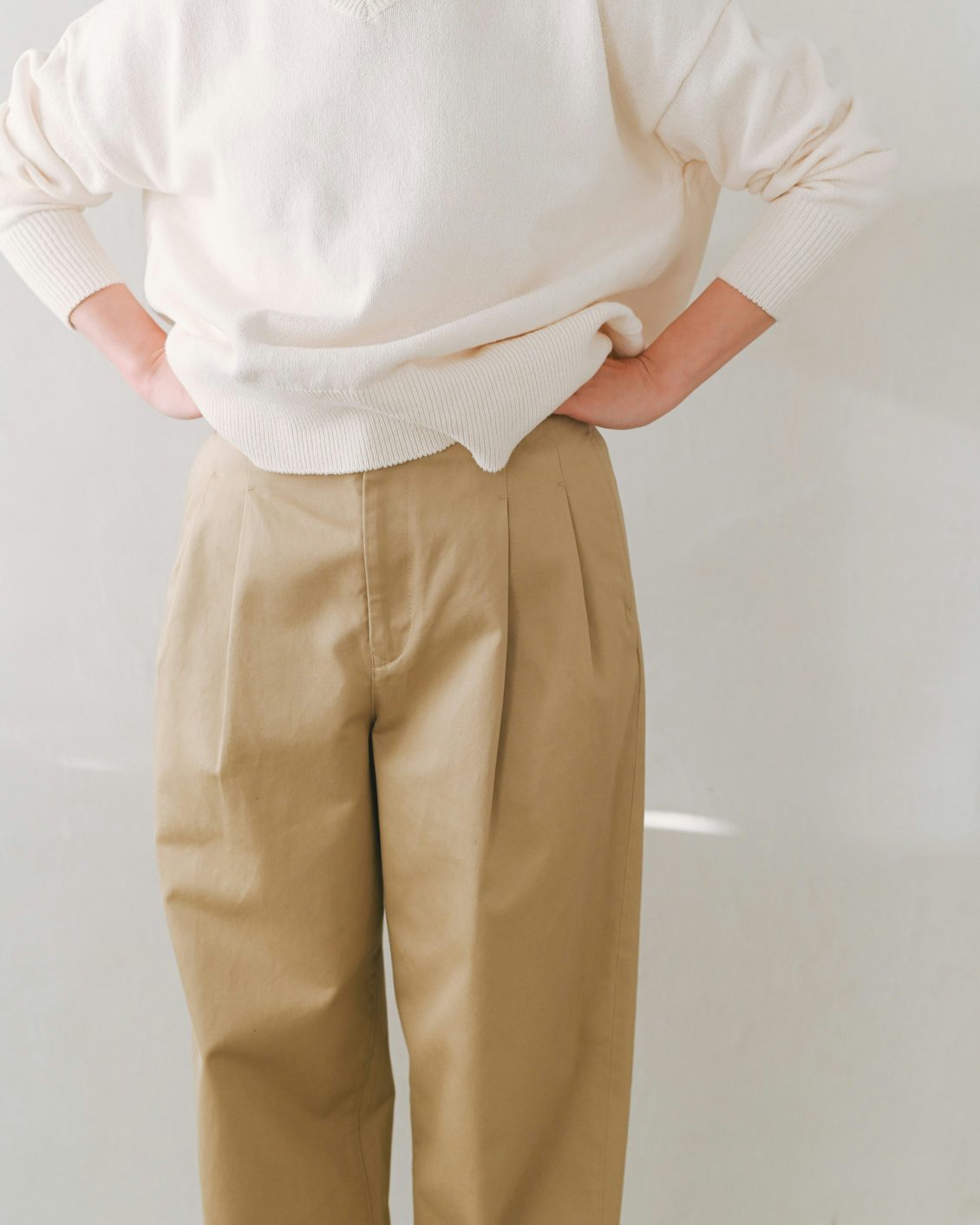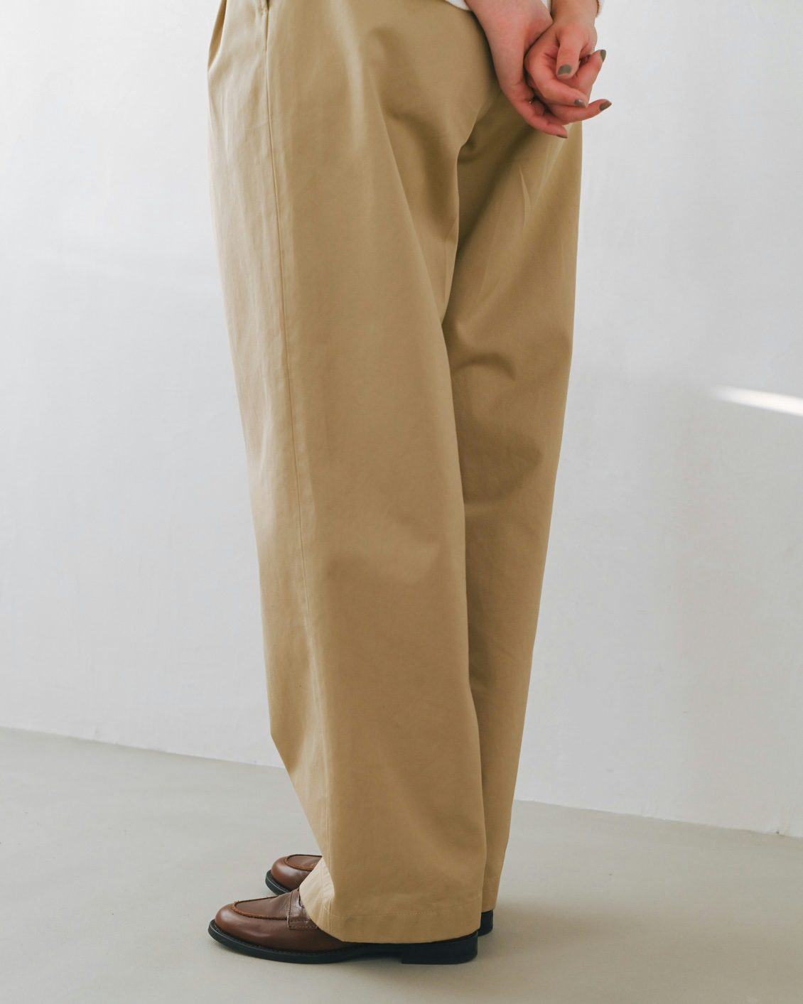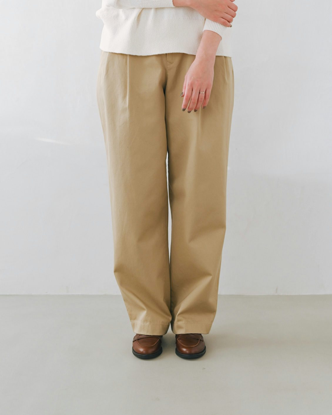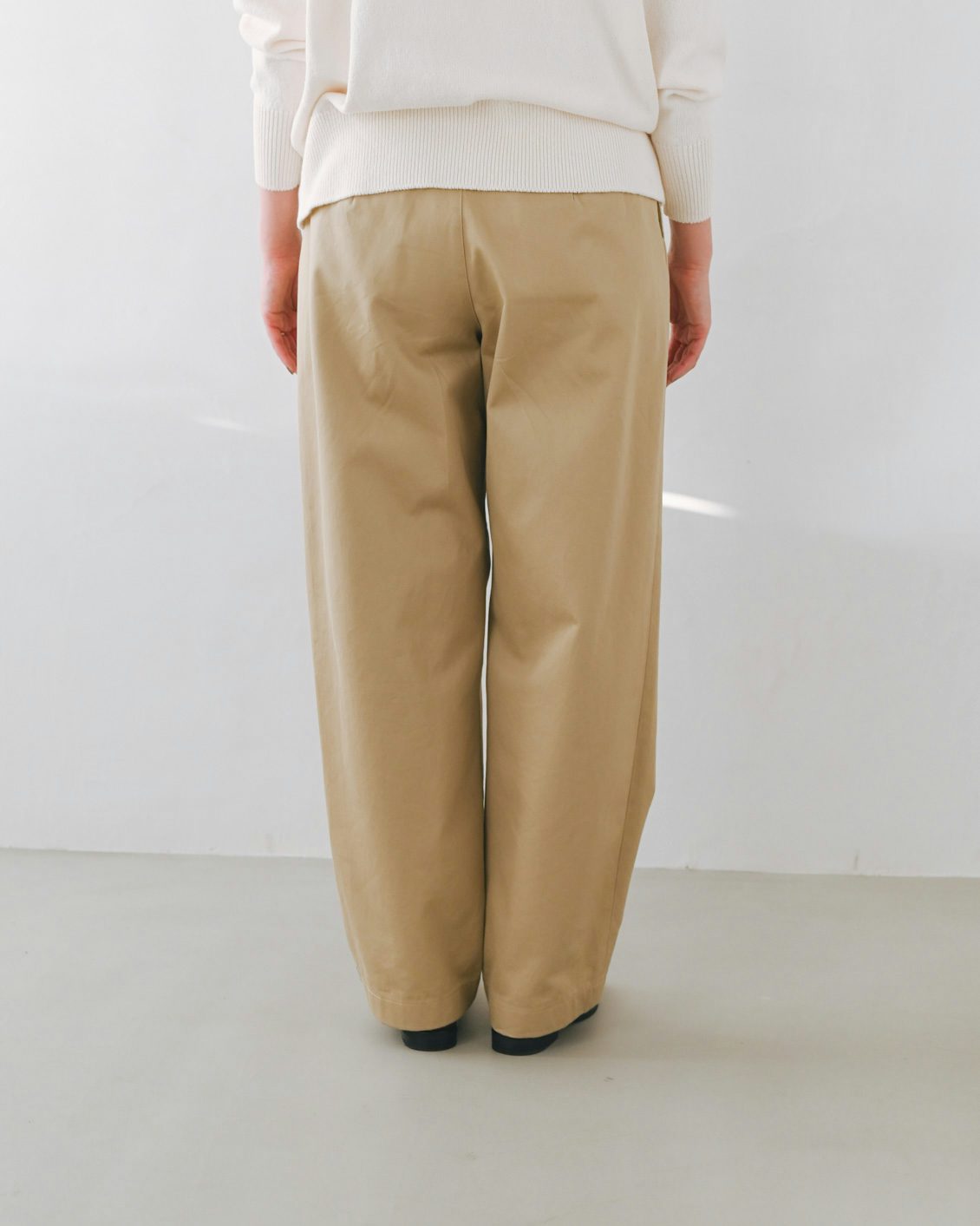 手持ちのストレートなチノパンだと、どうしてもカジュアルな印象が強くなってしまうことがあったのですが、このパンツはほんのりフェミニンさも感じられて、きれいめな着こなしにもすっと馴染んでくれそう。スニーカーを合わせても、カジュアルダウンしすぎないのが良いですね」