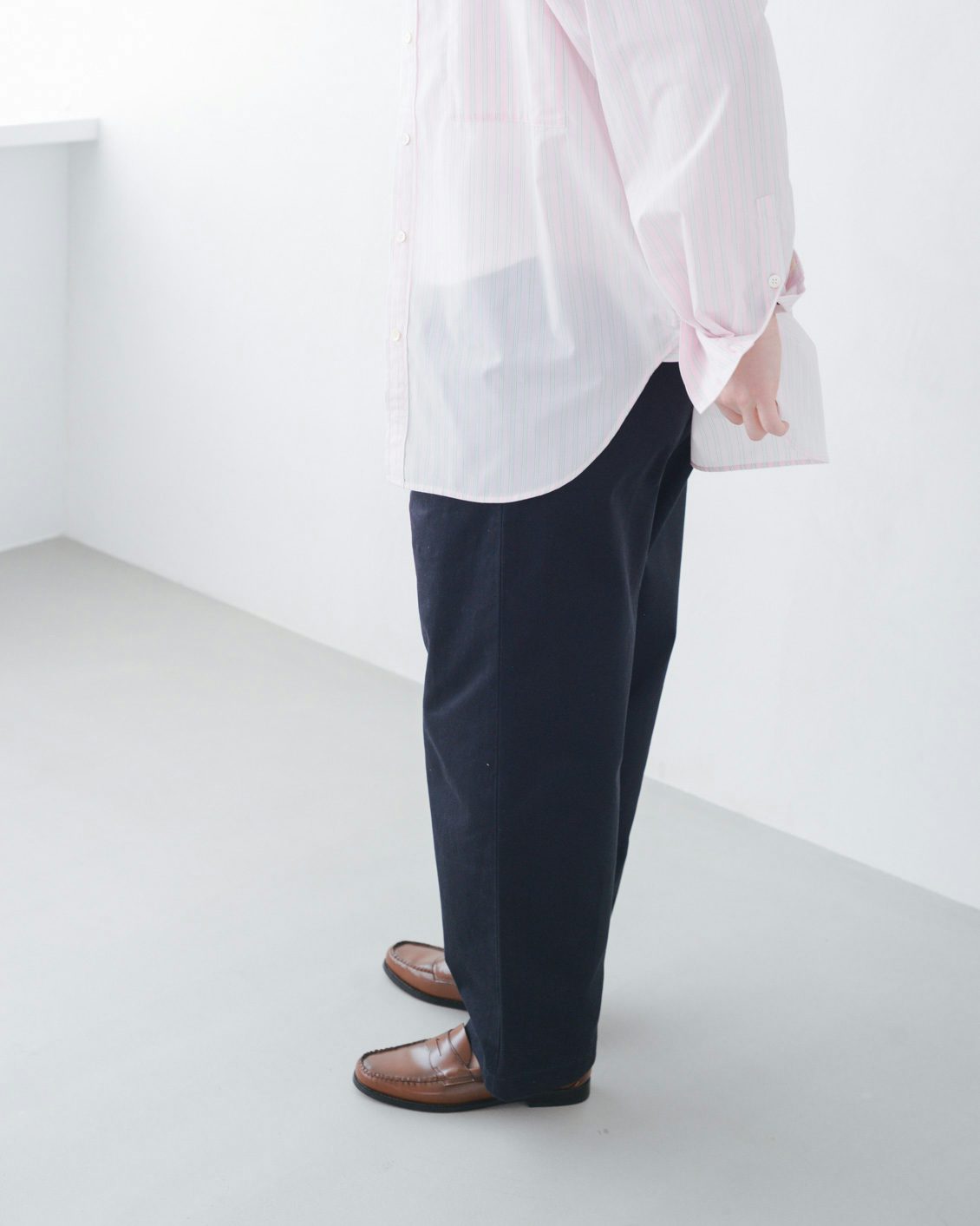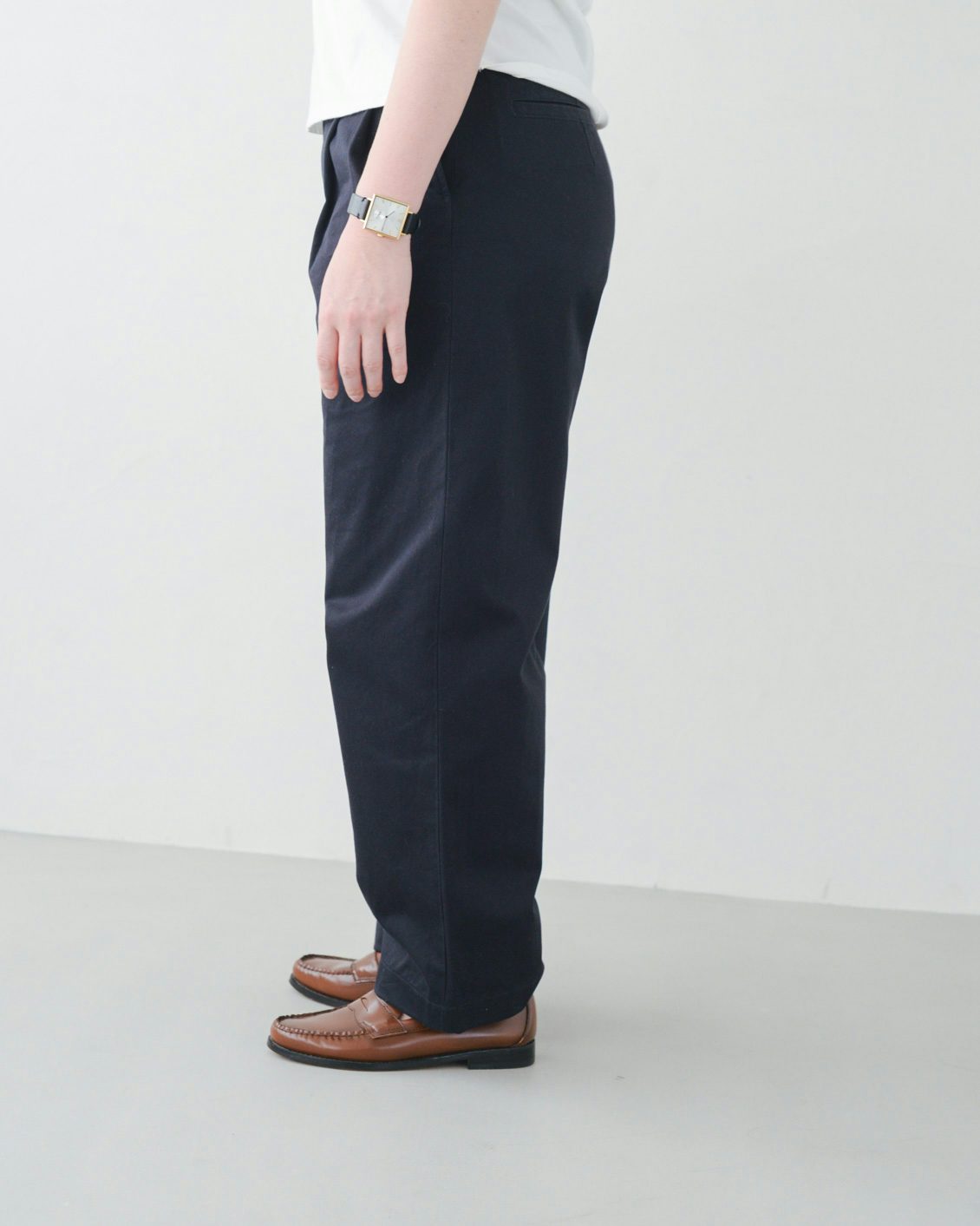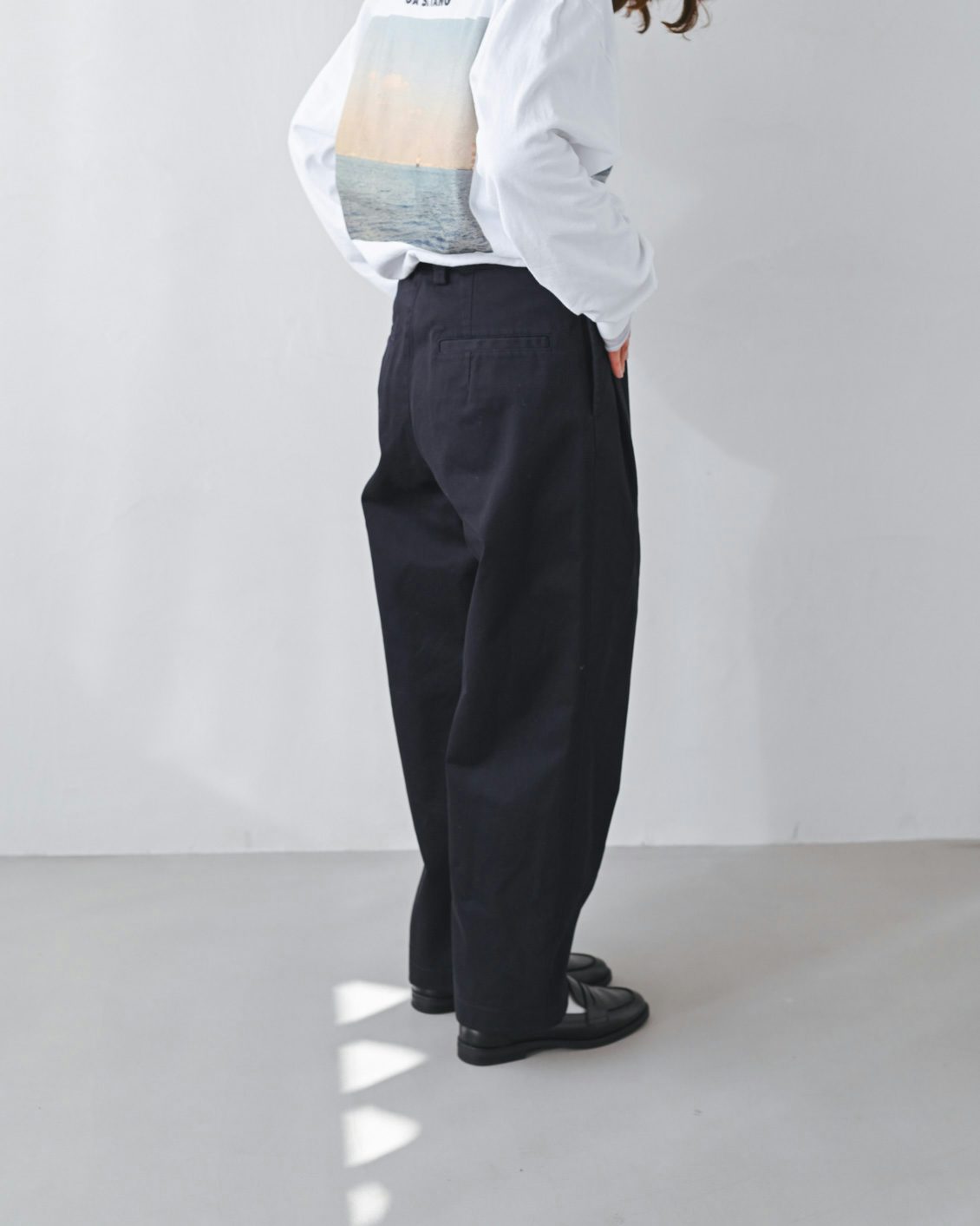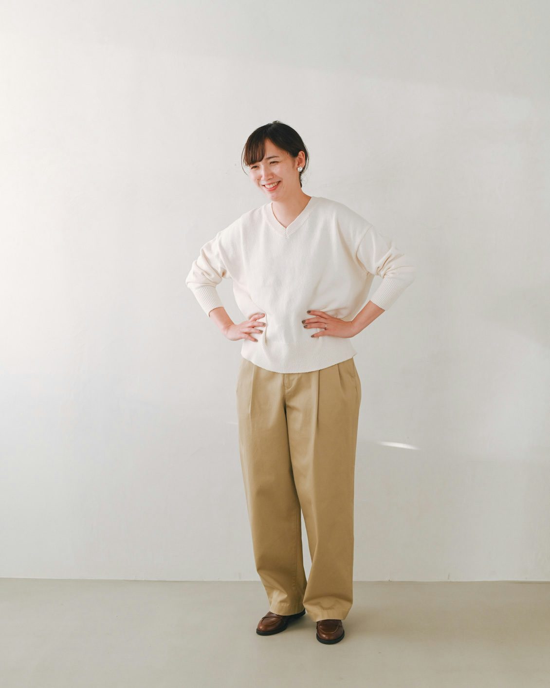 手持ちのストレートなチノパンだと、どうしてもカジュアルな印象が強くなってしまうことがあったのですが、このパンツはほんのりフェミニンさも感じられて、きれいめな着こなしにもすっと馴染んでくれそう。スニーカーを合わせても、カジュアルダウンしすぎないのが良いですね」