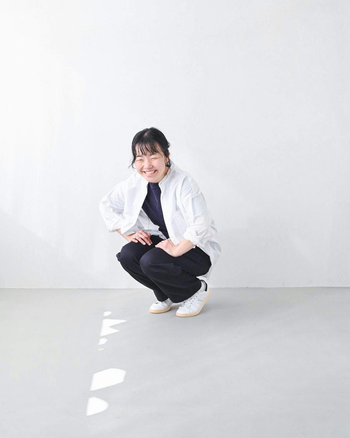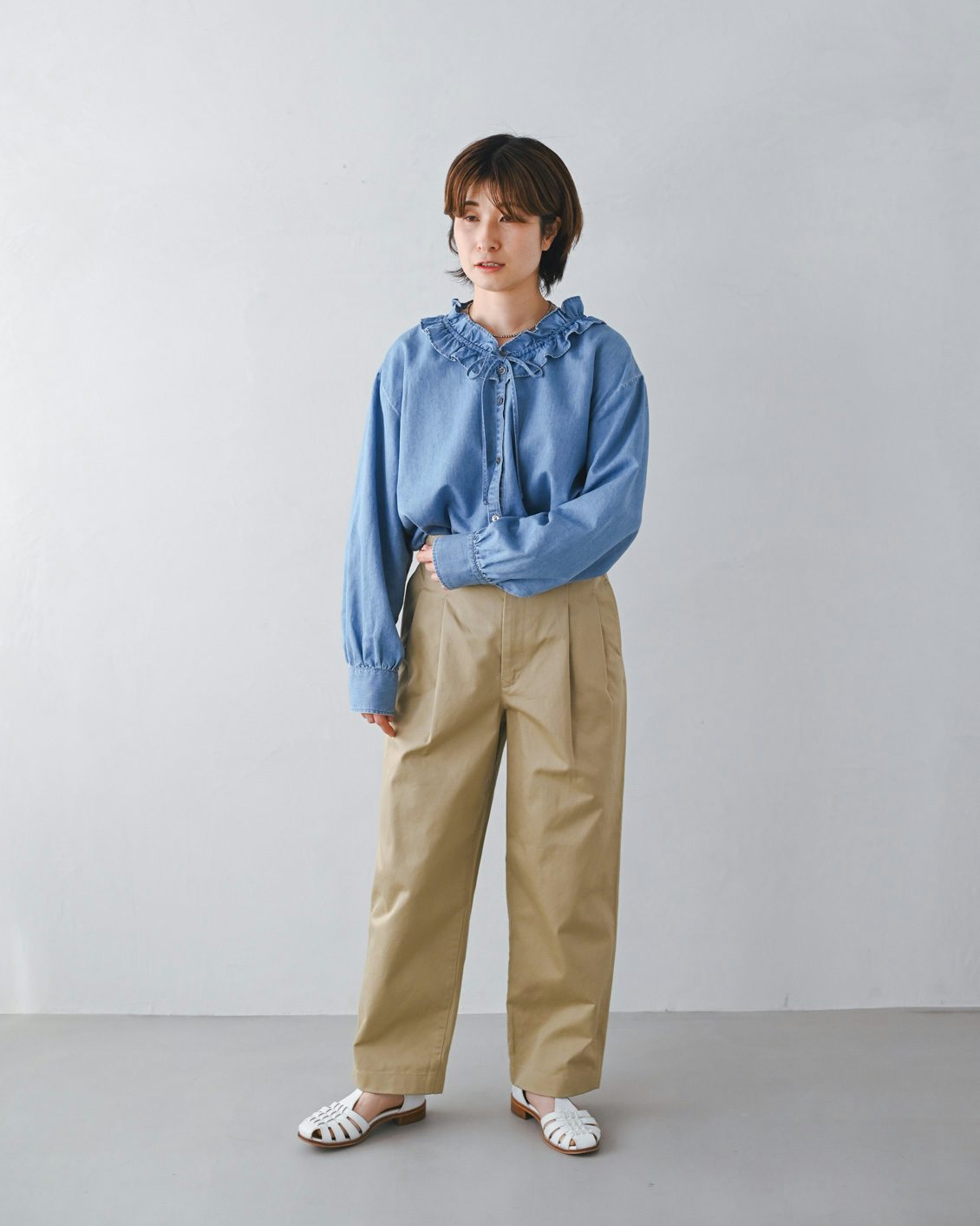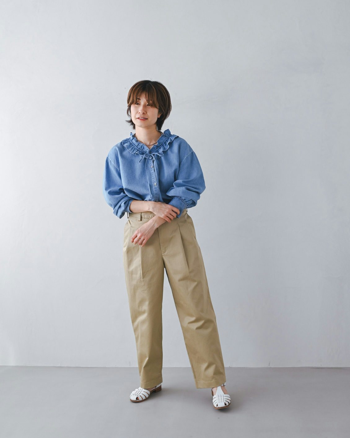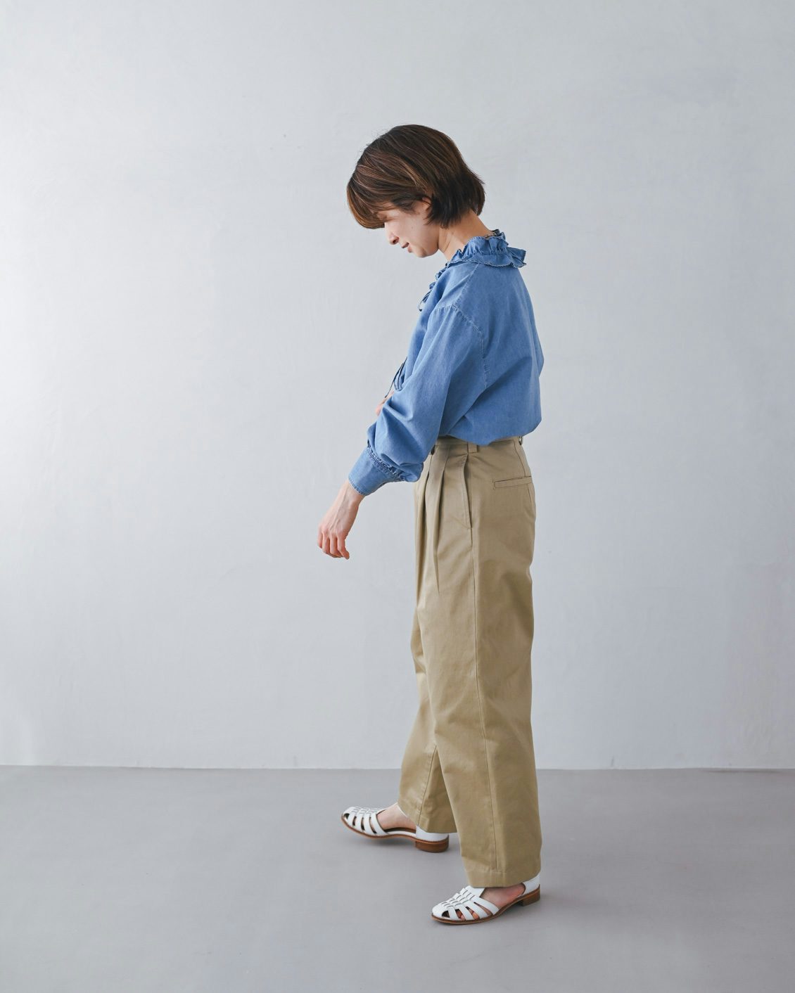 手持ちのストレートなチノパンだと、どうしてもカジュアルな印象が強くなってしまうことがあったのですが、このパンツはほんのりフェミニンさも感じられて、きれいめな着こなしにもすっと馴染んでくれそう。スニーカーを合わせても、カジュアルダウンしすぎないのが良いですね」