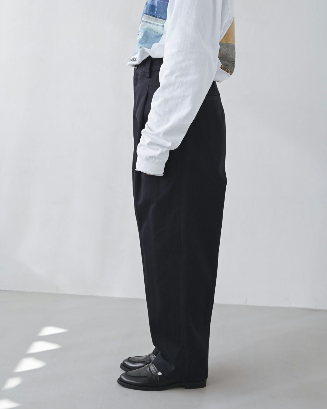「普段からチノパンはよく履くのですが、このパンツは特にシルエットがきれいだなと感じました。普通に立った状態だとストンと落ちるのですが、少し動きを加えると、程よくシワが入って、それがまた良い雰囲気に。