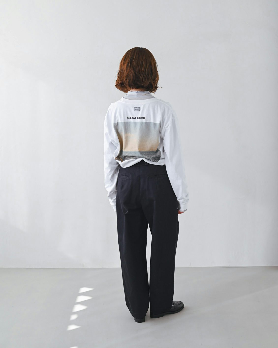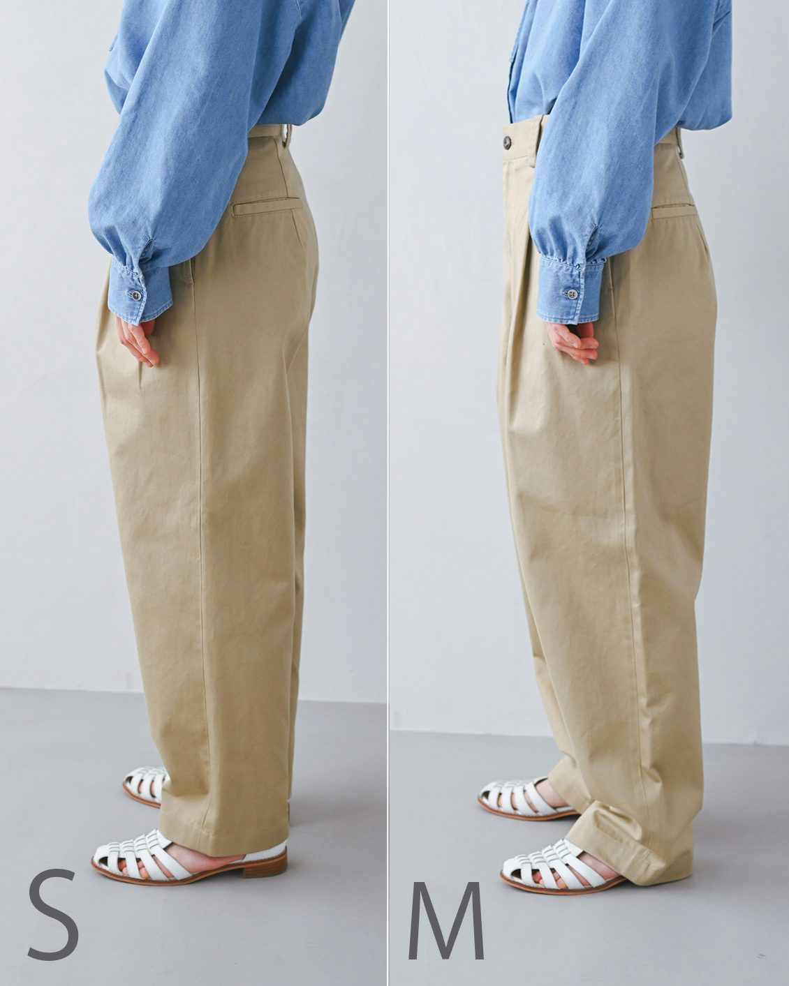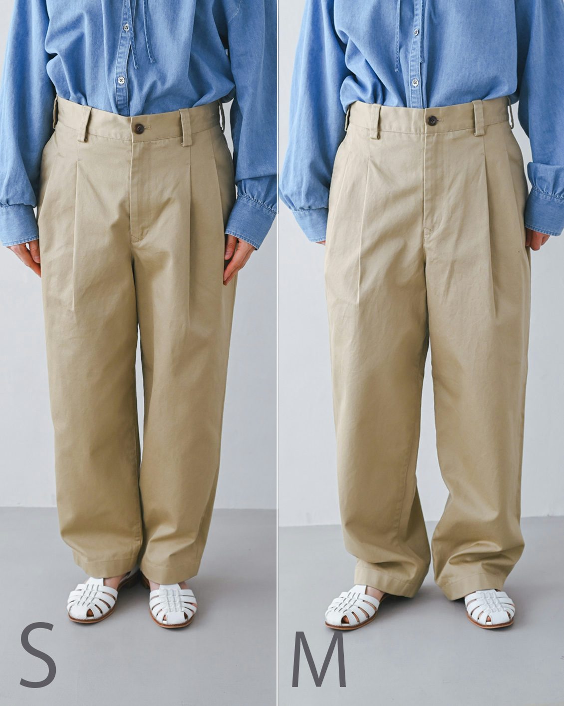 Mサイズは丈が長く、ひと折して、ちょうど良い丈感。このサイズでゆったり穿きたい方はロールアップすると、靴とのバランスも取りやすいように思います」