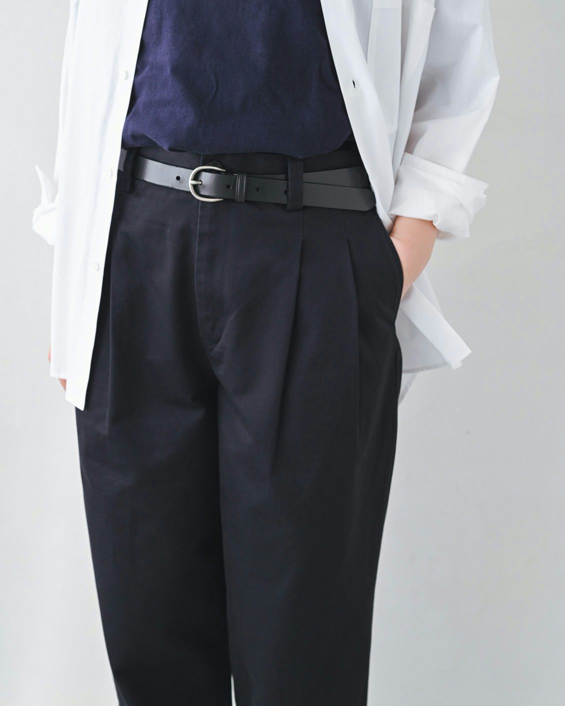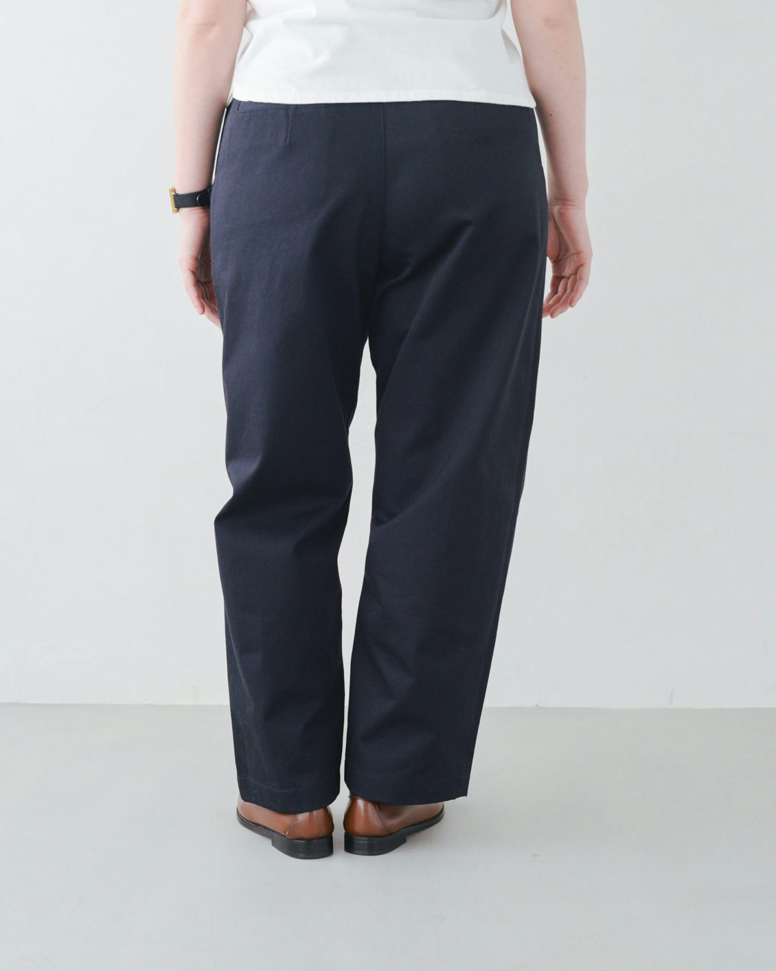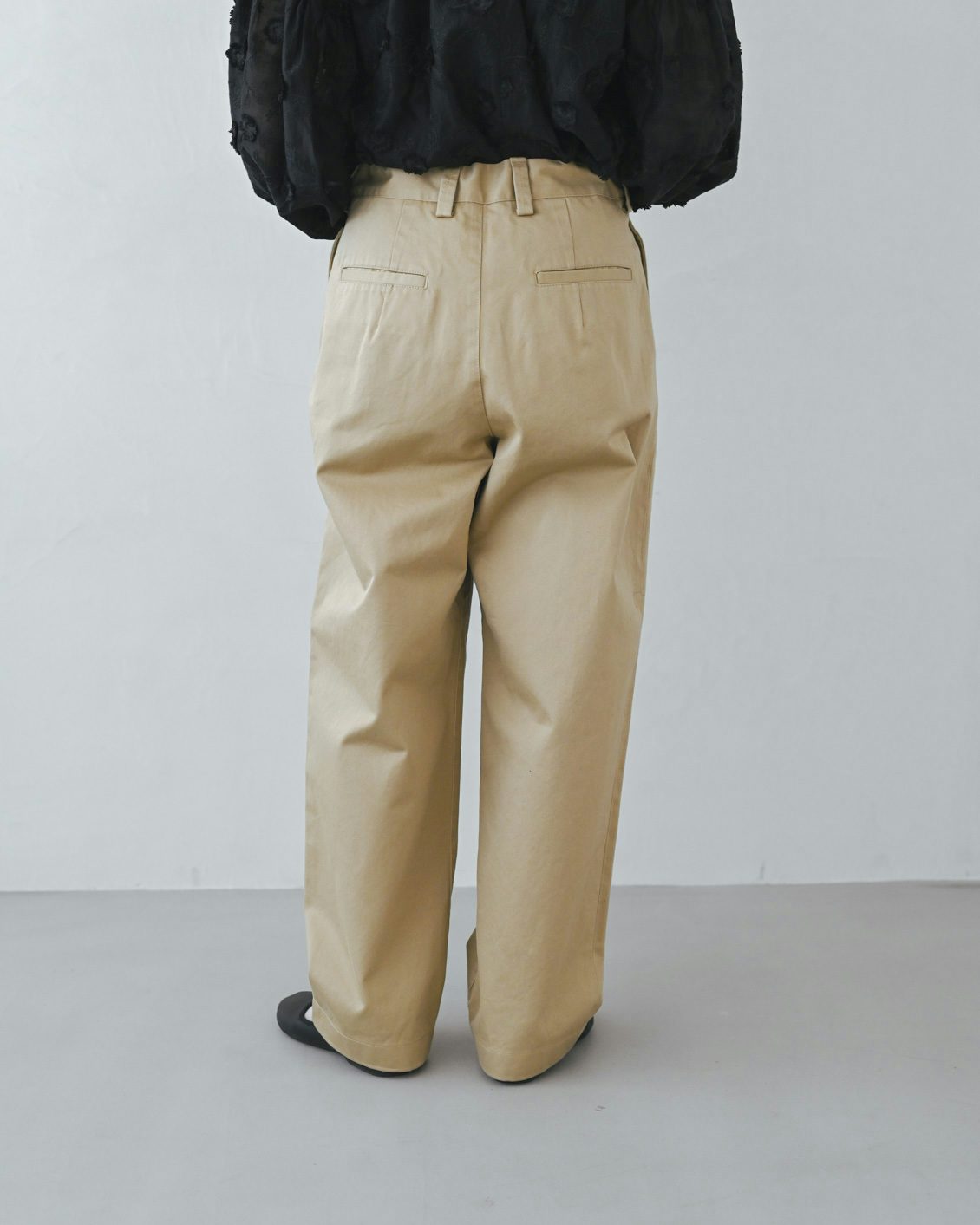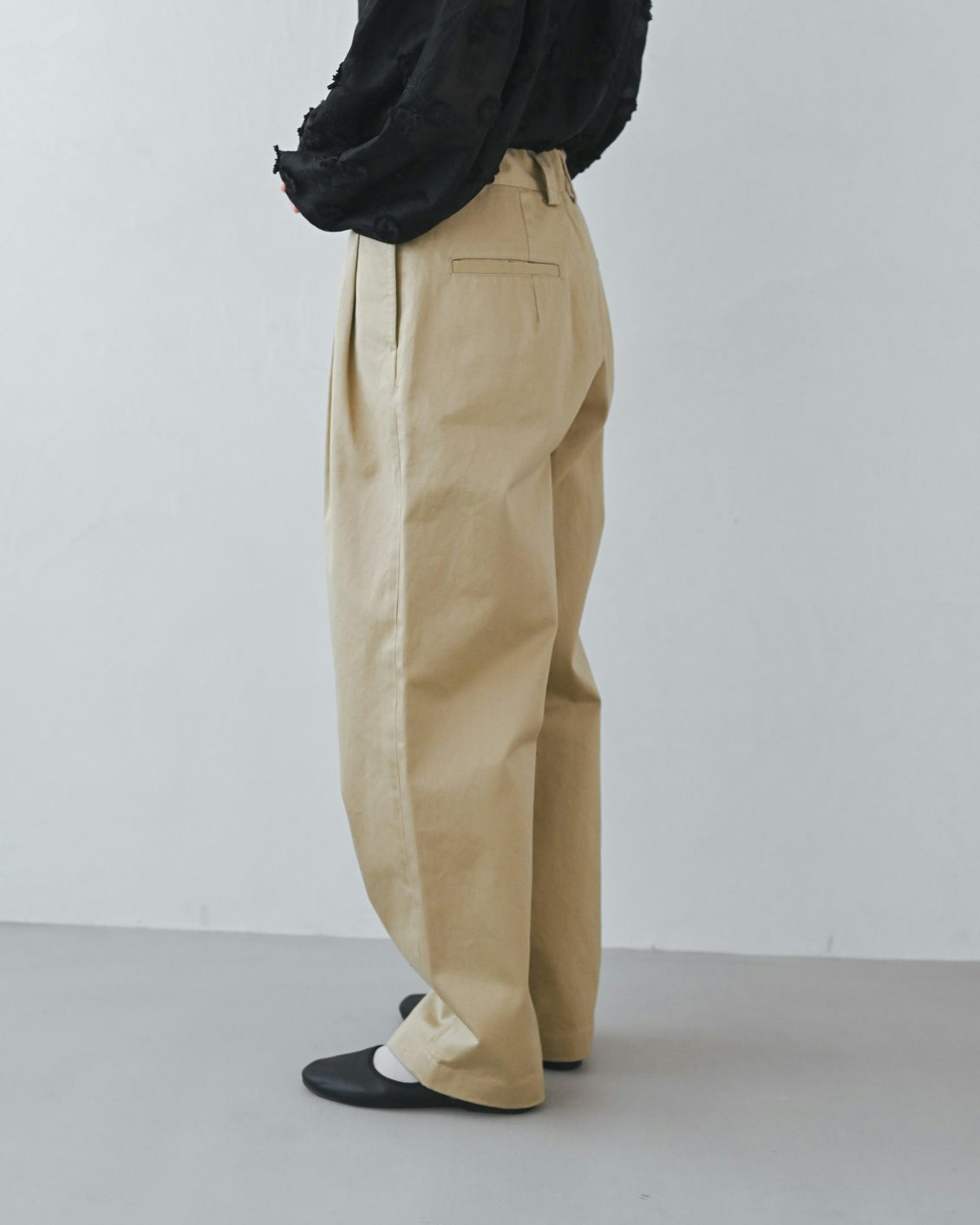 このタックのおかげで、心地よいゆとりがありながら、ヒップや腰回りの見た目がすっきり。裾に向かって程よく絞られたテーパードのシルエットも、もたつくことなく綺麗なラインを見せてくれる気がします。