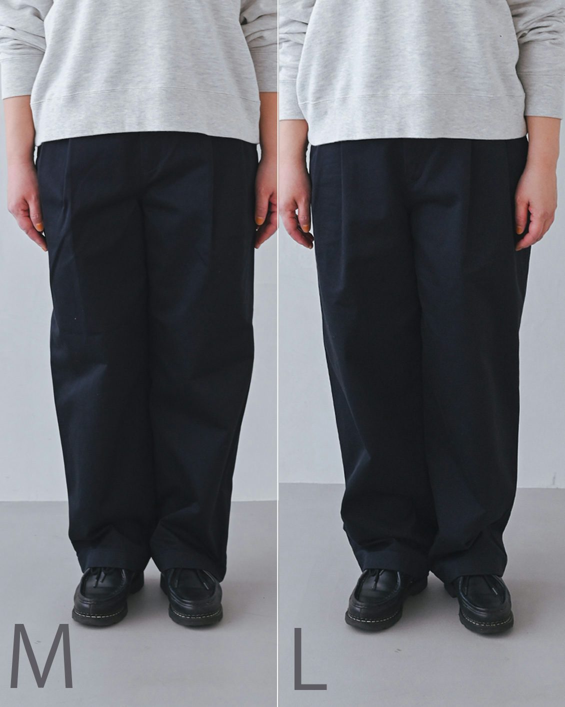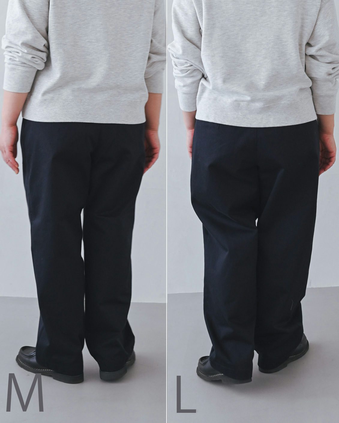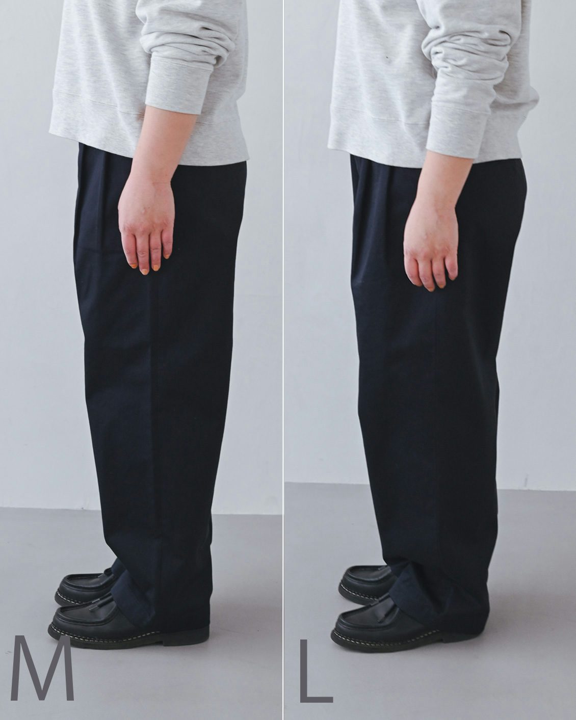 どちらも問題なく穿くことはできるのですが、今の好み的には少しルーズに、日常に溶け込むLサイズを選びたい気分です。