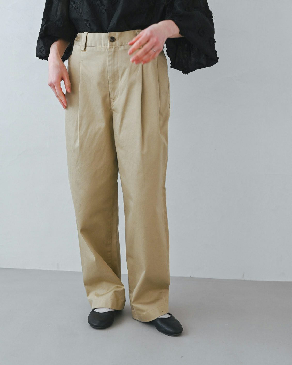 例えば私は割と腰が張っているタイプなので、普段のパンツ選びではお腹周りの見え方を気にしているのですが、このパンツはとにかくタックの見え方が綺麗で。