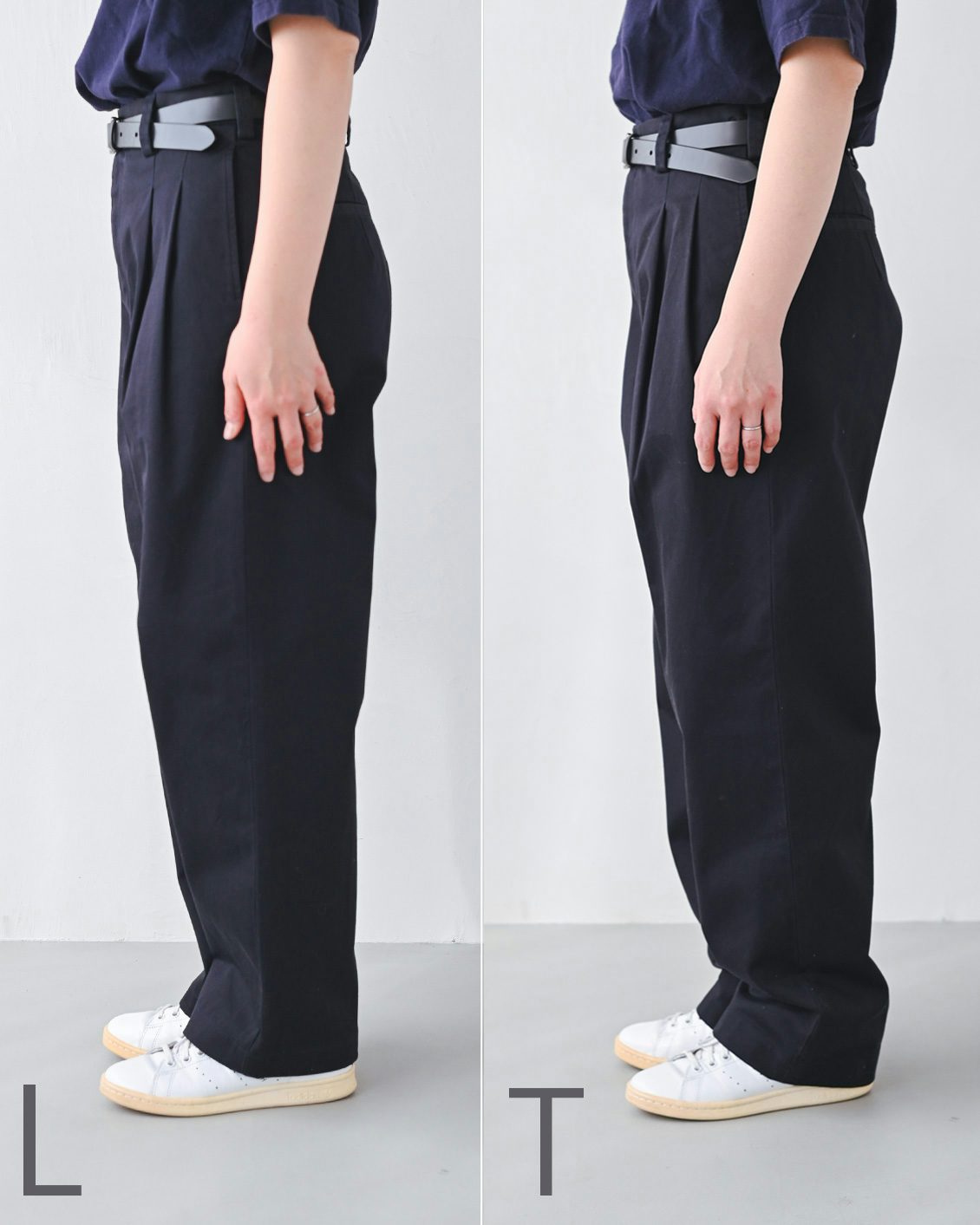 当店のボトムスはTサイズ。ユニクロだとLの丈長めサイズ。ウエストは多少緩めでも、丈の長さが合うサイズを選ぶ。
