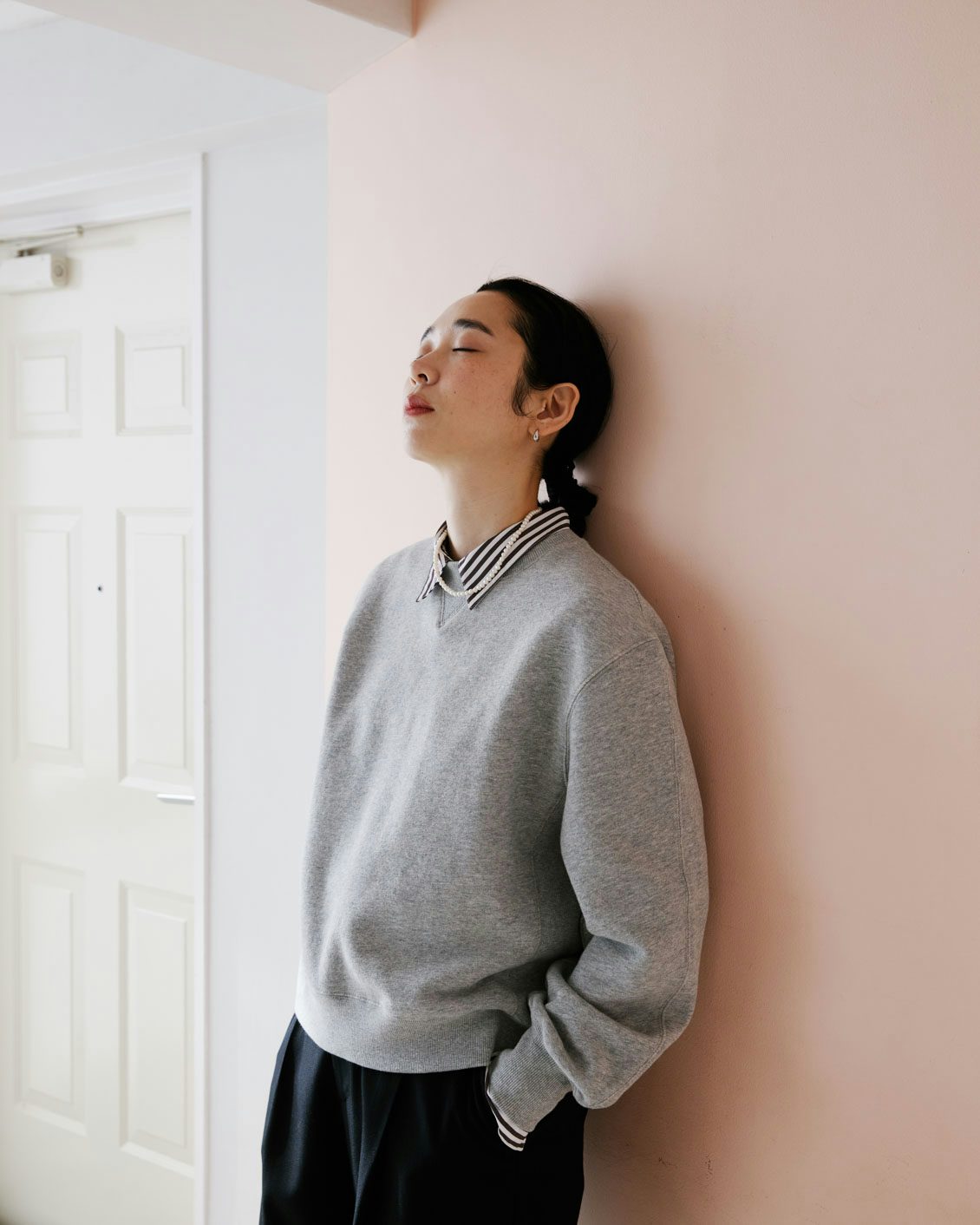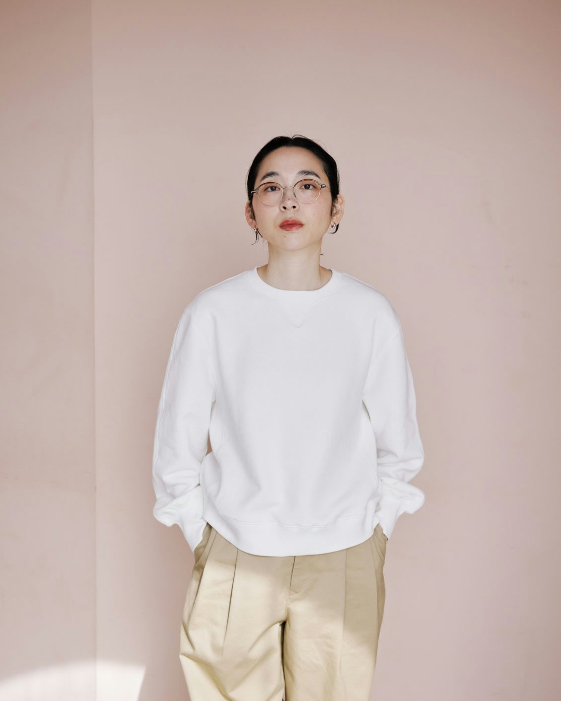 1枚で着てもシルエットそのものから少し余裕の感じられるような、少しルーズな印象も持たせたい。そして、アクセサリーを重ね付けしたくなるような、スウェットを目指しました。