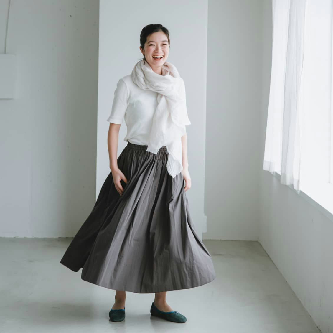 「実はわたし、こちらのライトグレーを愛用しています。真っ白でもグレーでも、ベージュでもないニュアンスのある色味だから、どんな洋服にもしっくりと馴染んでくれるんです。