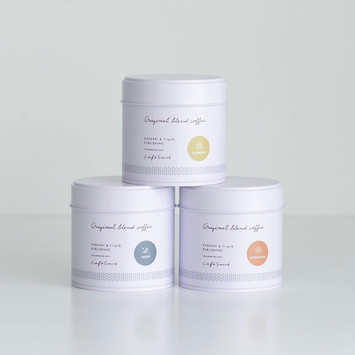 | 豆について | 【morning 】 ・豆:ブラジル、コロンビア、ベトナム、エチオピア ・挽き方:中挽き ・焙煎度合:フレンチロースト 【afternoon 】 ・豆:コロンビア、ブラジル、インドネシア、エチオピア ・挽き方:中挽き ・焙煎度合:フルシティロースト 【 night 】 ・豆:国内加工コロンビア ・挽き方:中挽き ・焙煎度合:フルシティロースト |