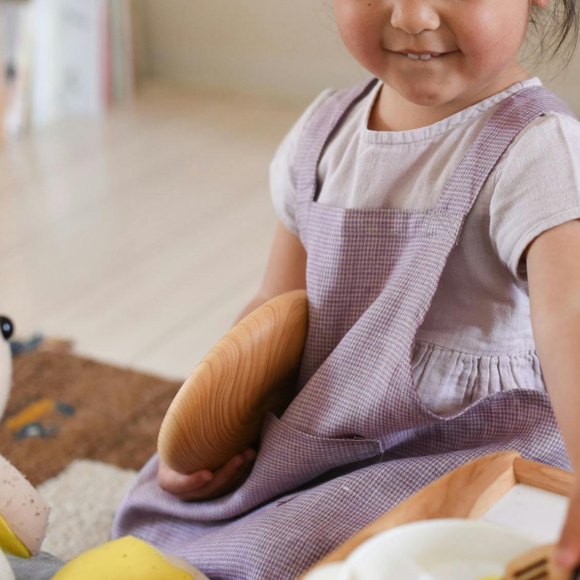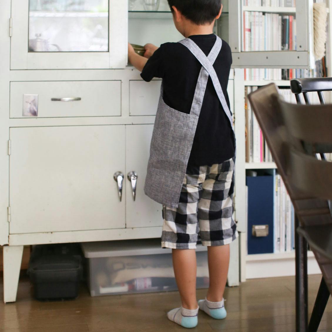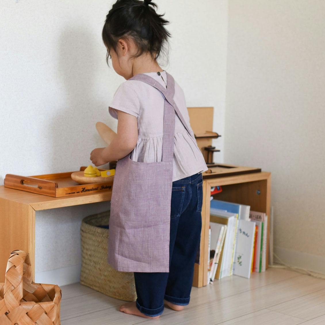 遊びの時間に寄り添い、お手伝いに張り切る心を受け止めてくれる ”自分専用" のエプロン。そばで見守る大人も、一緒に嬉しくなれたらいいなと思いながら作りました。