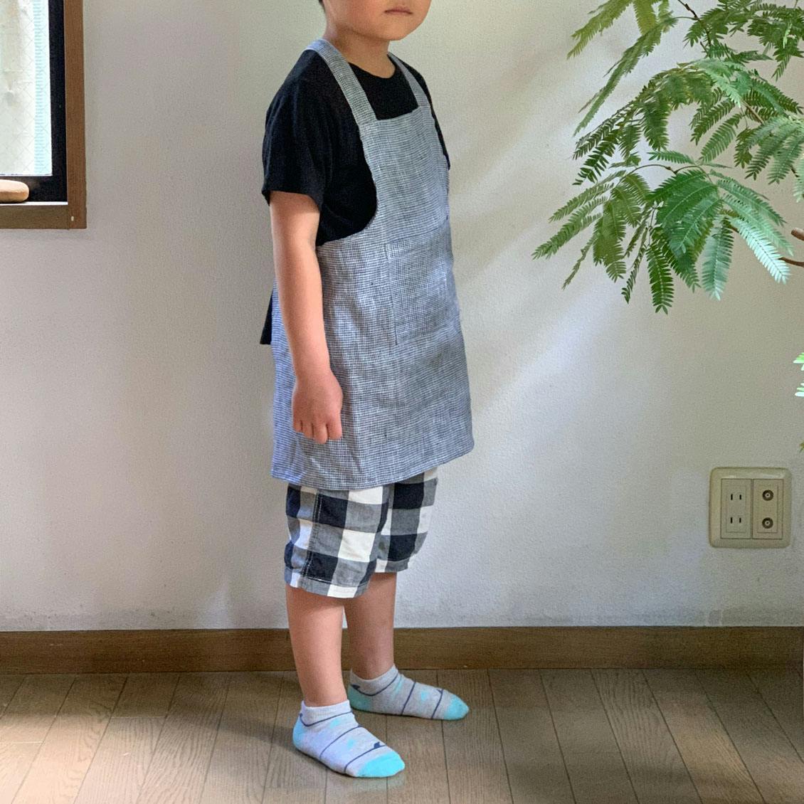 大人用エプロンをそのまま小さくしたようなシンプルなデザインで、子供の可愛らしさが際立つ一枚に仕上がりました。