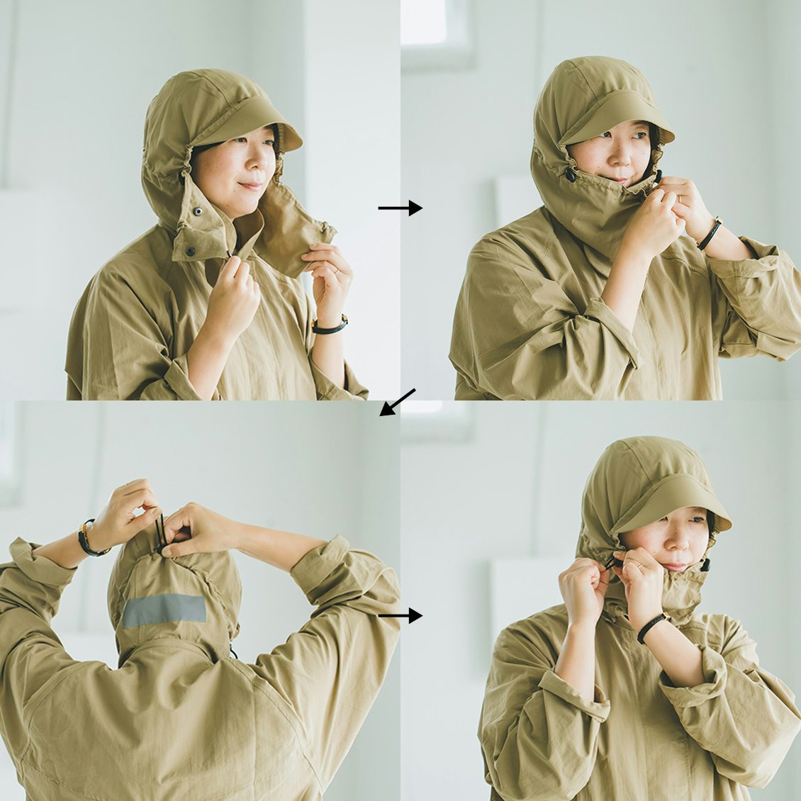 フードのボタン3つを留め、サイド2箇所、後頭部1箇所にあるアジャスターでフードの顔まわりのフィット感を調節することができます。