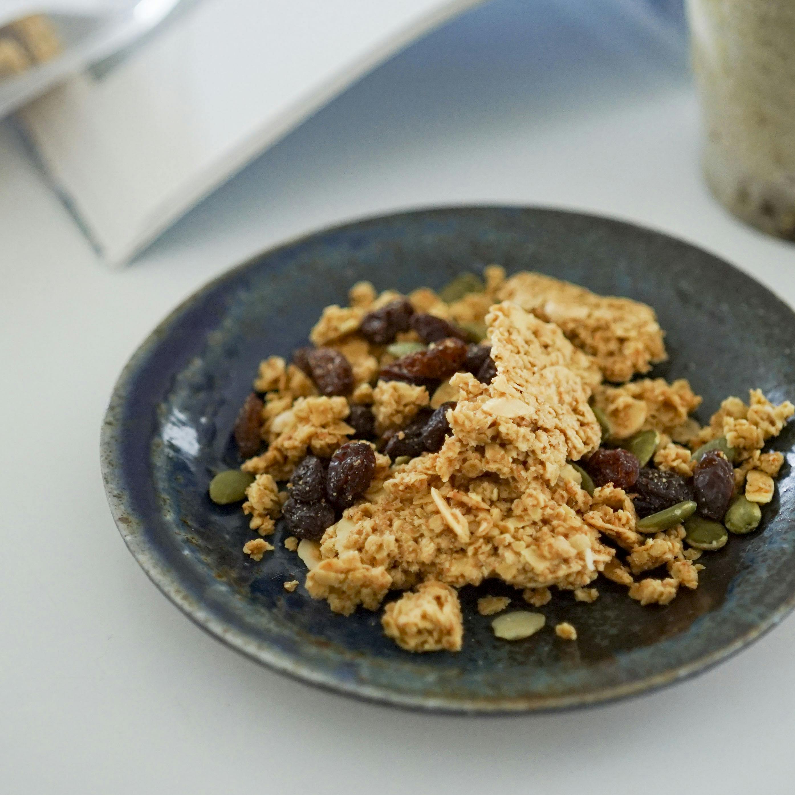 オートミール、小麦全粒粉(北海道産)、レーズン(カリフォルニア)、菜種油、メープルシロップ(カナダ産)、アーモンドスライス、かぼちゃの種、三温糖、メープルシュガー、塩(沖縄県産)
