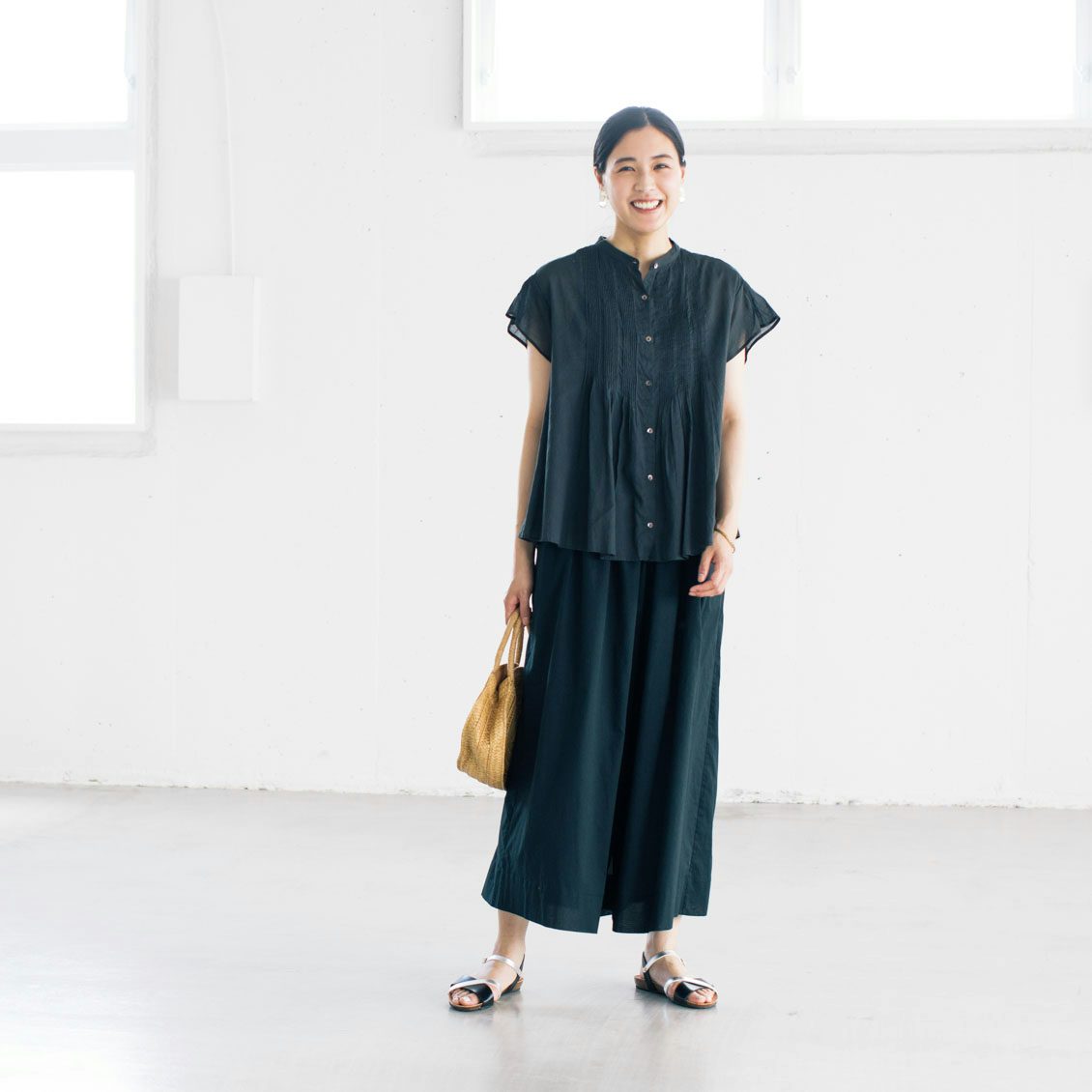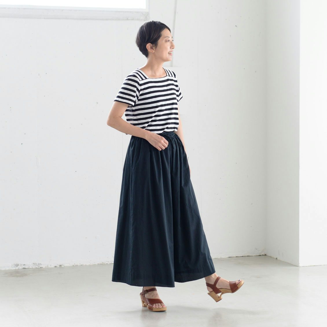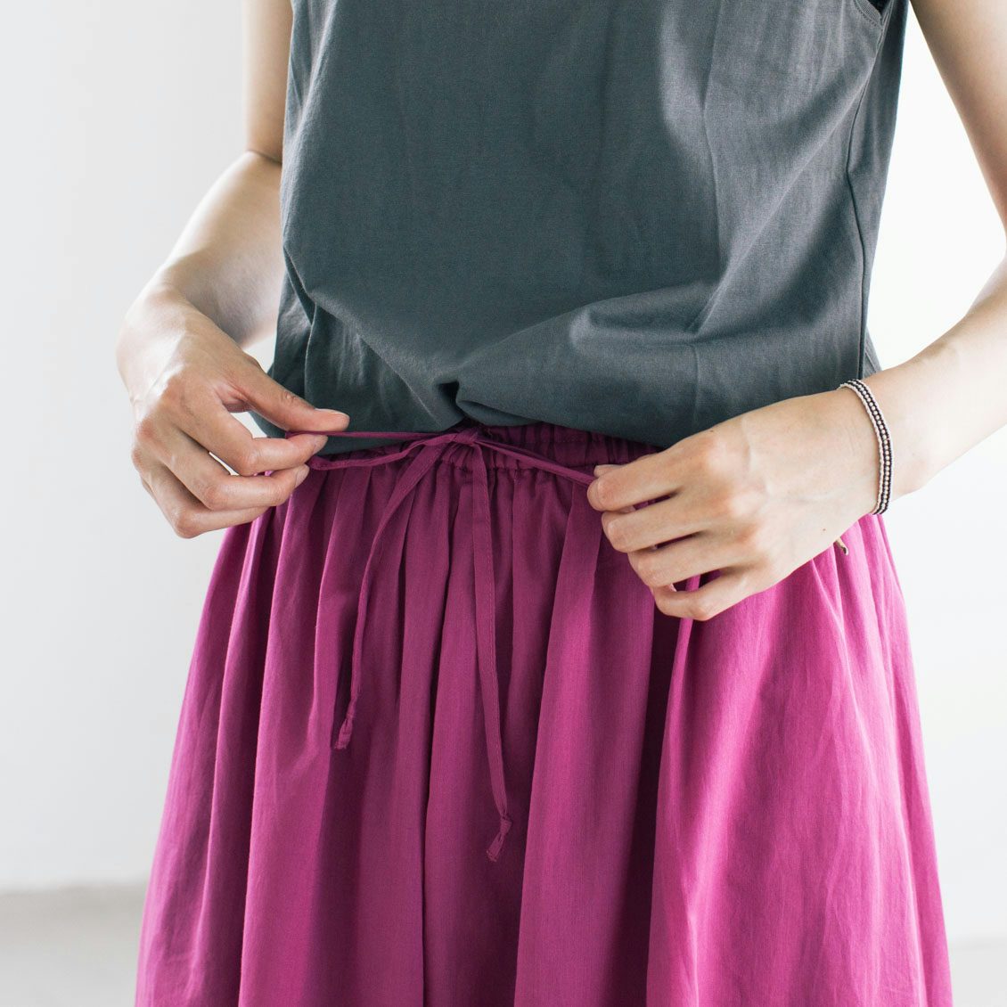薄手でやわらかな生地を使い、ギャザーを程よく寄せたことで、ウエストはすっきりと、全体はふんわりと軽やかに見えるシルエットに仕上がりました。