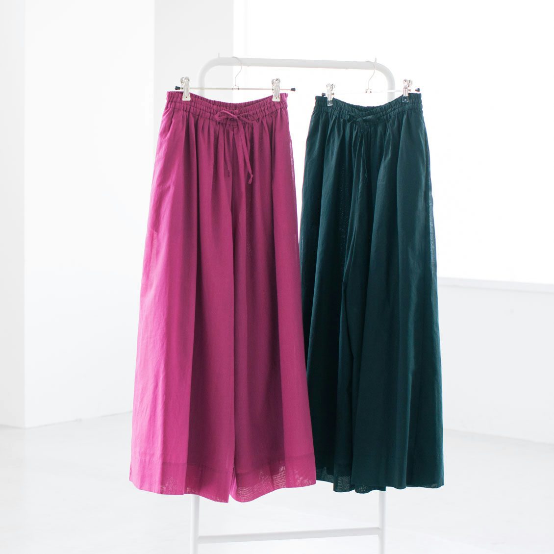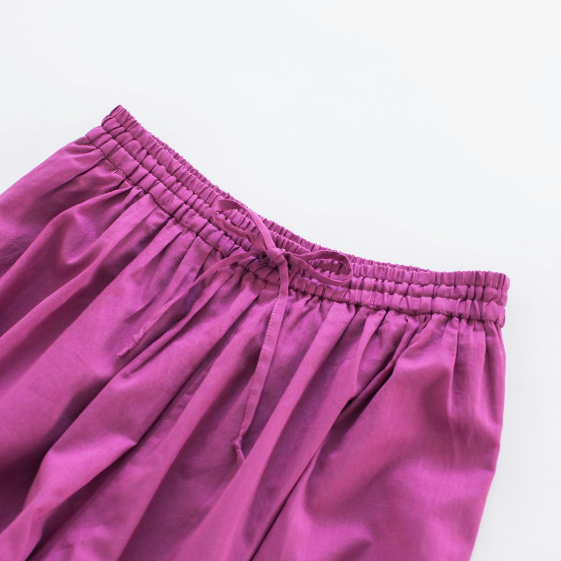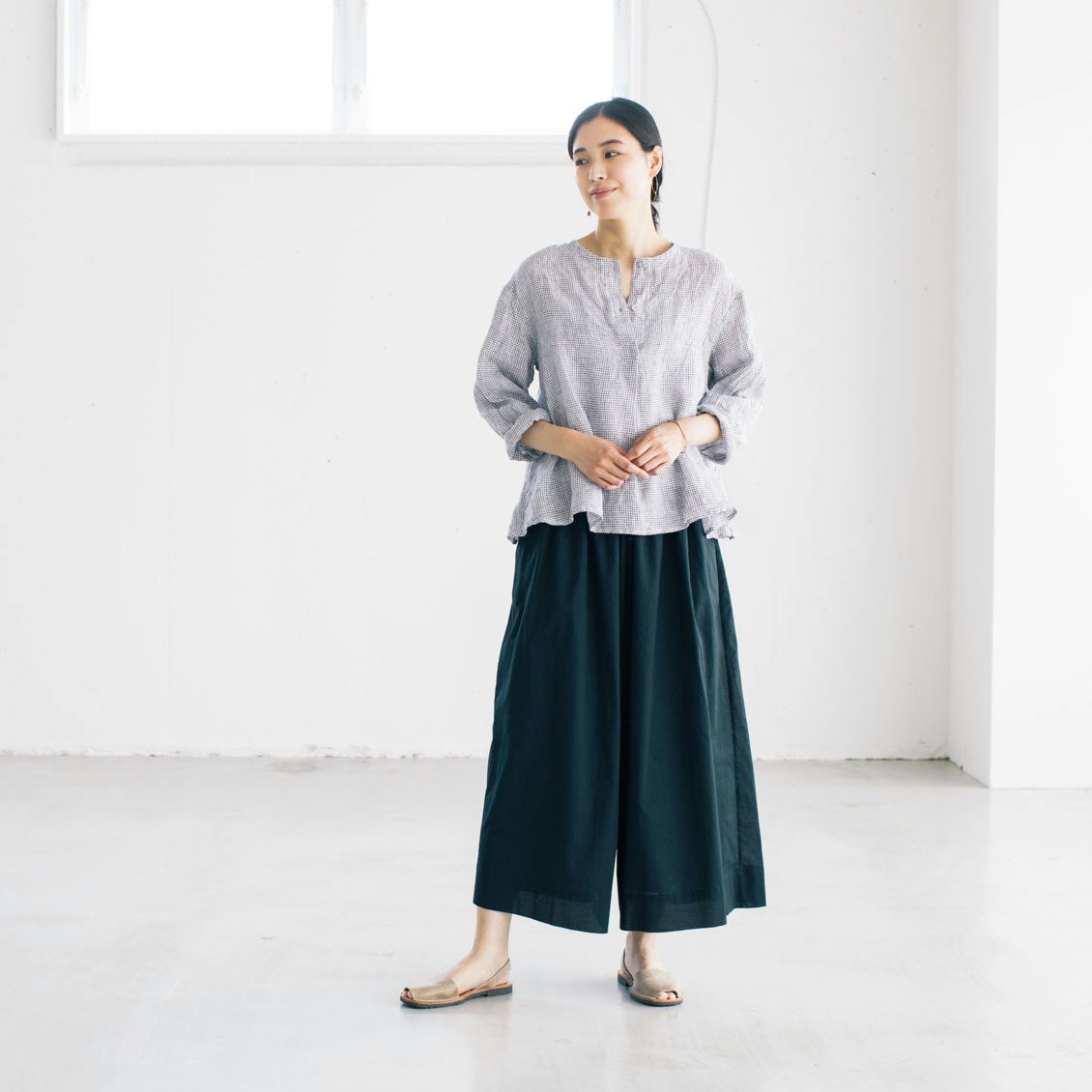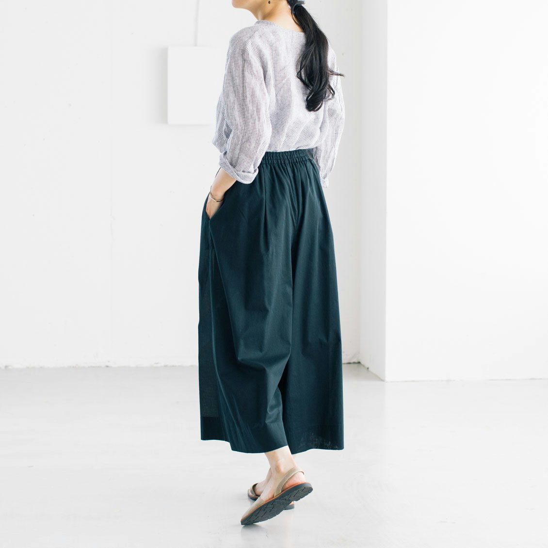 薄手でやわらかな生地を使い、ギャザーを程よく寄せたことで、ウエストはすっきりと、全体はふんわりと軽やかに見えるシルエットに仕上がりました。