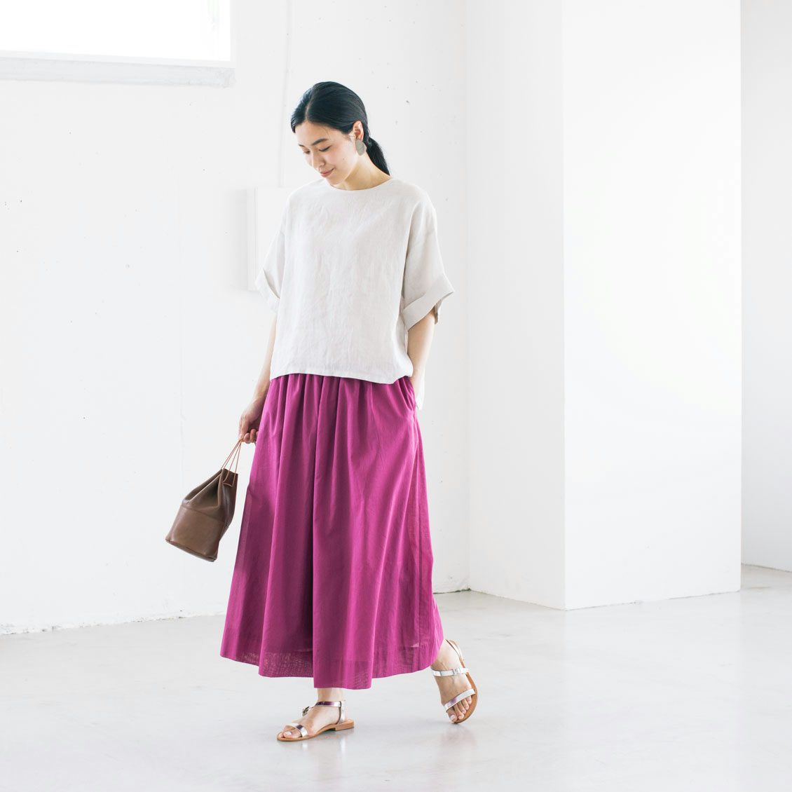 プラムは、夏の気分を上げてくれるような鮮やかな色合い。コーデの主役として、新鮮な気分を取り入れたい時に、特におすすめのカラーです。シンプルなTシャツと合わせても、華やかに着こなせます。