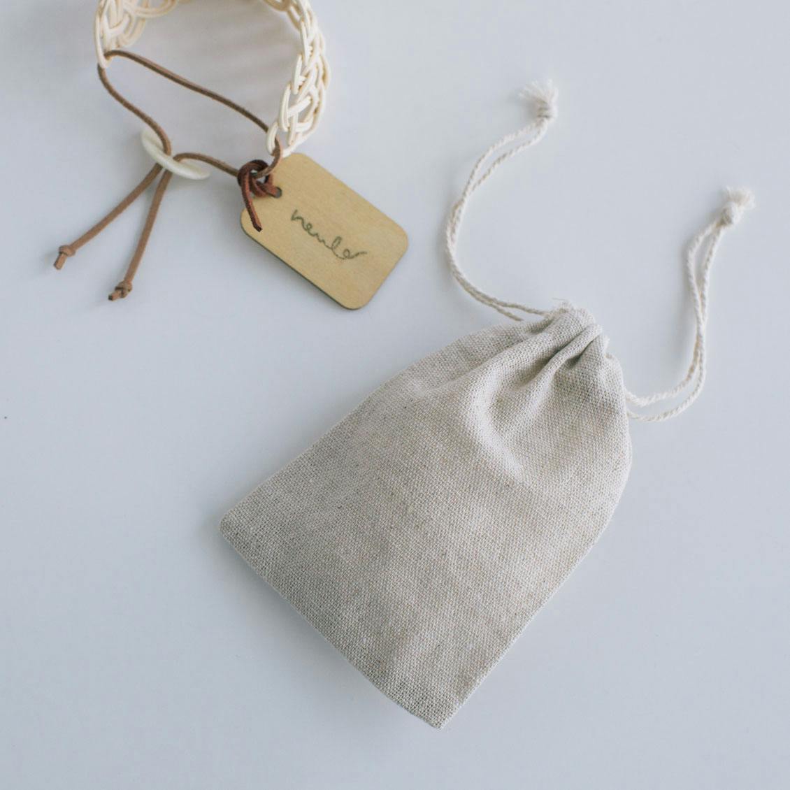 シンプルな生地のミニ巾着袋にいれてお届けします。保管するにも、小物入れにも便利なサイズです。