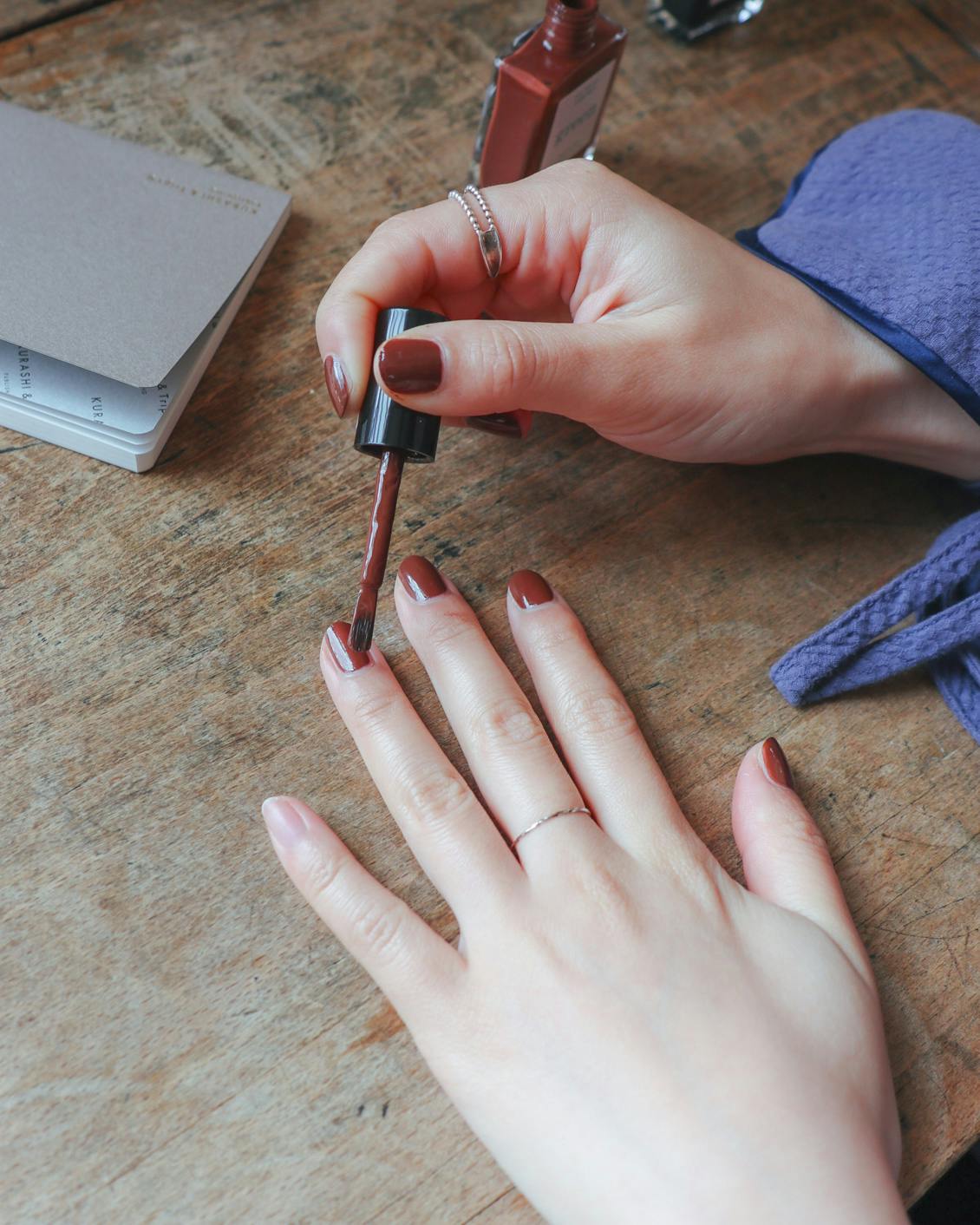 ロイヤルブルーなどが混じり合うグレイッシュピンクなので、手元がシックな雰囲気に。