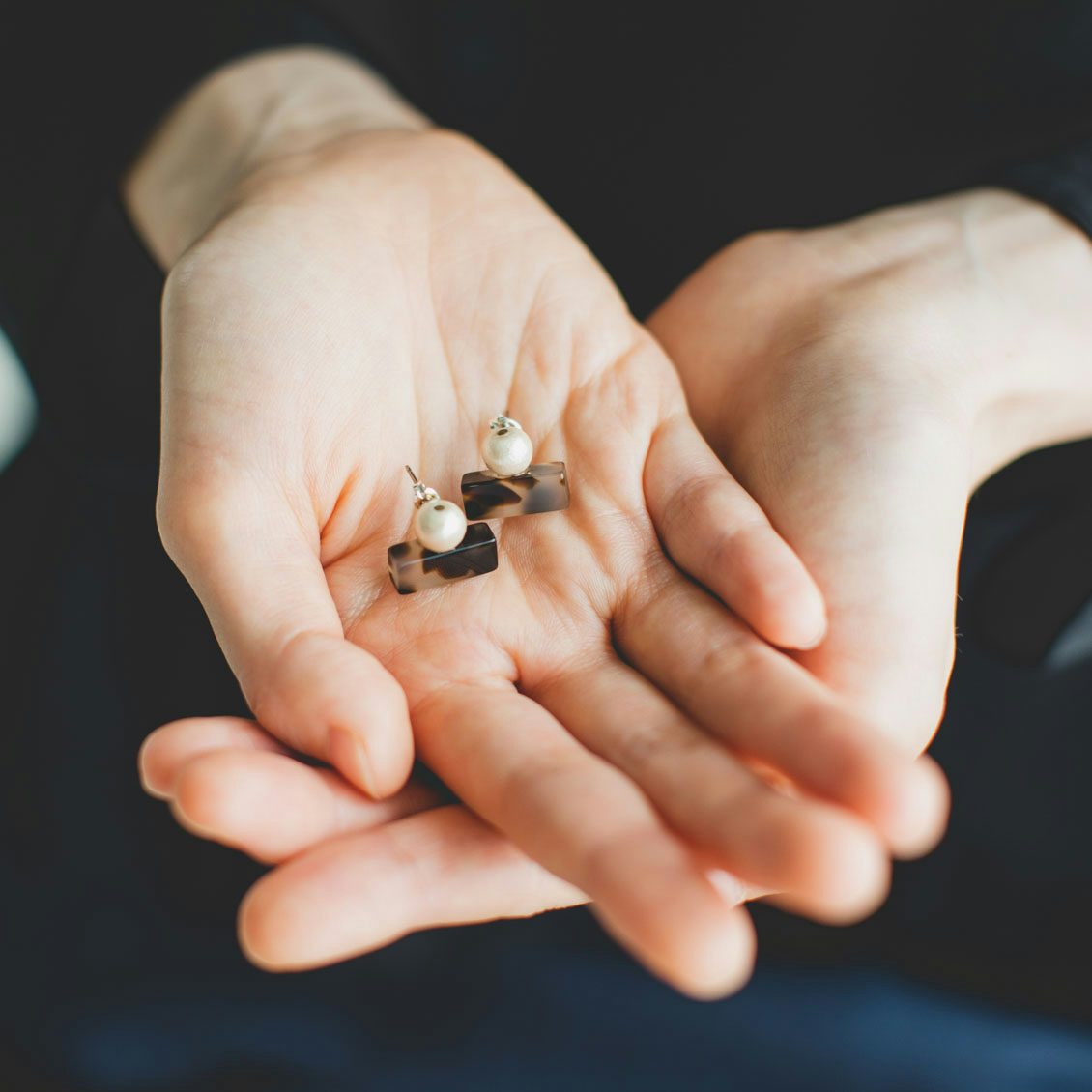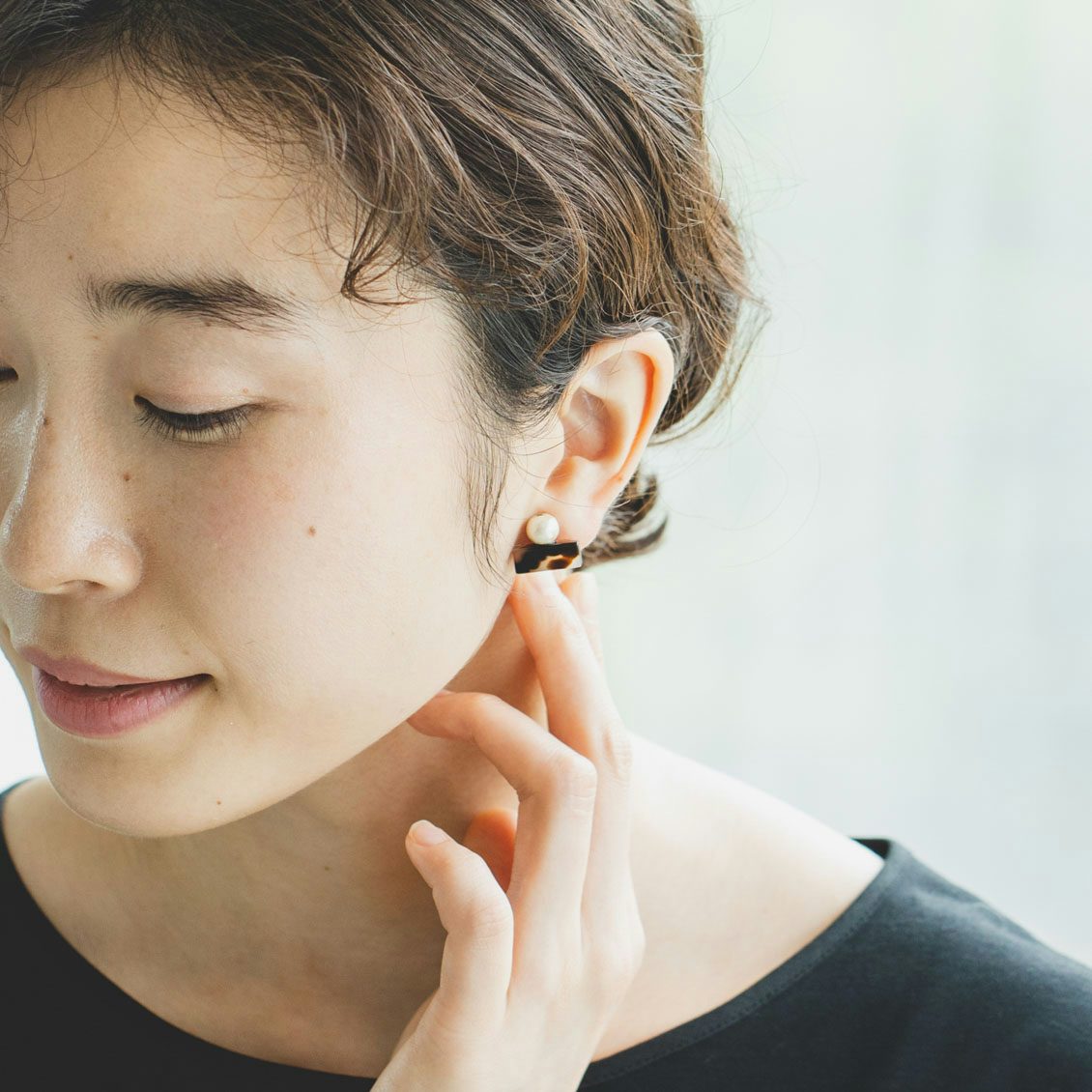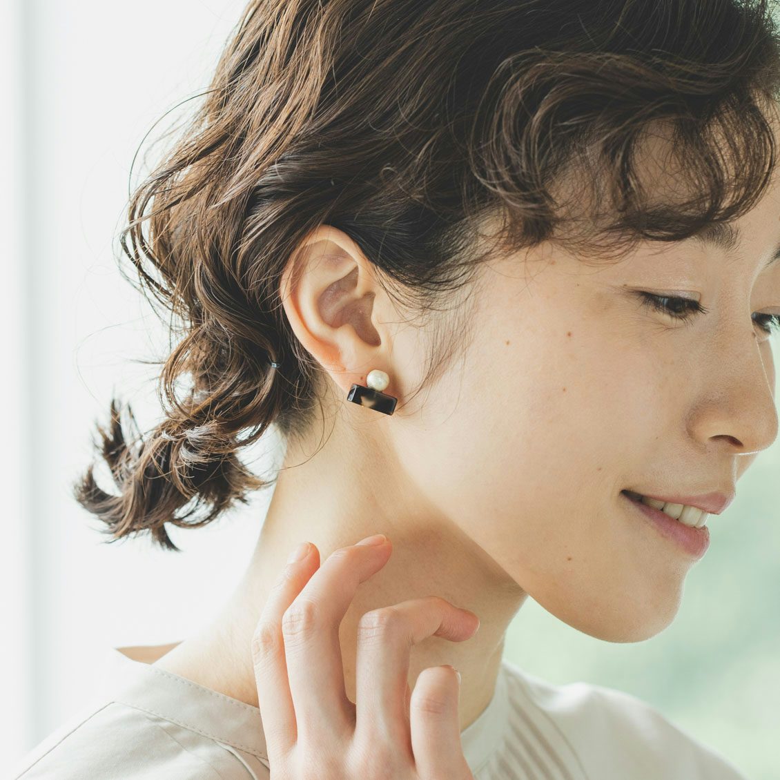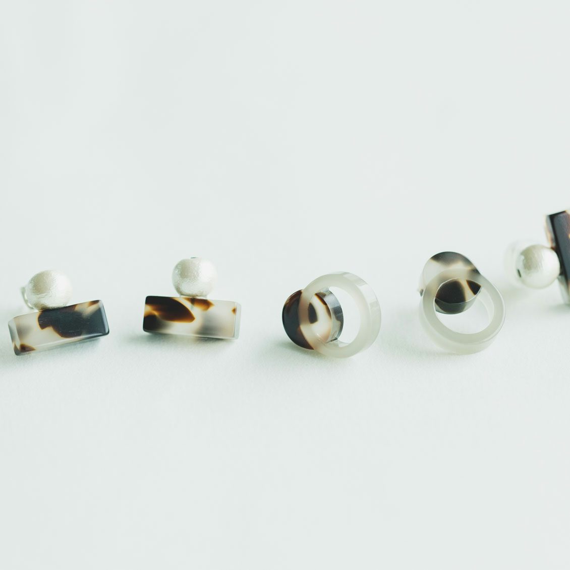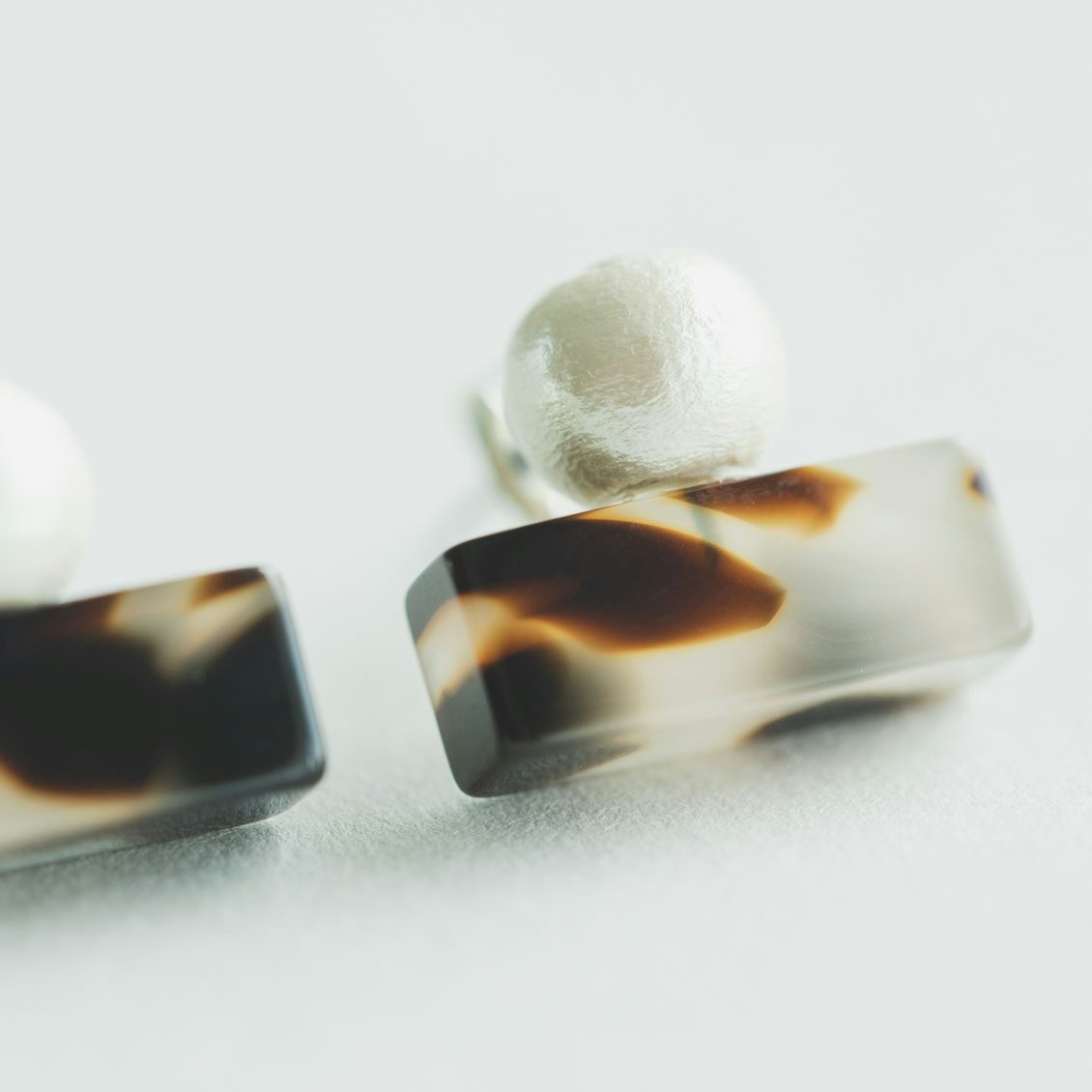 透明感あるライトグレーとブラウンのべっ甲もようは、耳元のさりげないアクセントに。