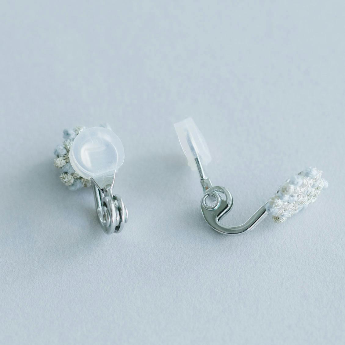 イヤリングは、着脱のしやすいクリップ式。留め具はシリコンキャッチ付きで、耳たぶへのあたりがソフトです。金具は真鍮にニッケルフリーのメッキを施しています。▲イヤリング装着時