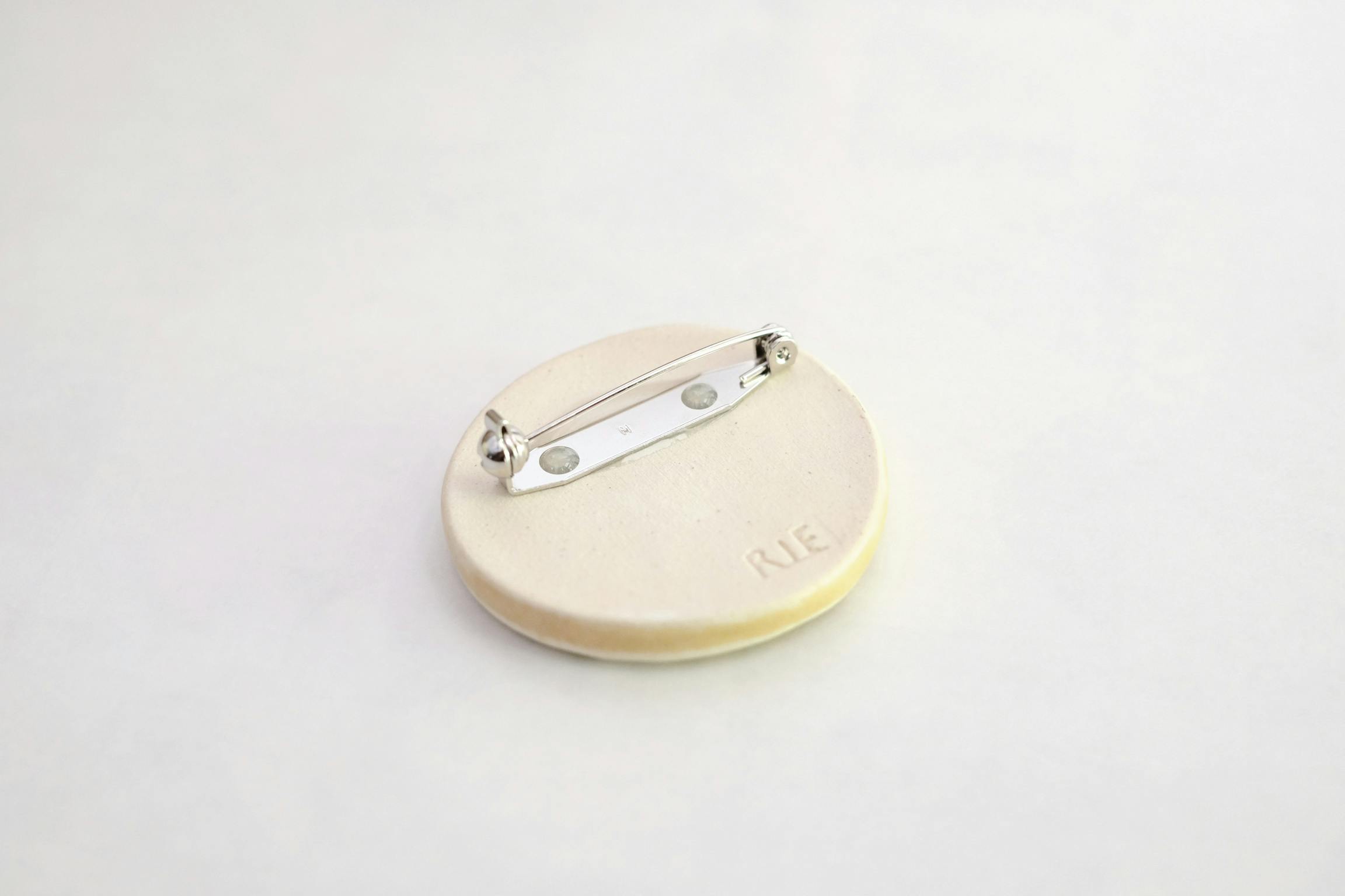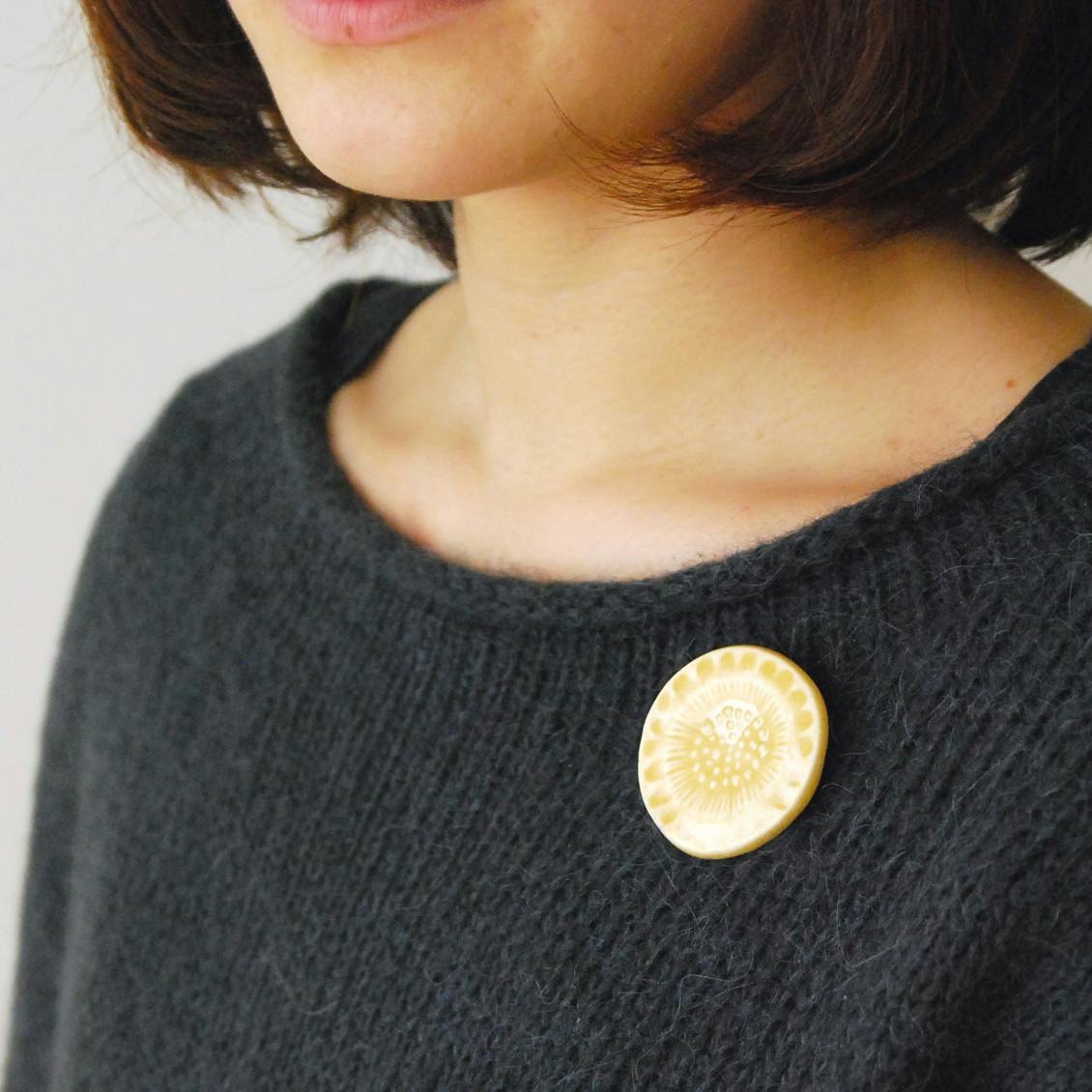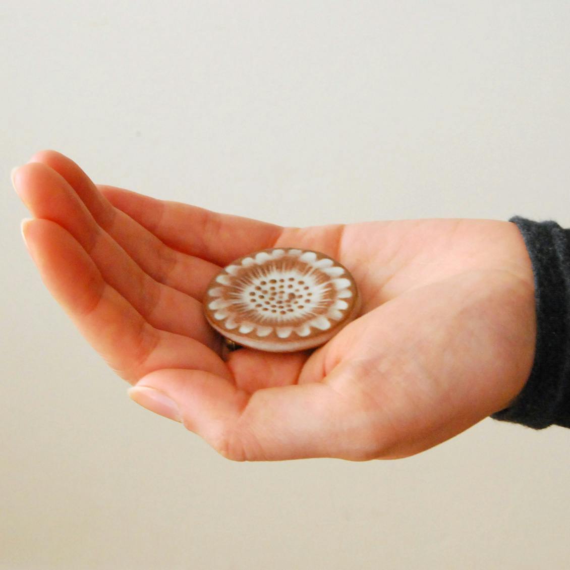 こちらの「花のブローチ」は、 丸い花の花びらやめしべなどが釉薬の色と陶器の色で彩られています。