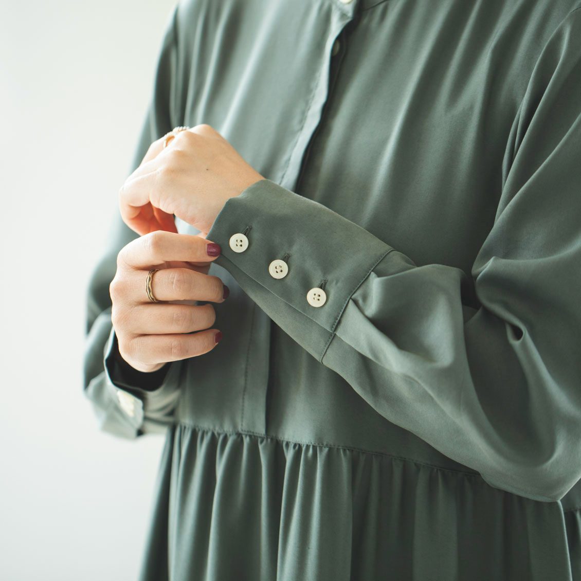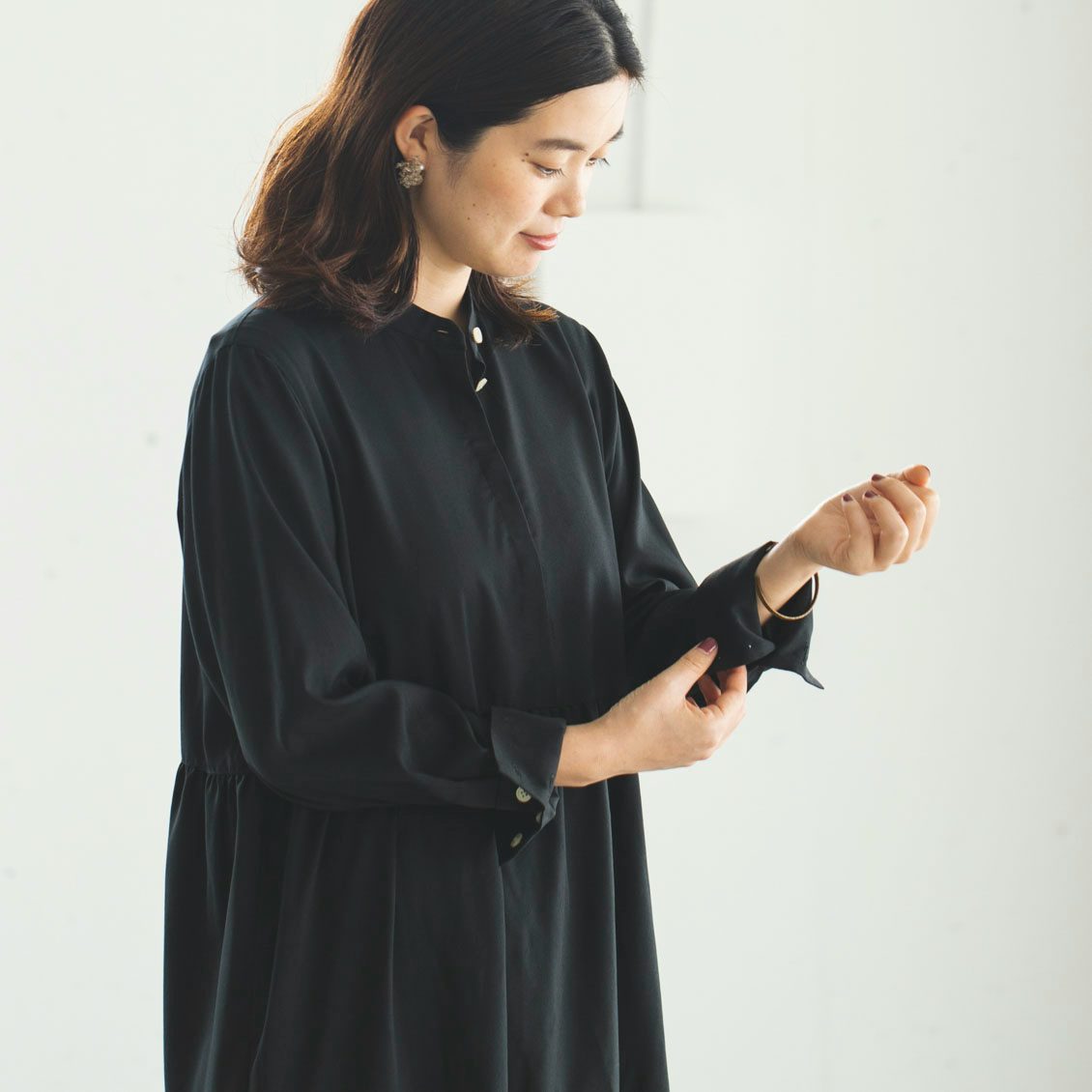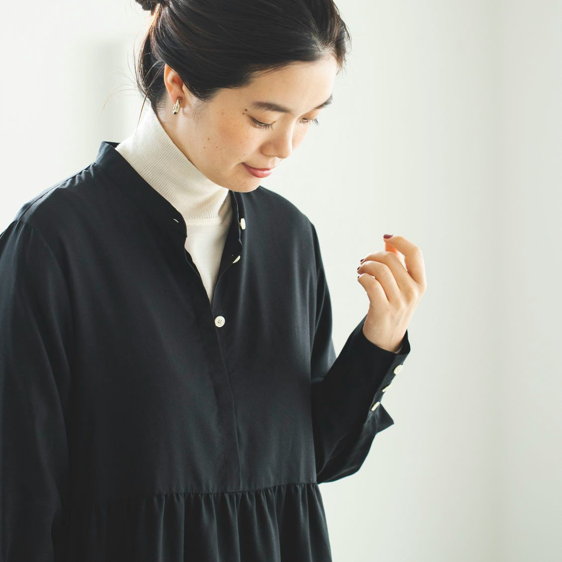 首元は襟のない「バンドカラー」で、かしこまりすぎずやわらかな印象に。