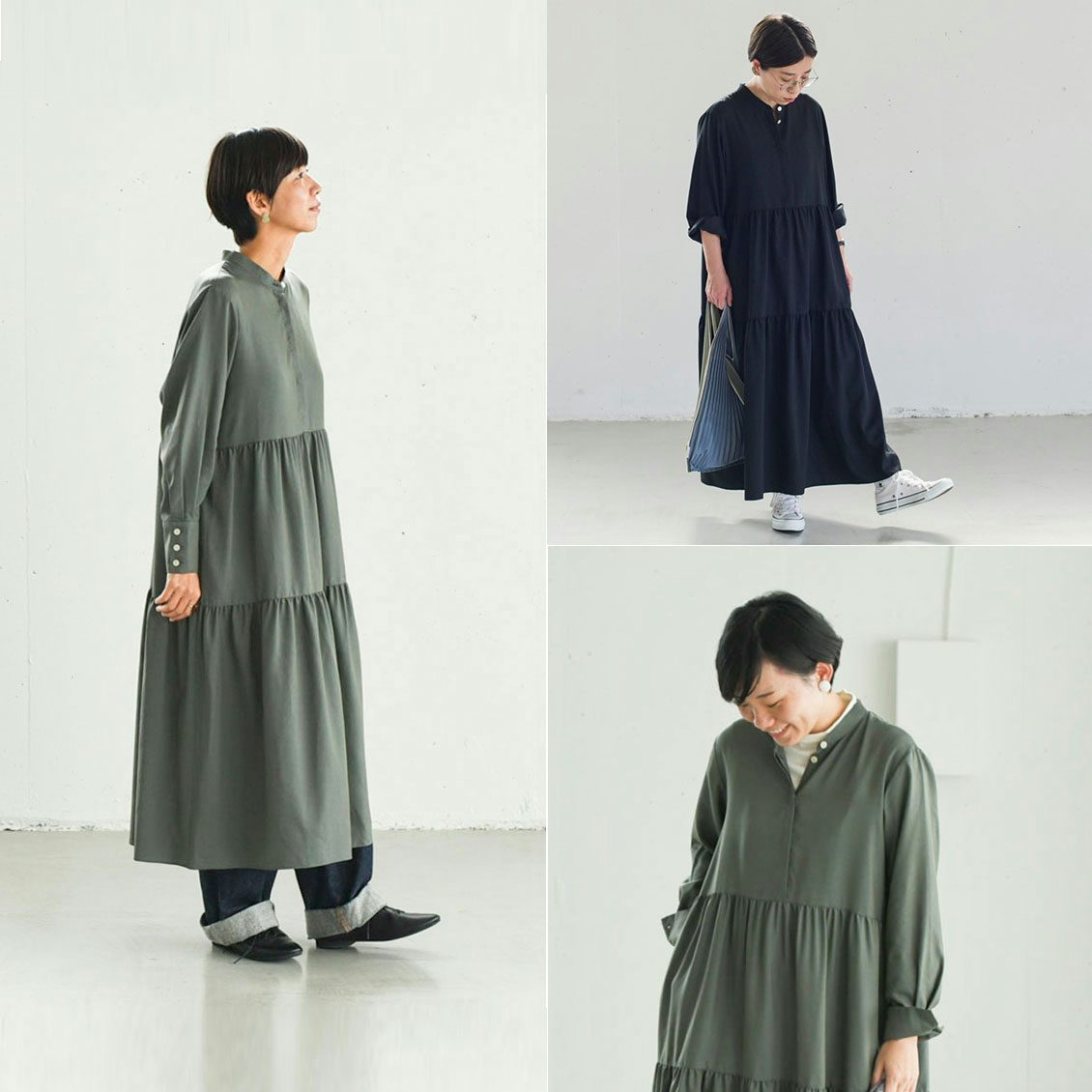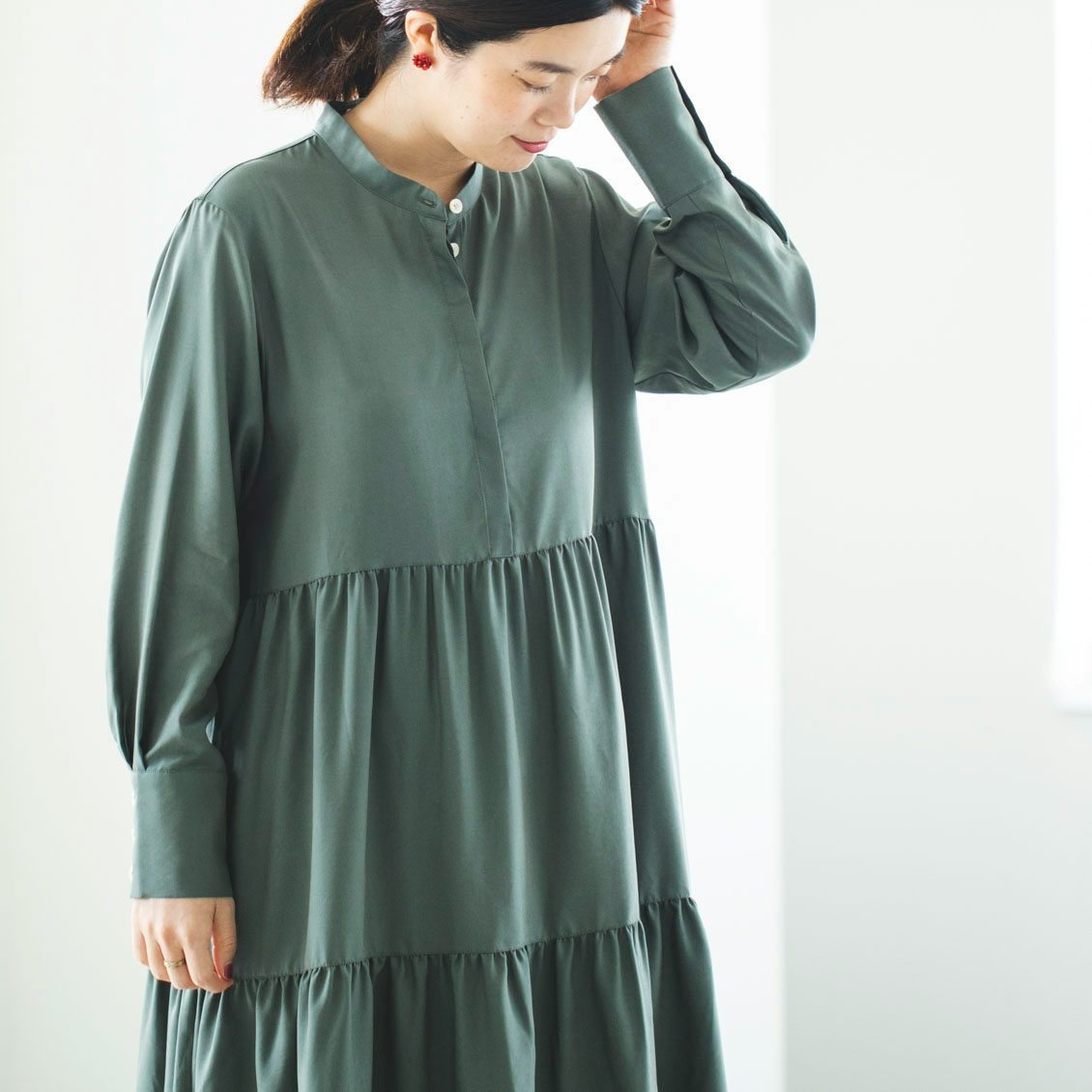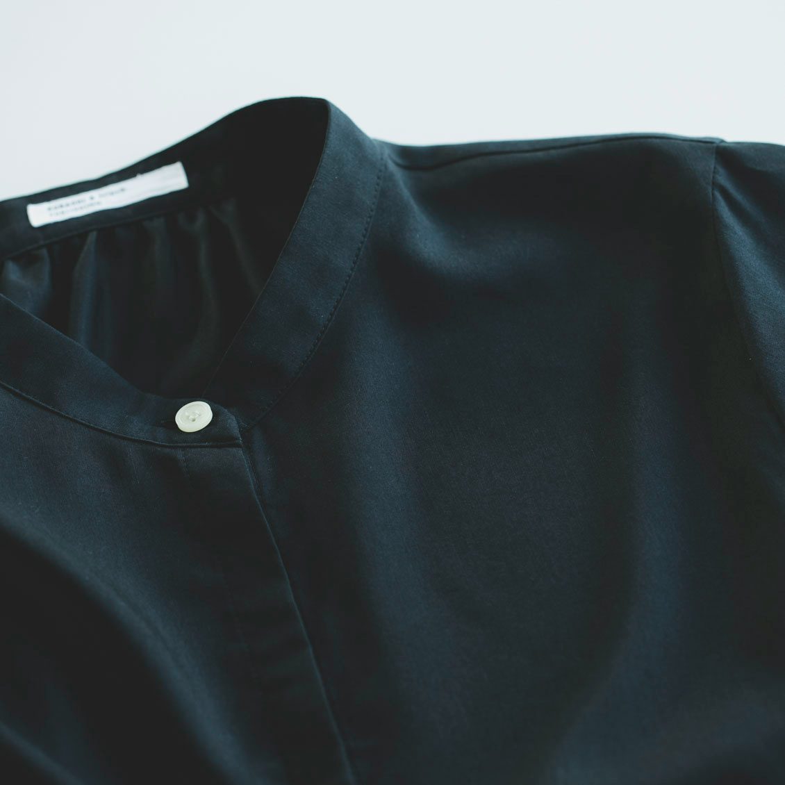 首元は襟のない「バンドカラー」で、かしこまりすぎずやわらかな印象に。