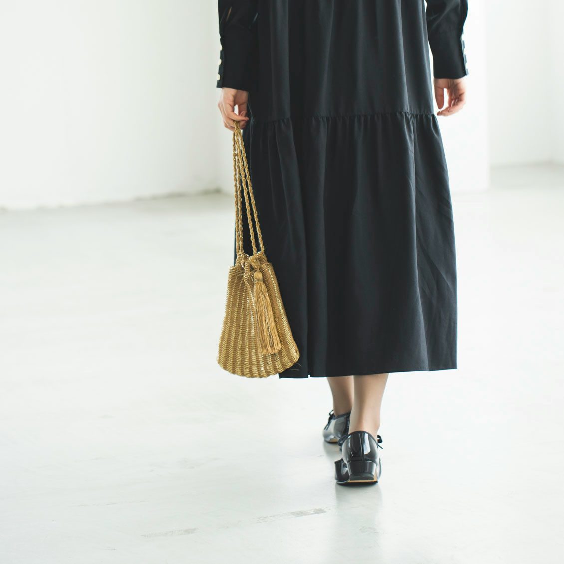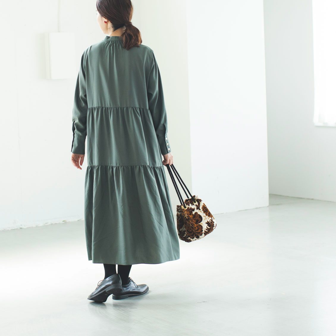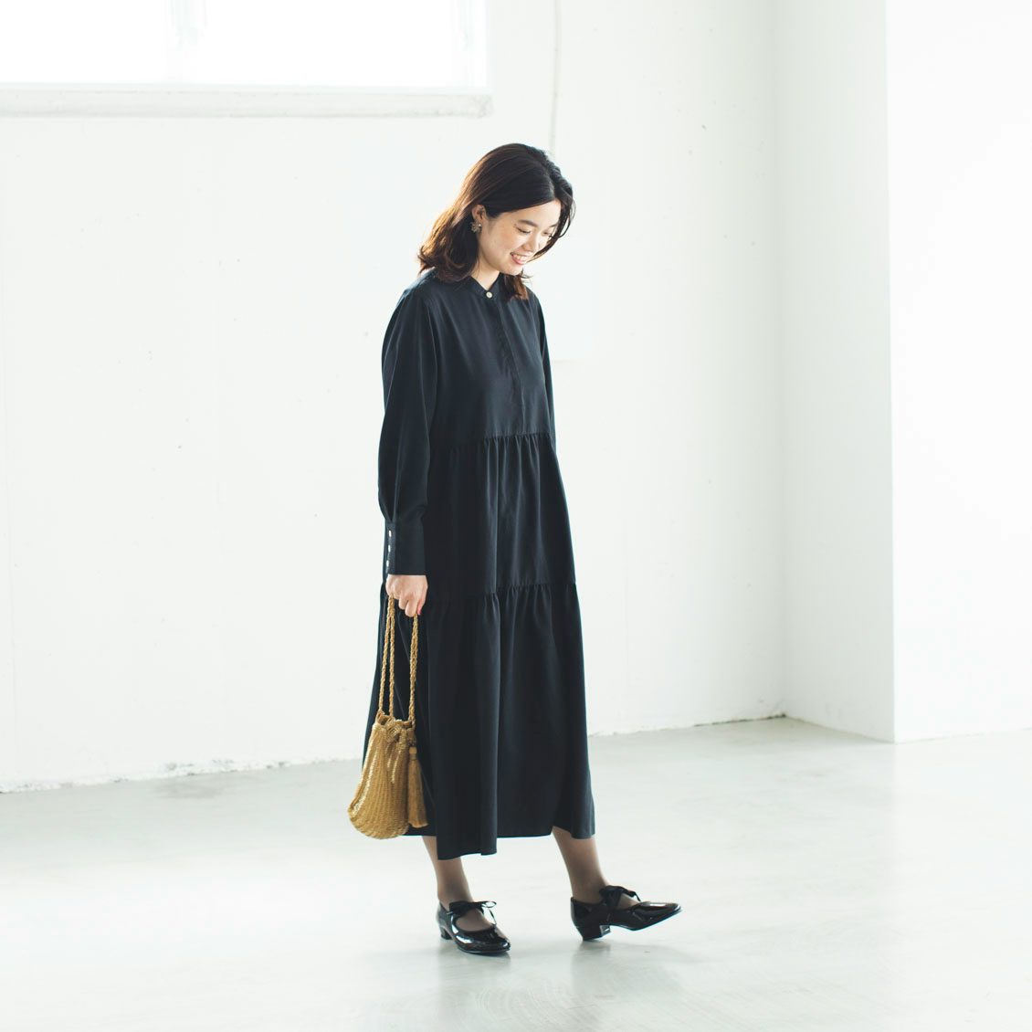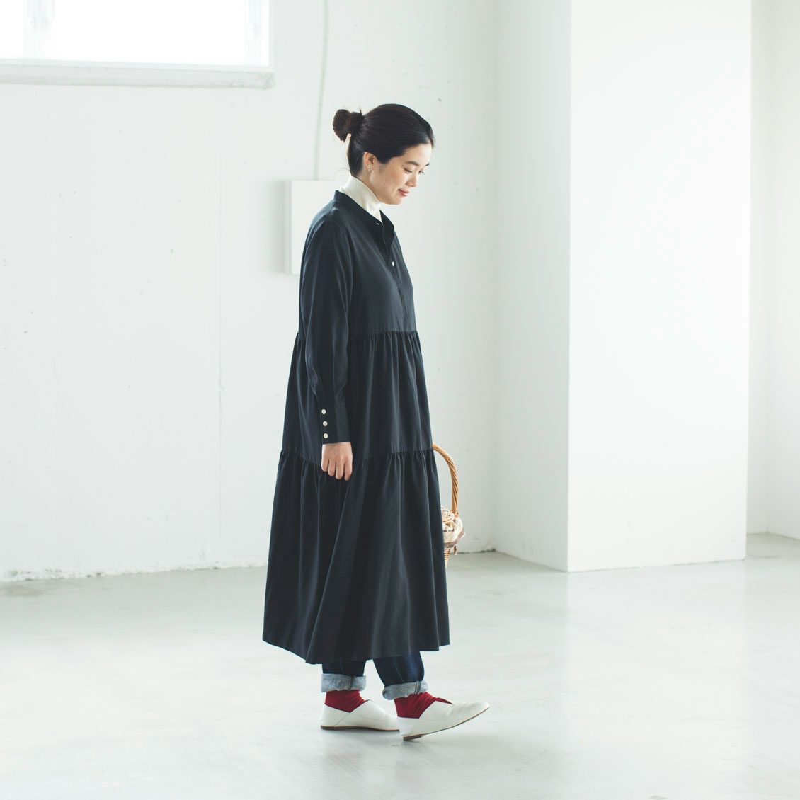 一見甘いイメージのティアードですが、ギャザーを低めの位置にあしらったことで、ぐっとシックな雰囲気に。