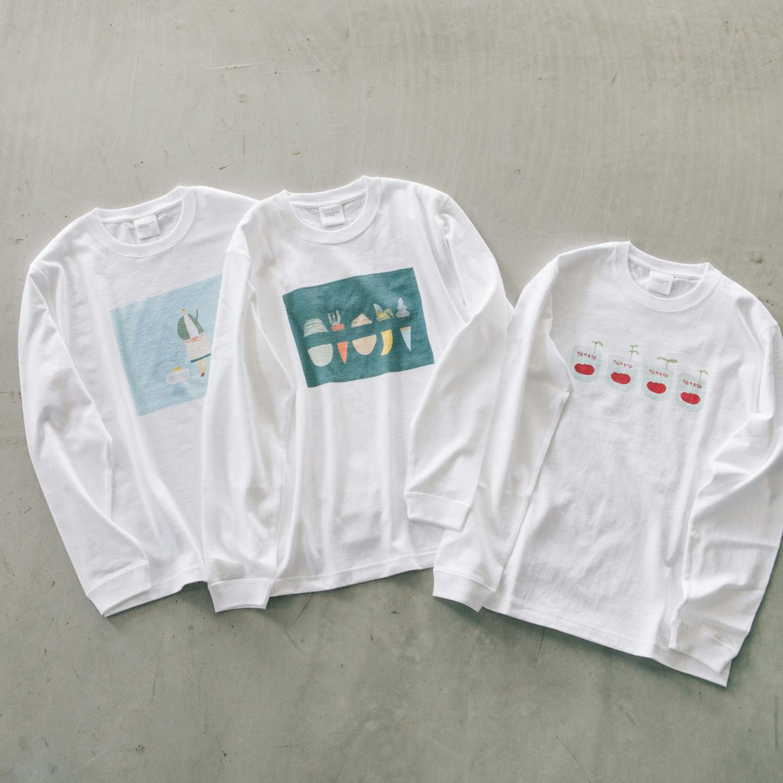 使い切った空き瓶や缶を洗って、小さなグリーンを育てたり、切り花を活けたり。そんな経験ありませんか? このTシャツには、そんな鮮やかなトマト缶が4つ。