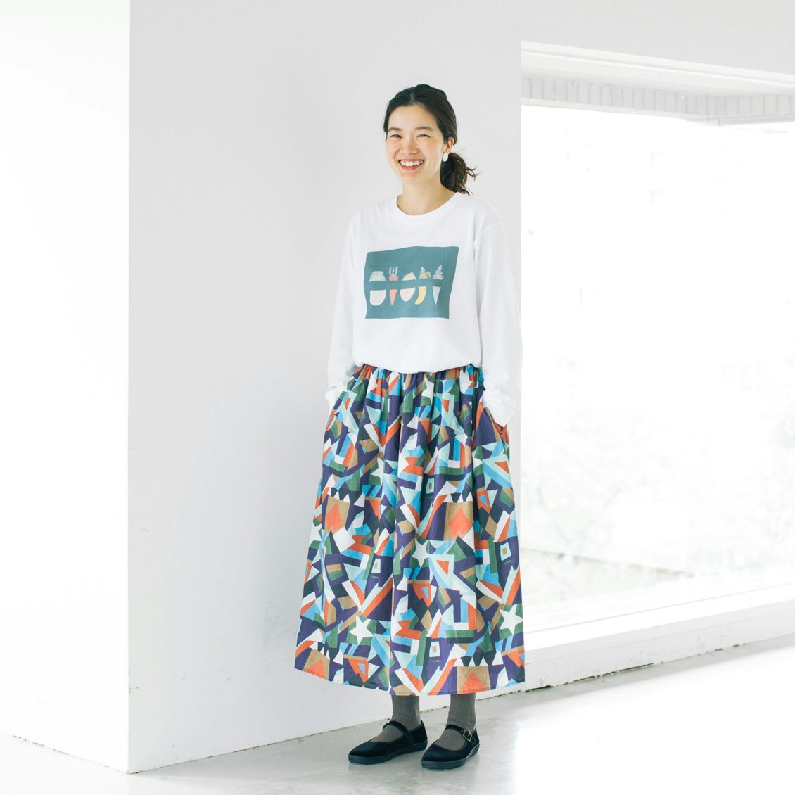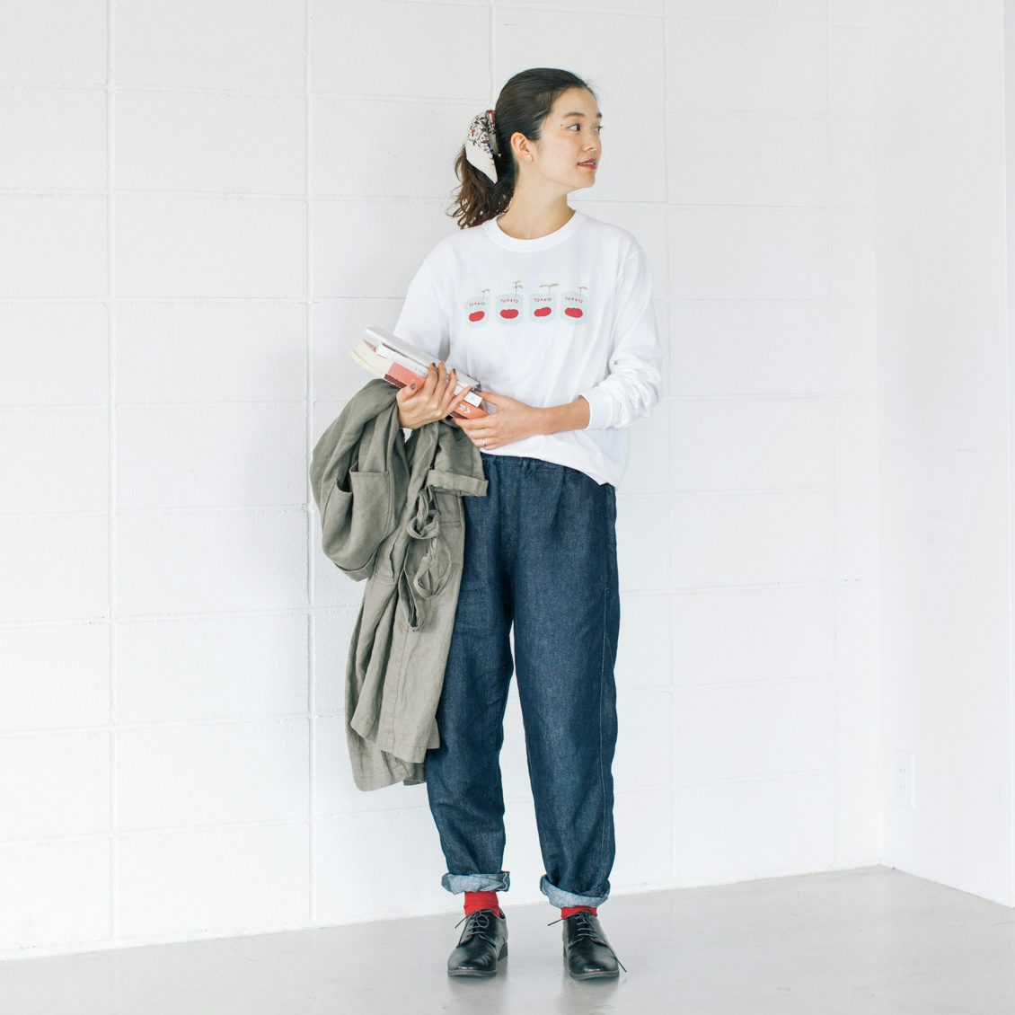 柔らかな生地感と体のラインを拾わないゆったりサイズなので、スカートにインしたり、ラフなデニムに合わせたり……いろいろなボトムスに合わせてみていただきたいです。