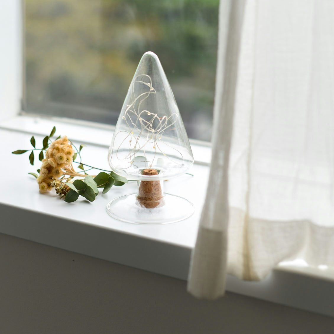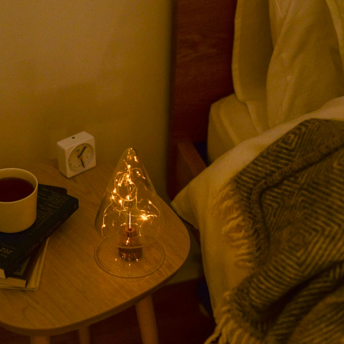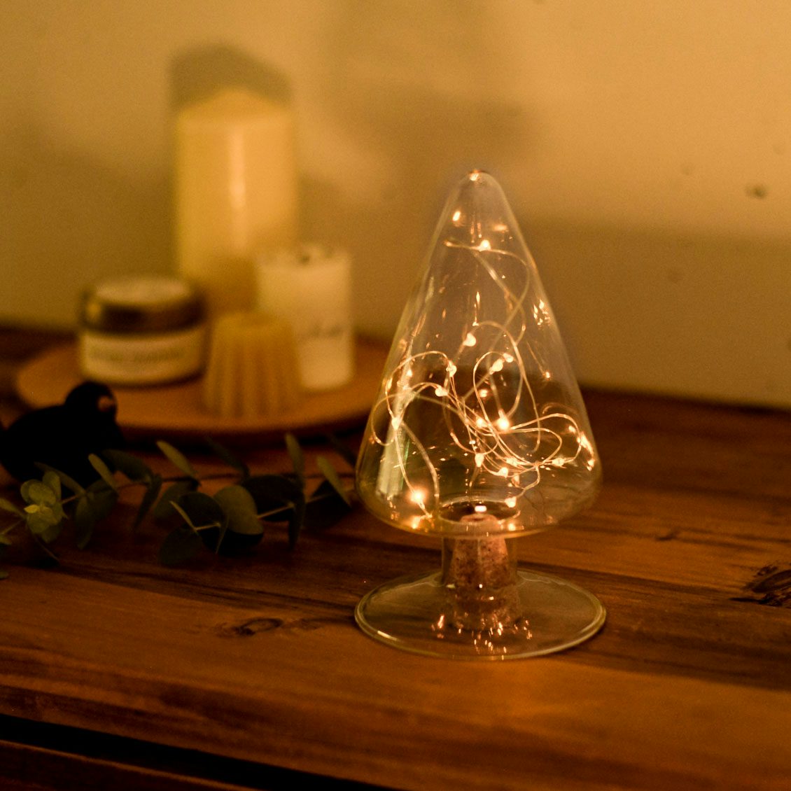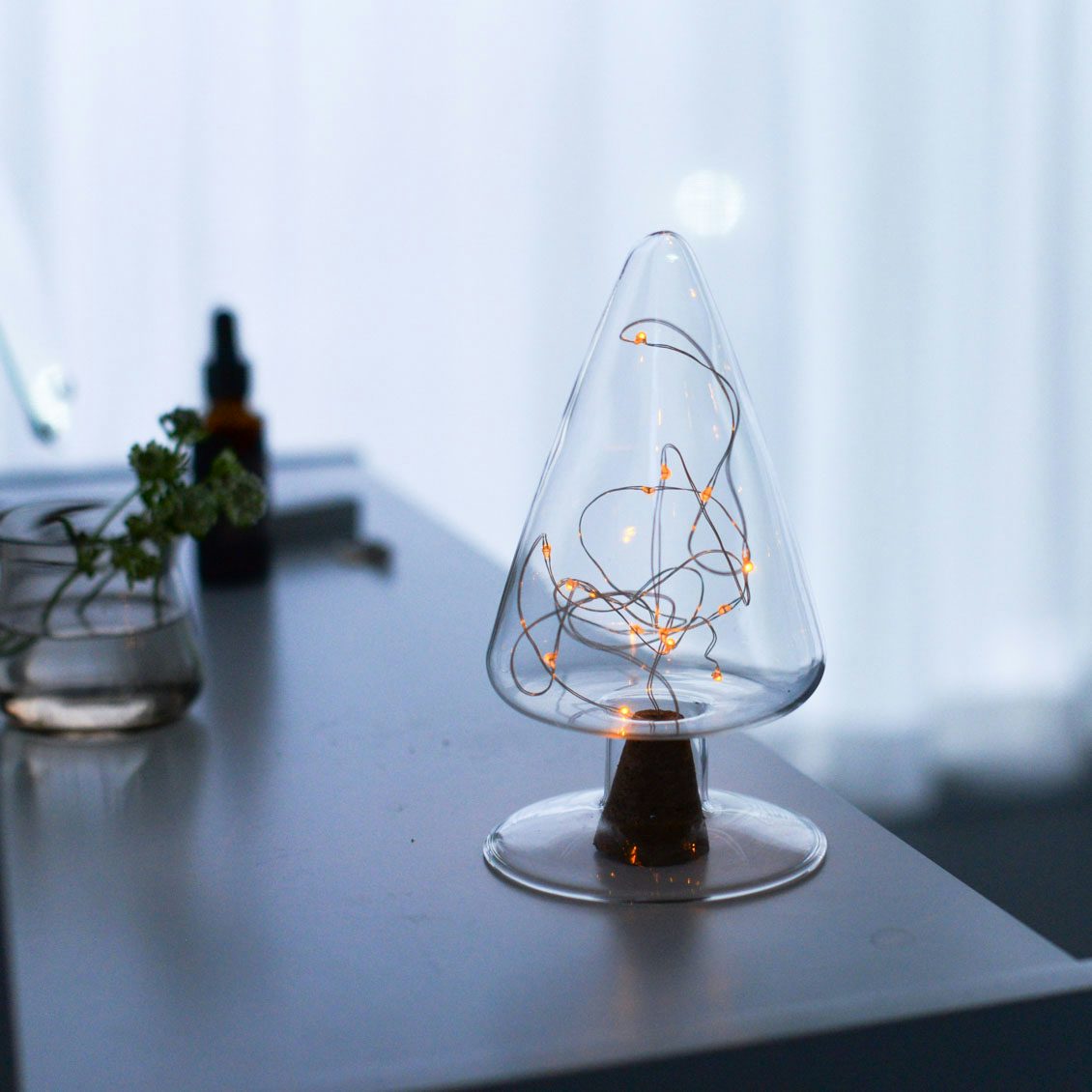 ツリーみたいな形にきゅんとする、ガラスのオブジェ。中には、心が和むオレンジ色のLEDライトが入っています。