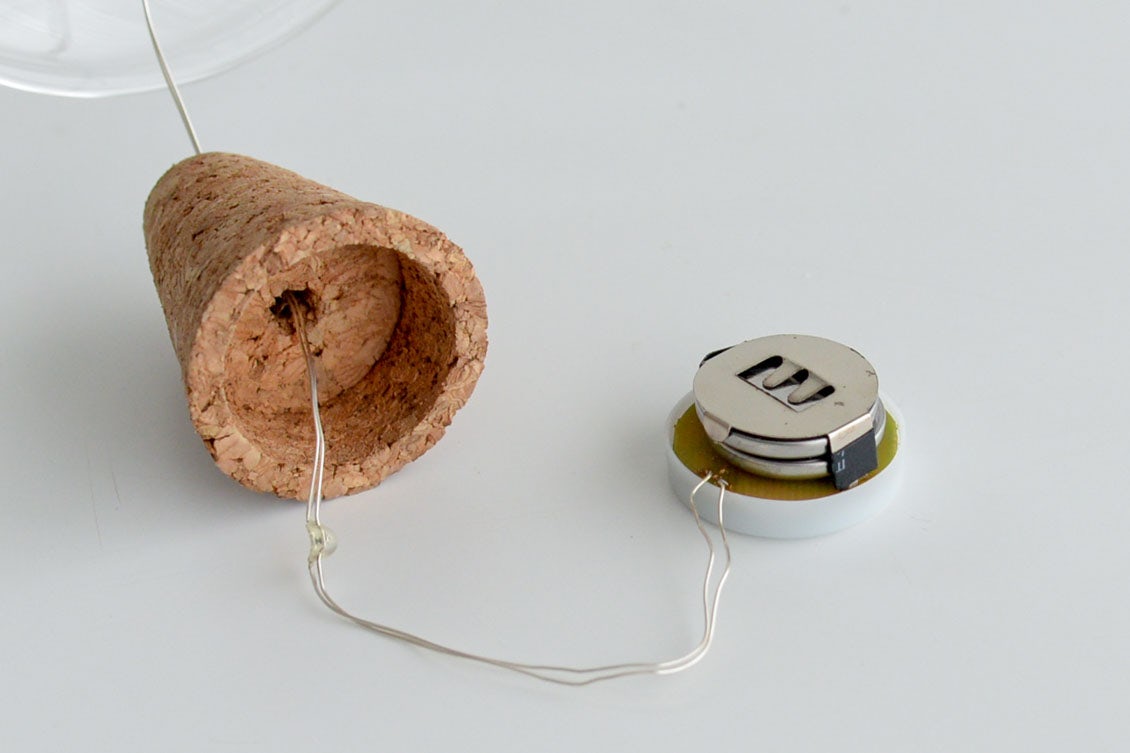 ▲コルクの裏にスイッチが埋め込まれており、真ん中を押すと点灯します