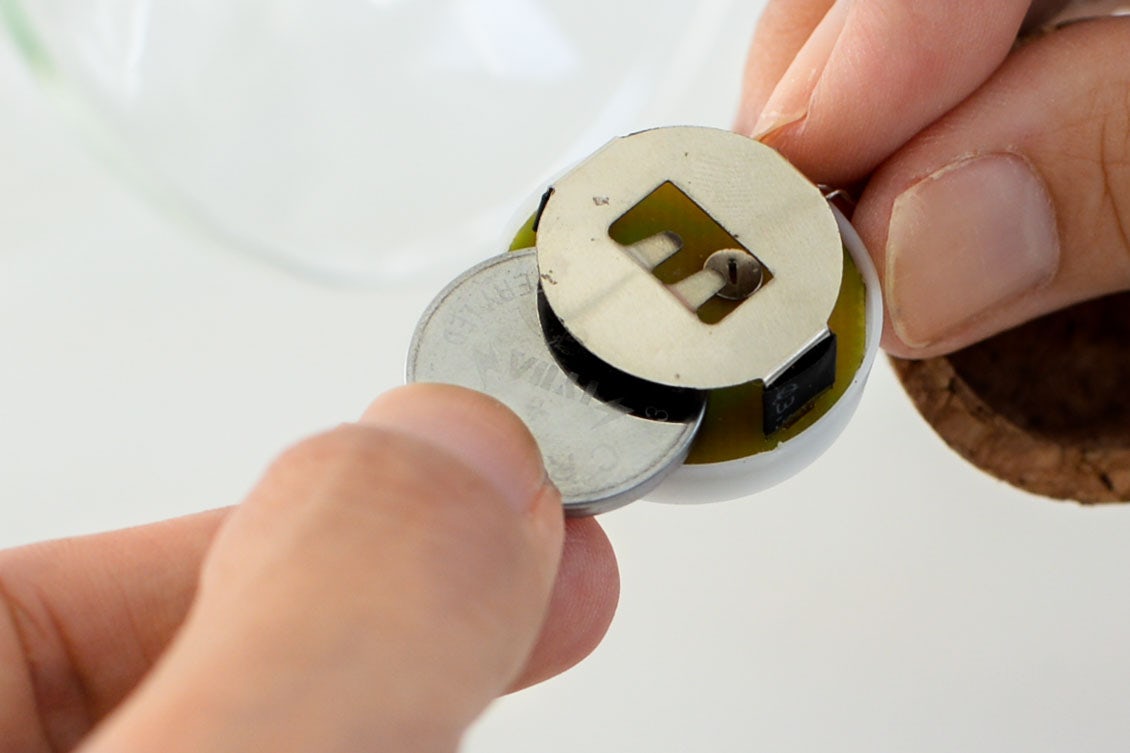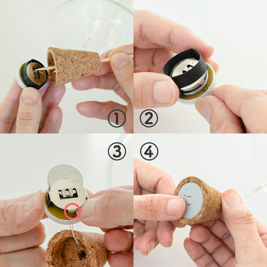 お届けの時点で、コルクのキャップの中のスイッチ部分に、LEDライトの電池が2枚内臓されています。