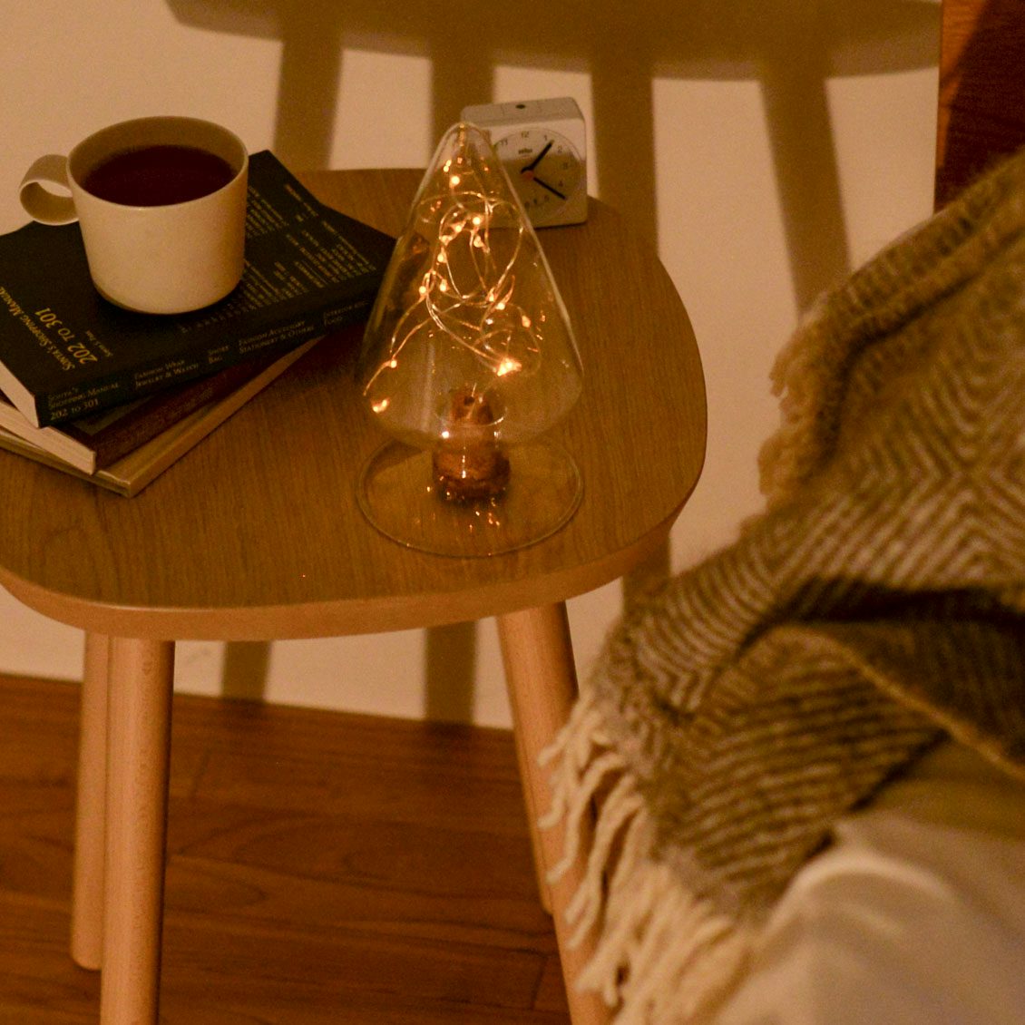 中に入っているのは、星屑のようなライト。可憐なきらめきは、見るたびにときめいてしまいます。透明感のきれいな佇まいで、灯りをつけなくても素敵です。