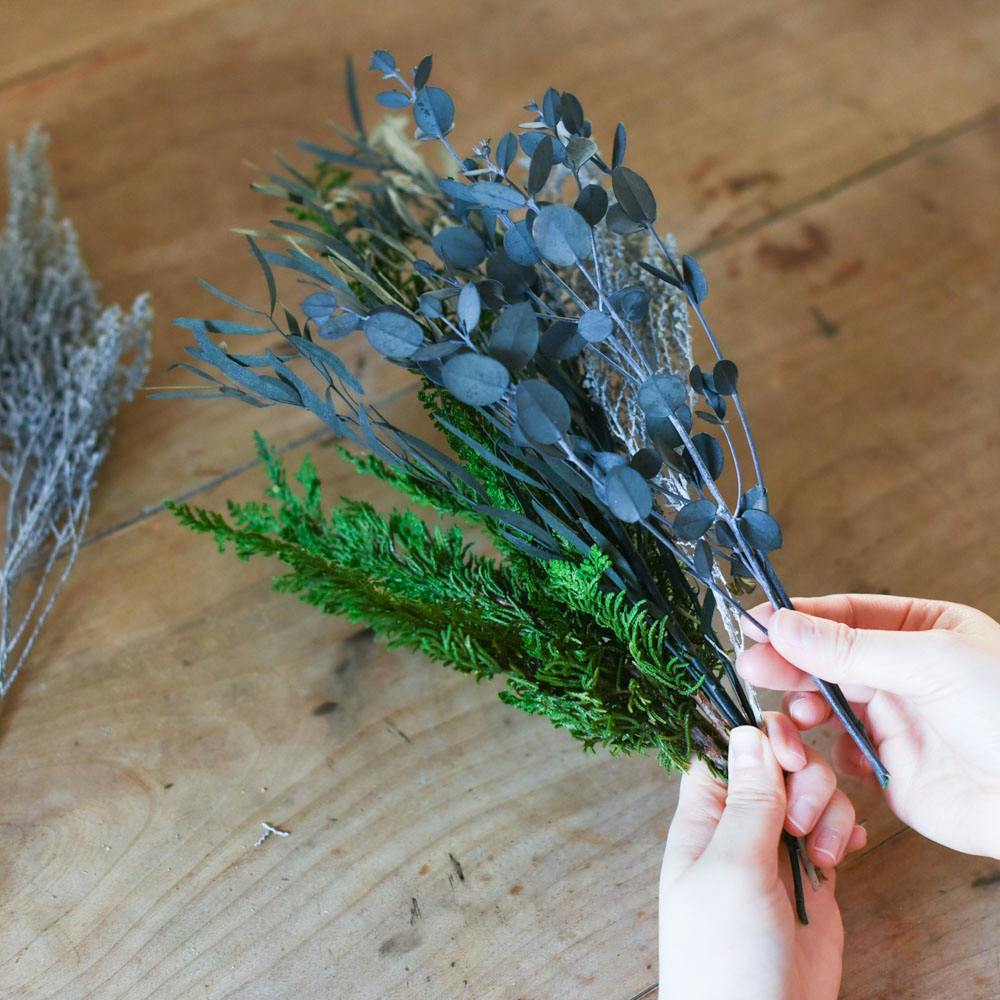 | 素材 | 【花材】ソフトクジャクヒバ、ユーカリ・ニコリ、グニユーカリ、ソフトストーベ、紅花、ラグラス、スターコーン、ペッパーベリー、松かさ、べールナッツ 【その他同梱物】ワイヤー、グリーンのリボン、カード 【パッケージ】ボール紙 |