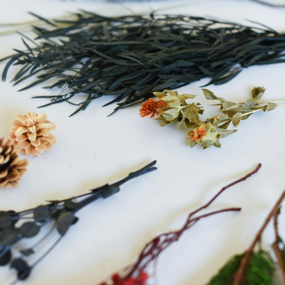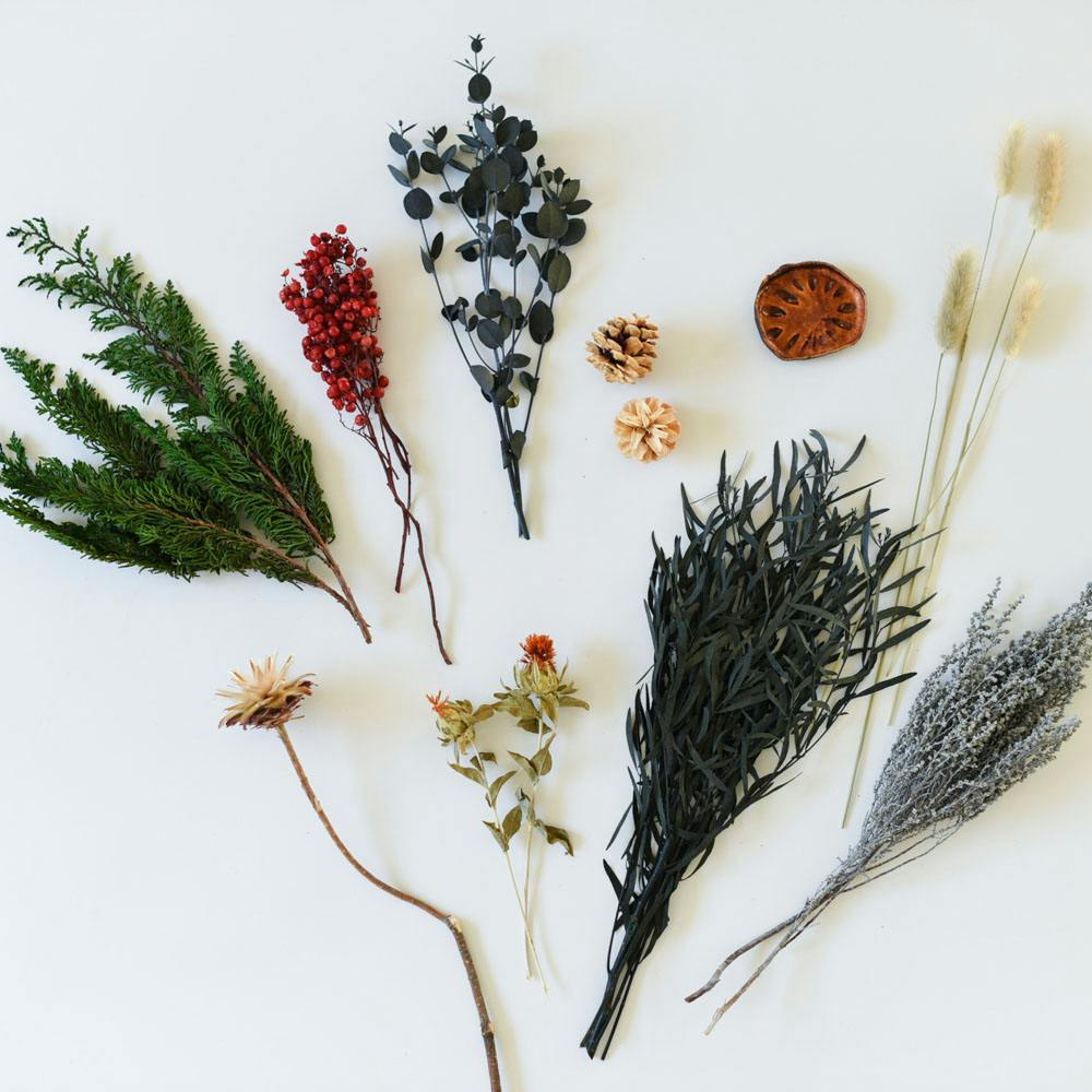 写真左から時計回りに、ソフトクジャクヒバ、ペッパーベリー、グニユーカリ、松かさ、べールナッツ、ラグラス、ソフトストーベ、ユーカリ・ニコリ、紅花、スターコーンと全10種類の花材です。