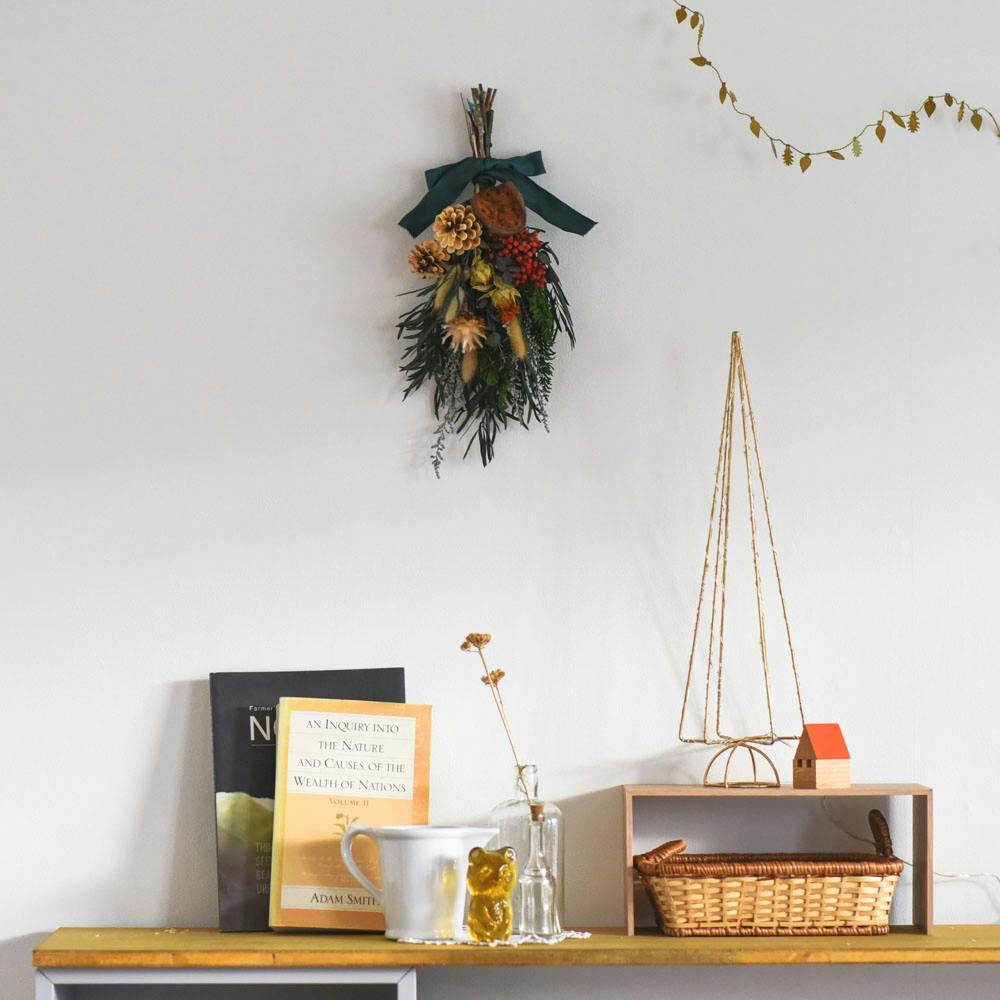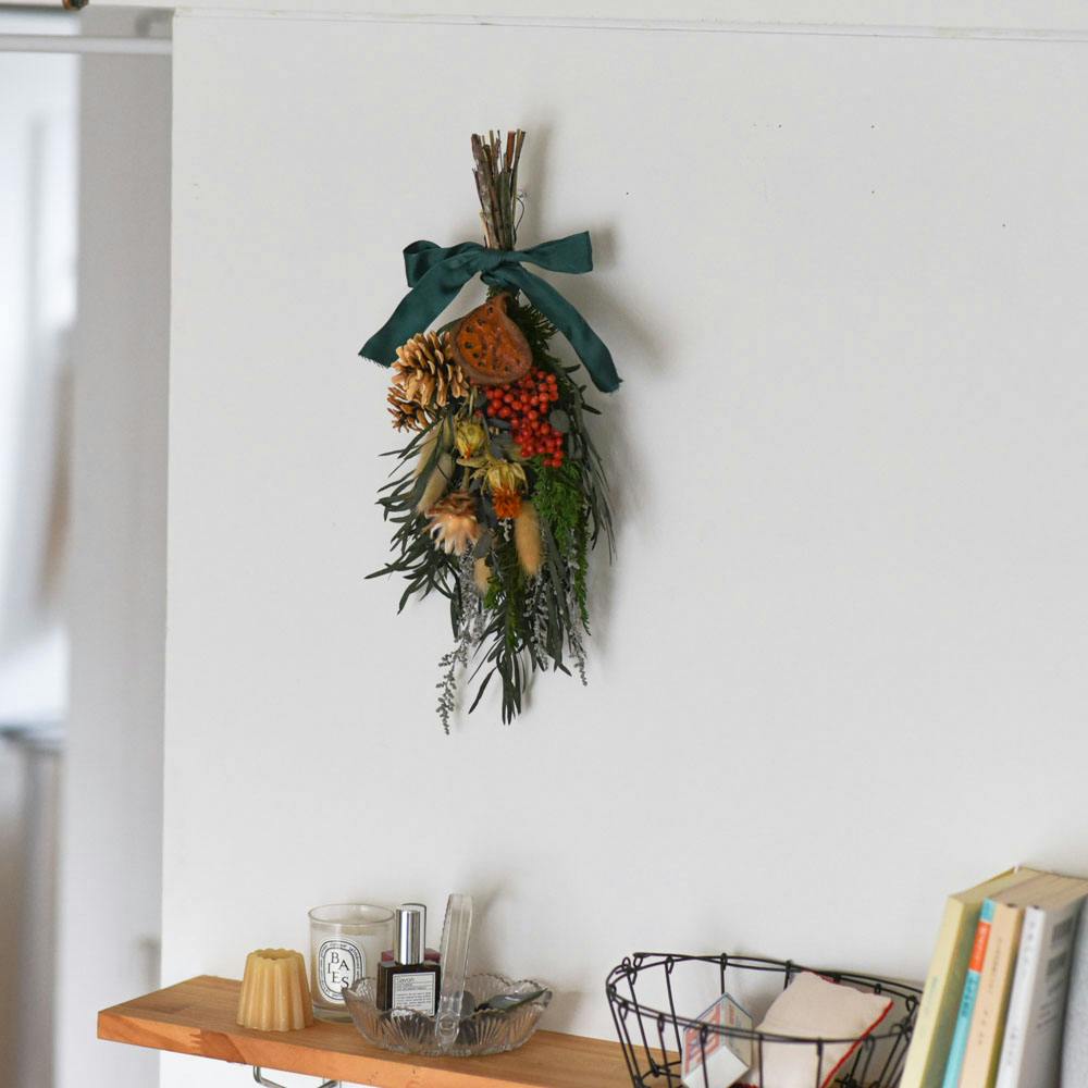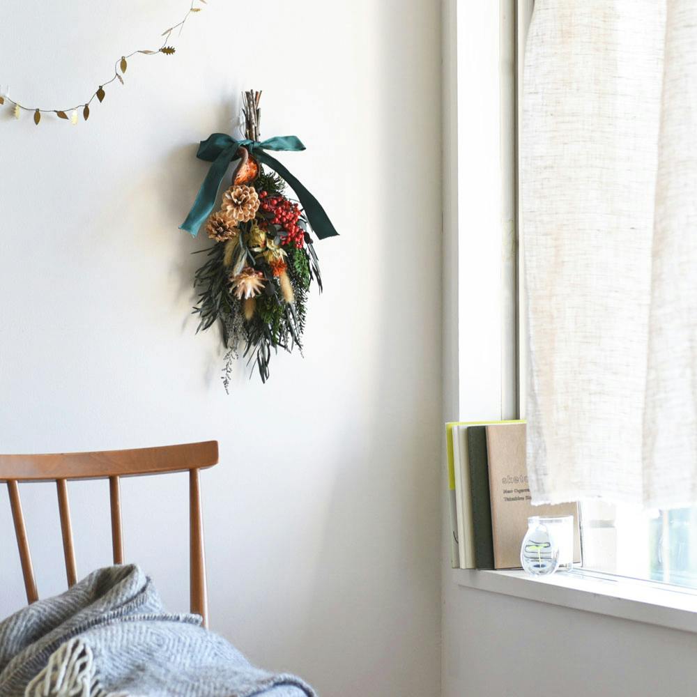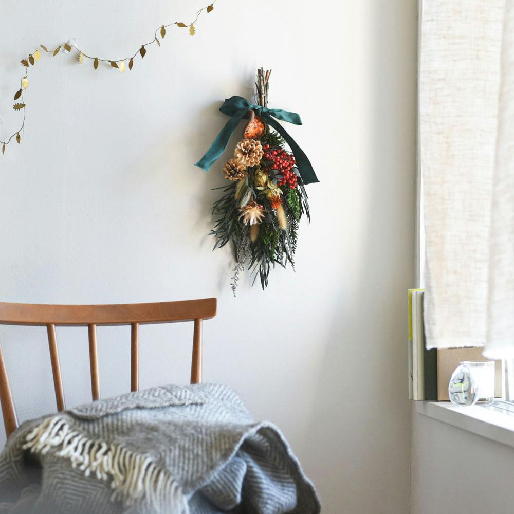 お好みで花材を束ねてリボンで巻くだけ。壁のインテリアが華やいで、クリスマスが待ち遠しくなります。